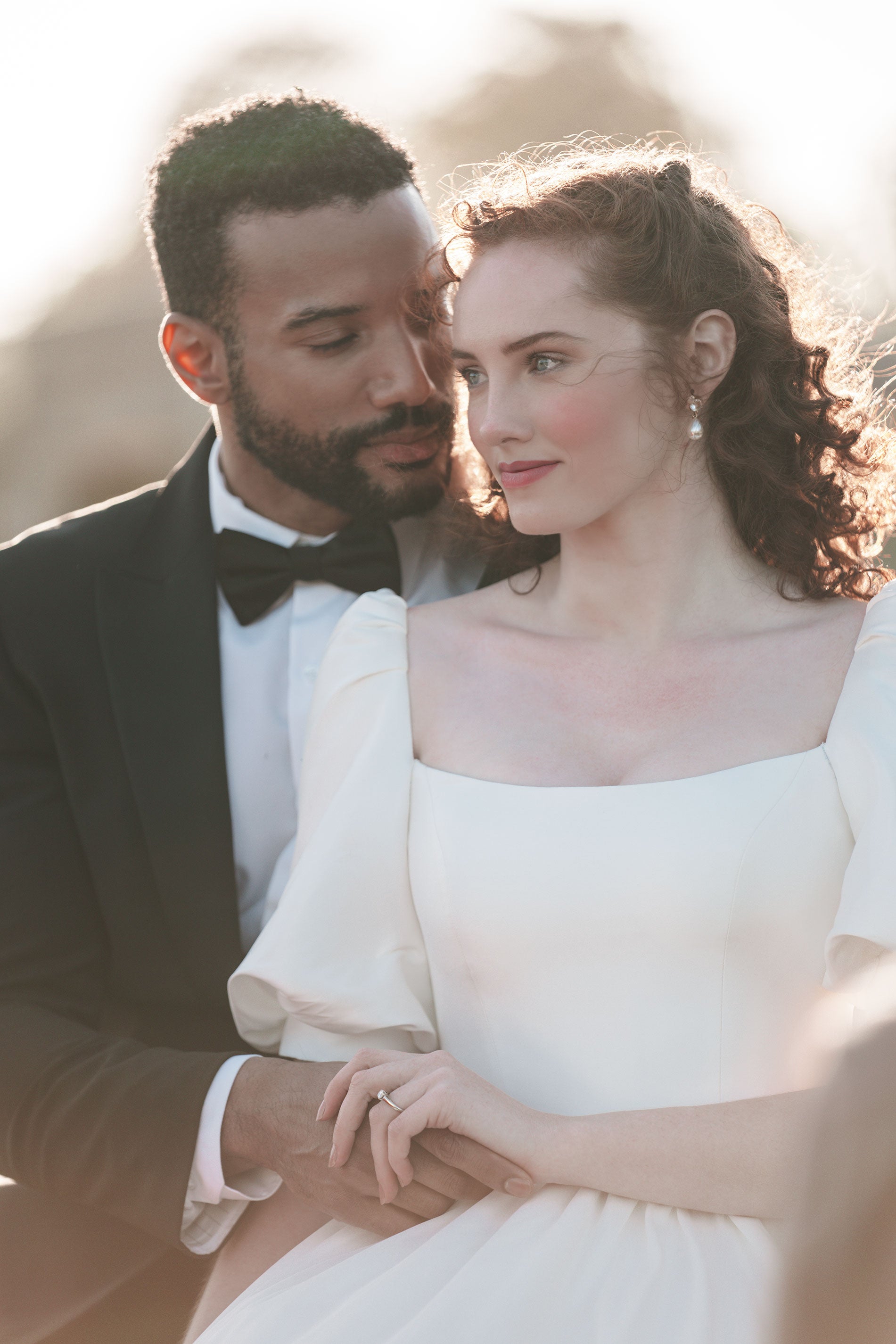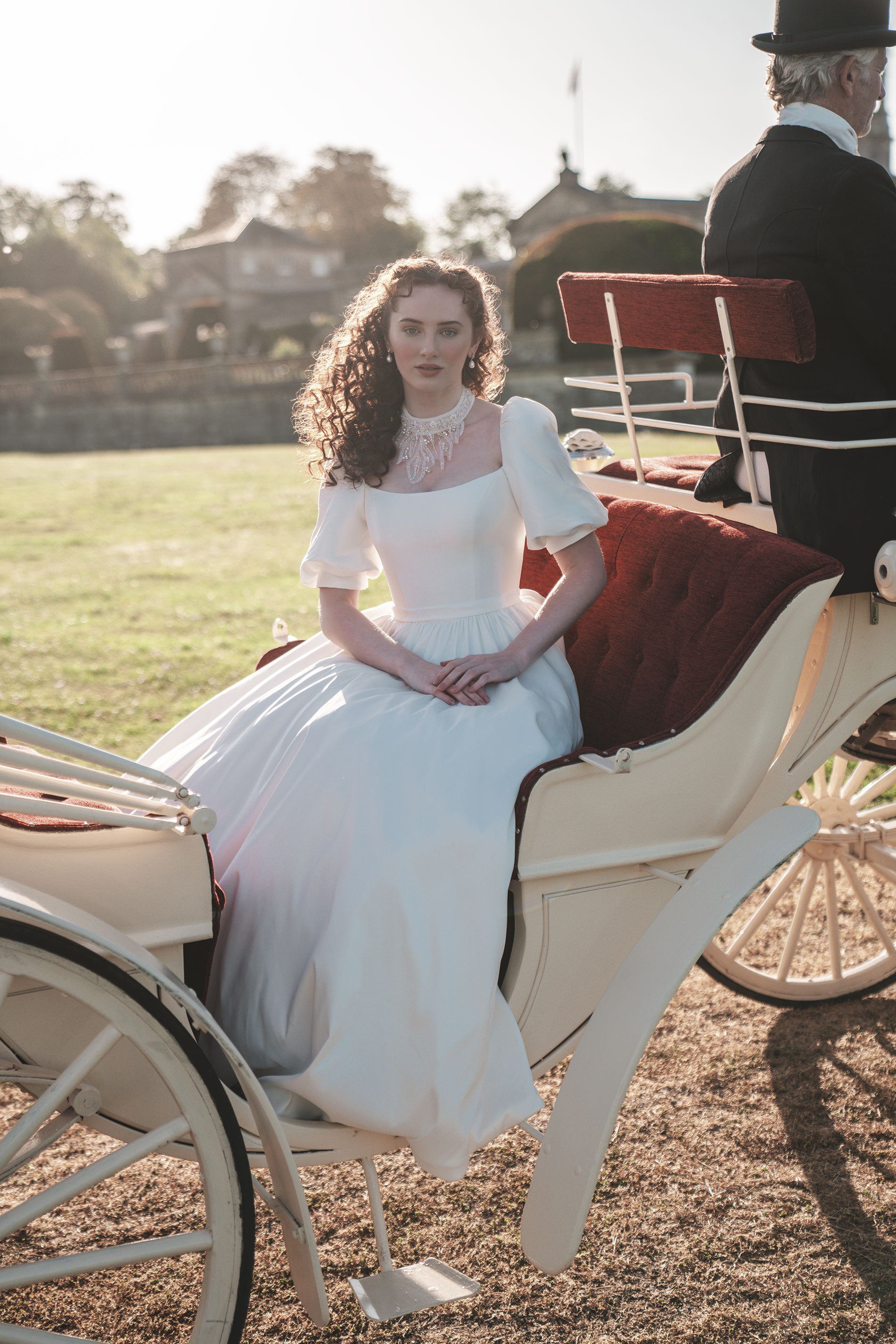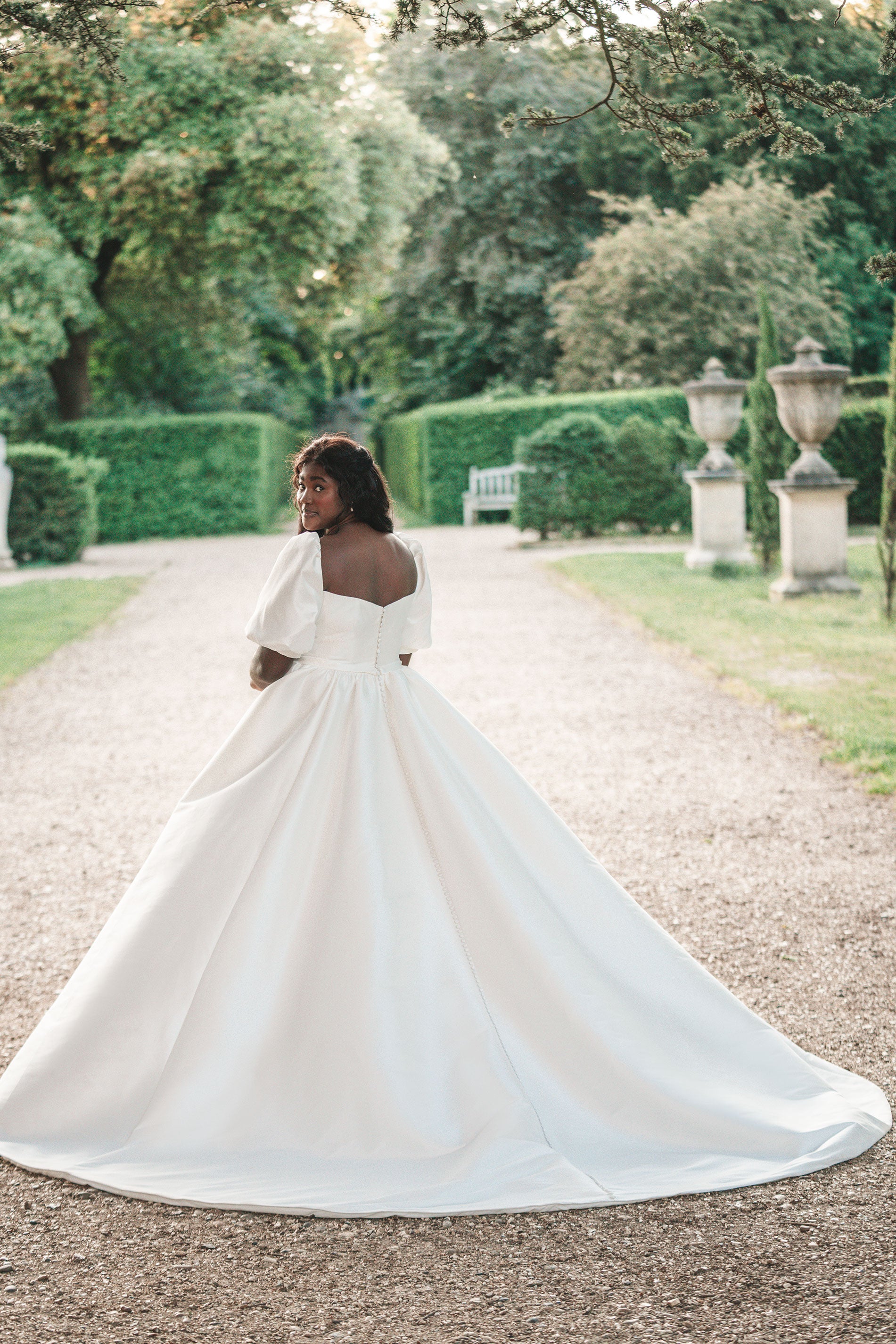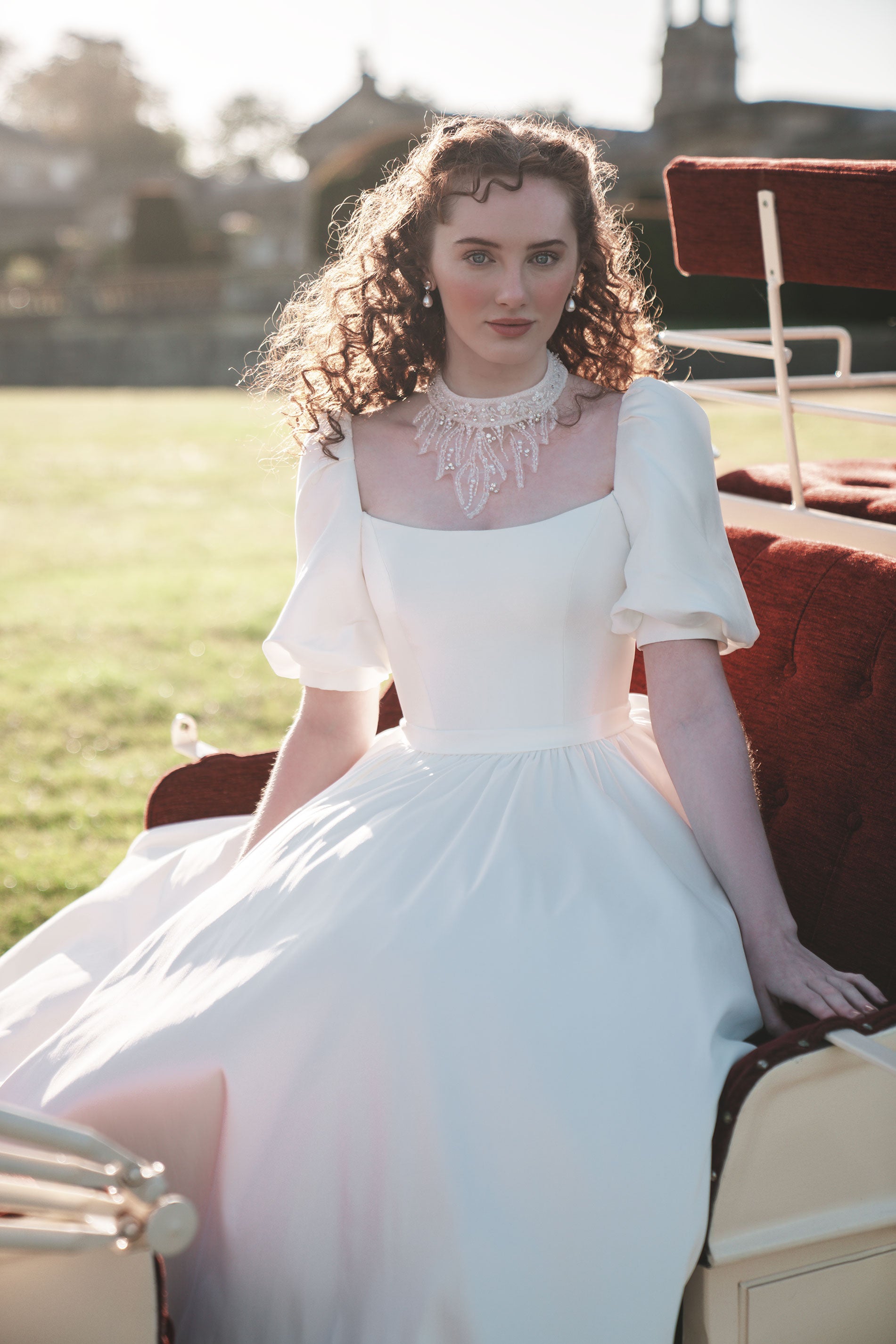 This season's incomparable will certainly be turning every head in this simply devastating Mikado gown. With full A-line skirting and a classic silhouette, topped with silky puffed sleeves, this stunning look is available in traditional ivory and soft mauve.