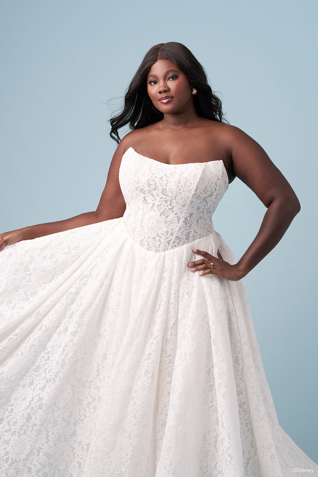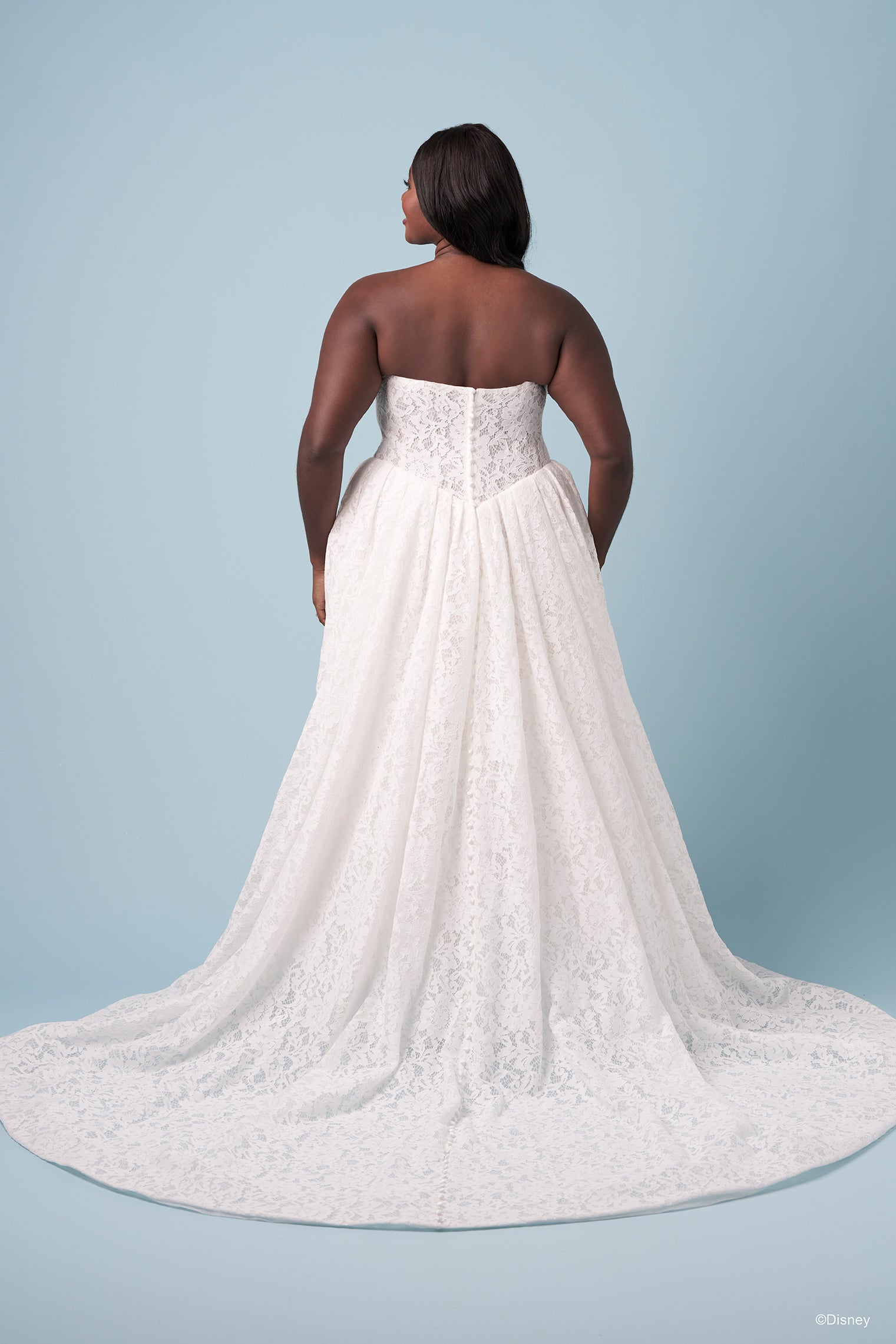 Gentle and full of grace, this lace ballgown reflects Snow White’s pure heart and enduring optimism. The basque waist shapes a beautifully regal silhouette, while detachable puff sleeves bring a touch of storybook sweetness. Completing the look, a soft yet structured organza bow drapes elegantly at the back — a whimsical flourish that mirrors Snow White’s joyful spirit. The bow, sold separately as Style D467B, adds a magical finishing touch to this fairytale design, celebrating the beauty of kindness, courage, and love everlasting. Read Less