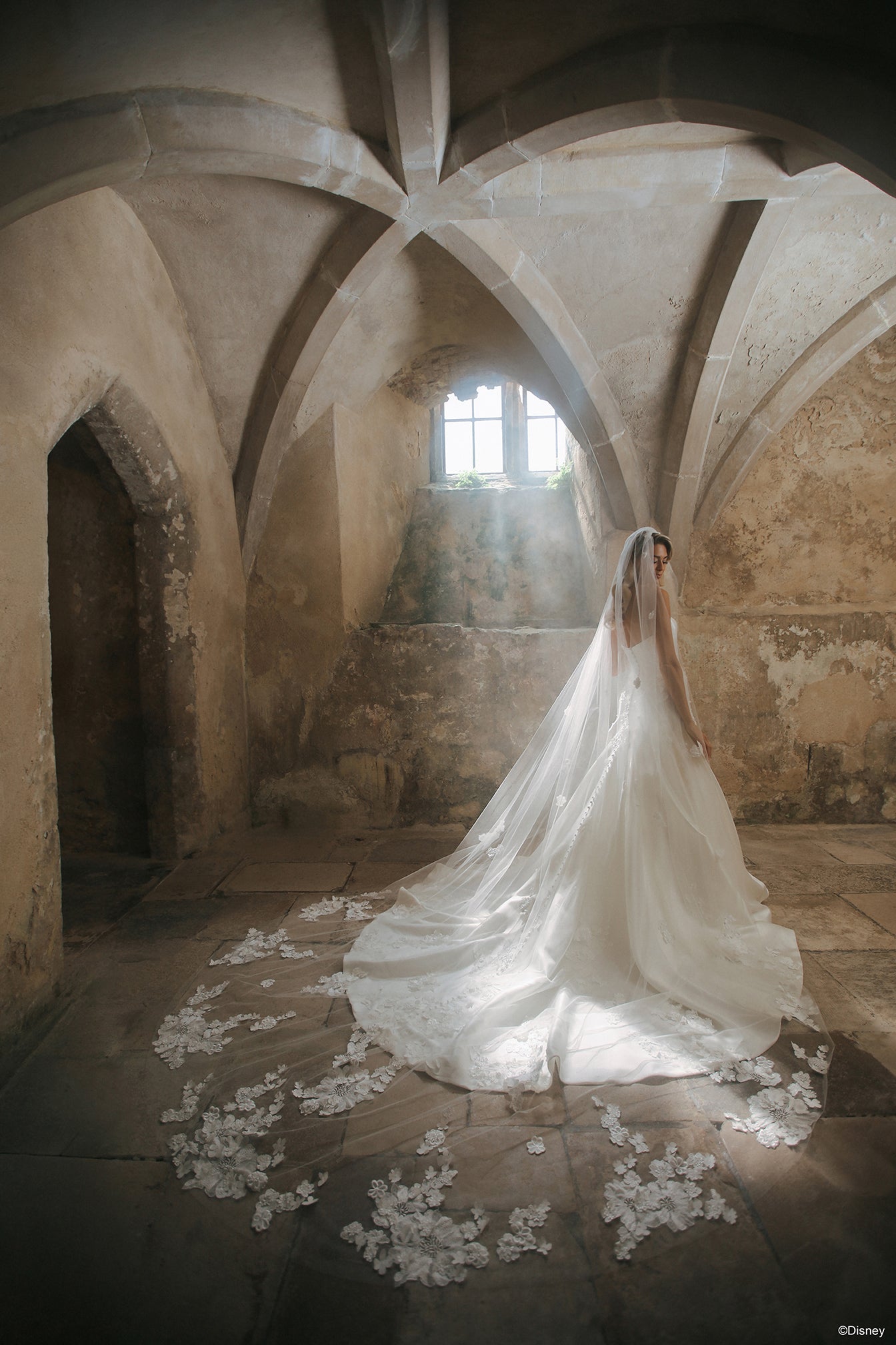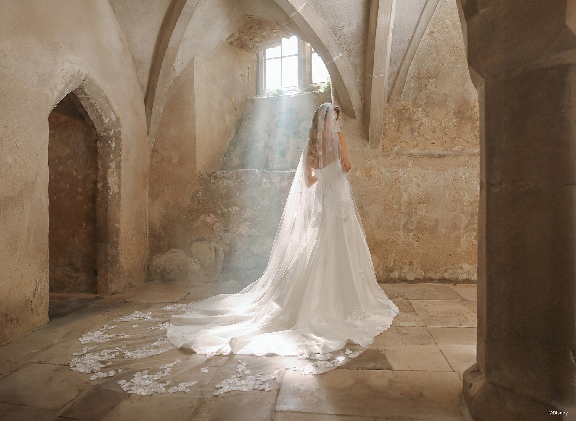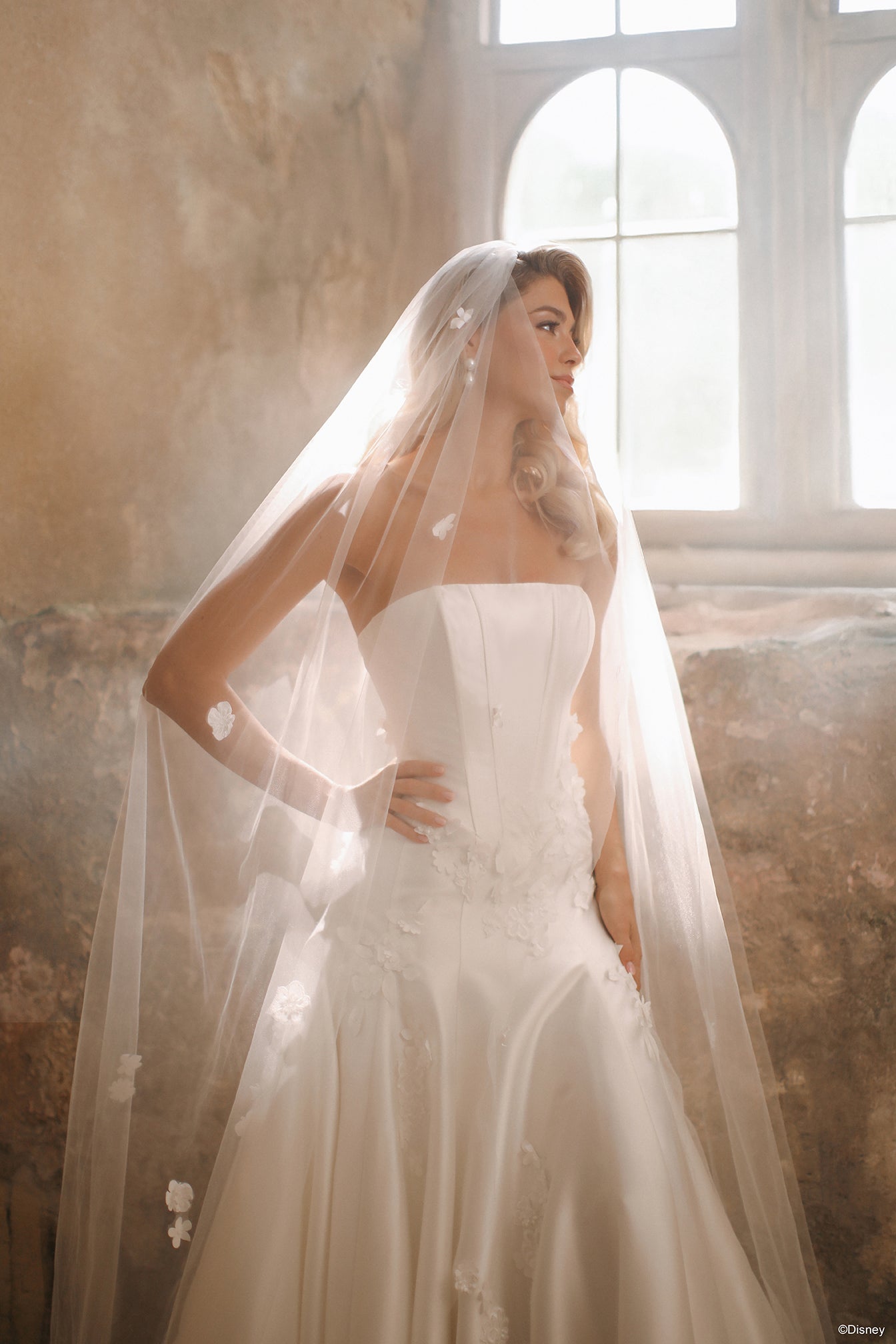Ethereal and romantic, this cathedral-length veil perfectly complements the Aurora-inspired gown. Crafted from airy tulle, it’s adorned with the same delicate 3D floral appliqués that bloom across the dress, creating a seamless, enchanted look. Flowing gracefully behind you, this veil adds a touch of elegance — a dreamy finishing piece worthy of a modern-day princess. Read Less