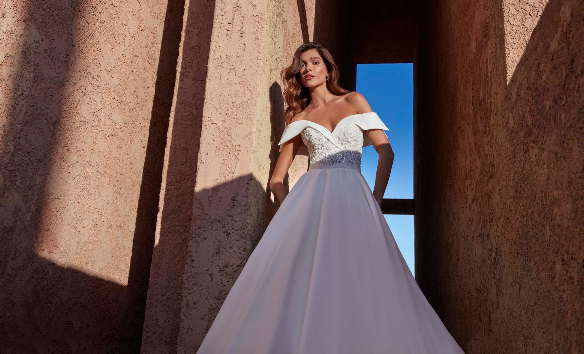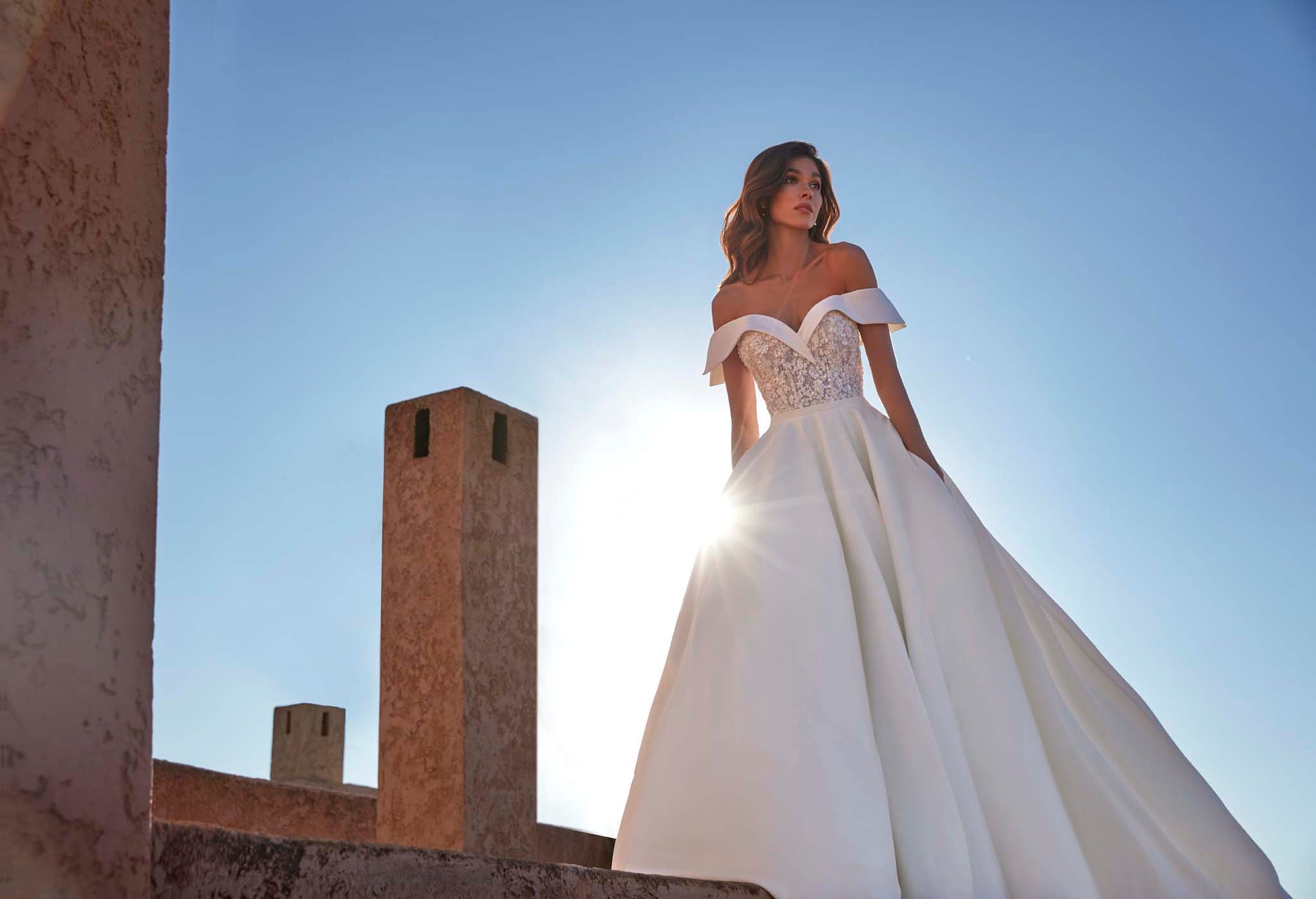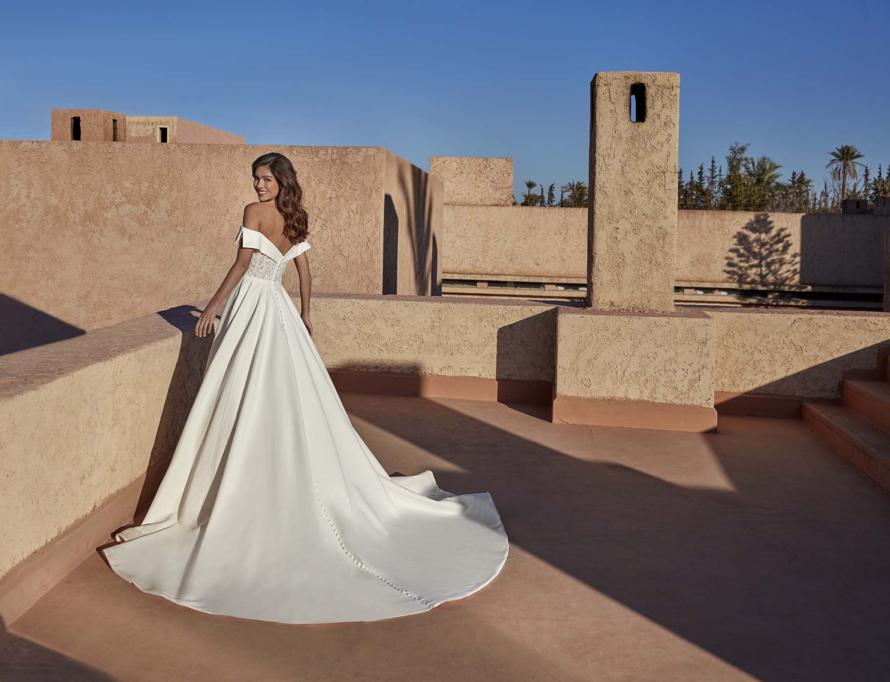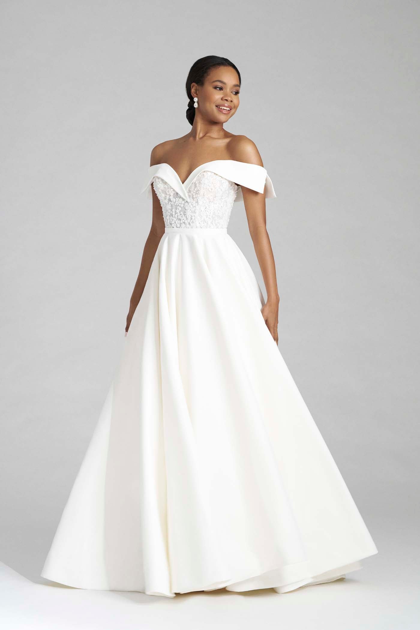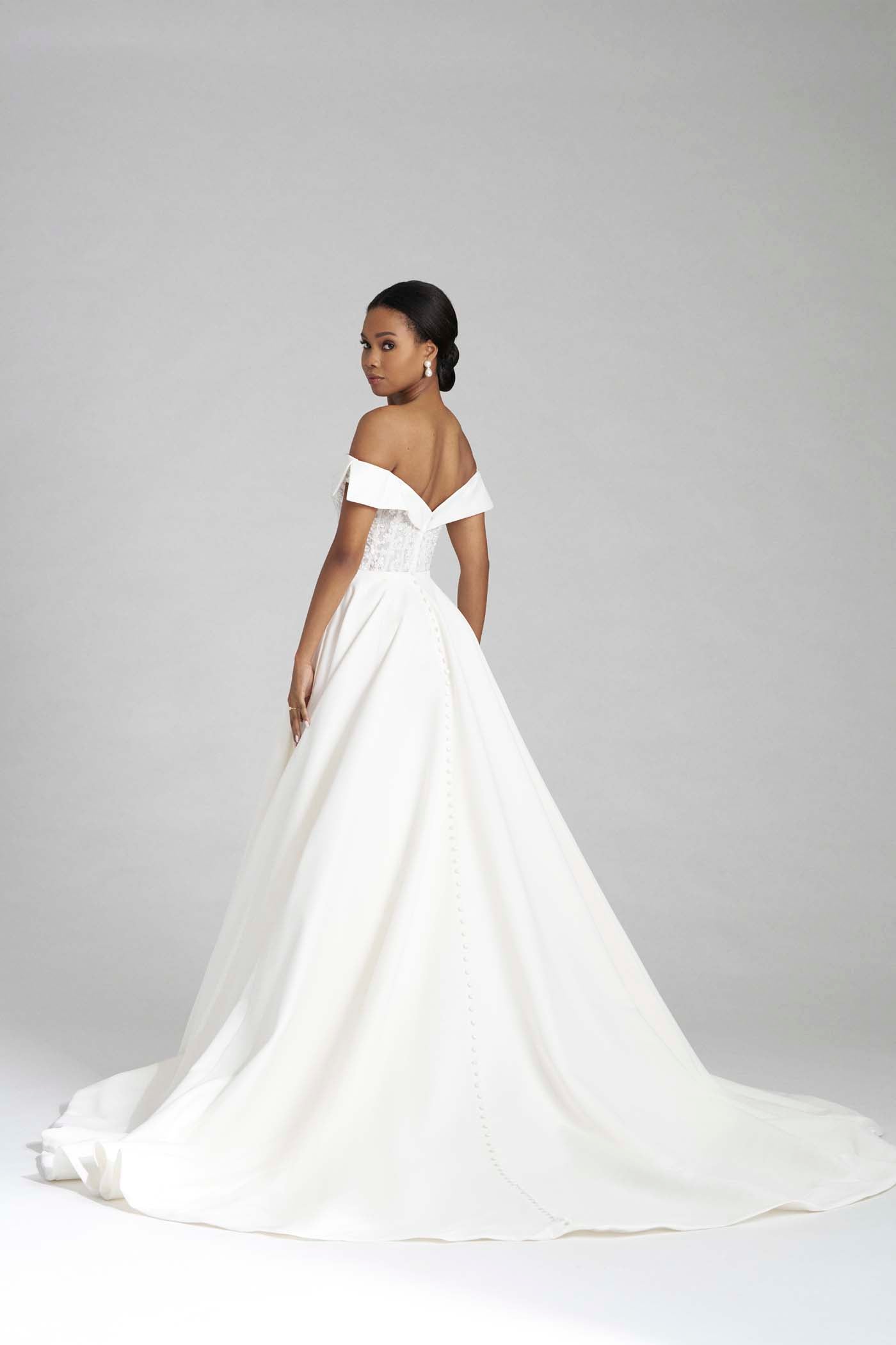 Etta is a modern ballgown in soft dove satin, designed with a clean silhouette and elevated detail. The bodice features appliqued sequin lace framed by sculpted dove satin that shapes into off-the-shoulder sleeves, blending shimmer with structure. A thin belt defines the natural waistline, while covered buttons trail along the chapel-length train for a polished, timeless finish. Read Less