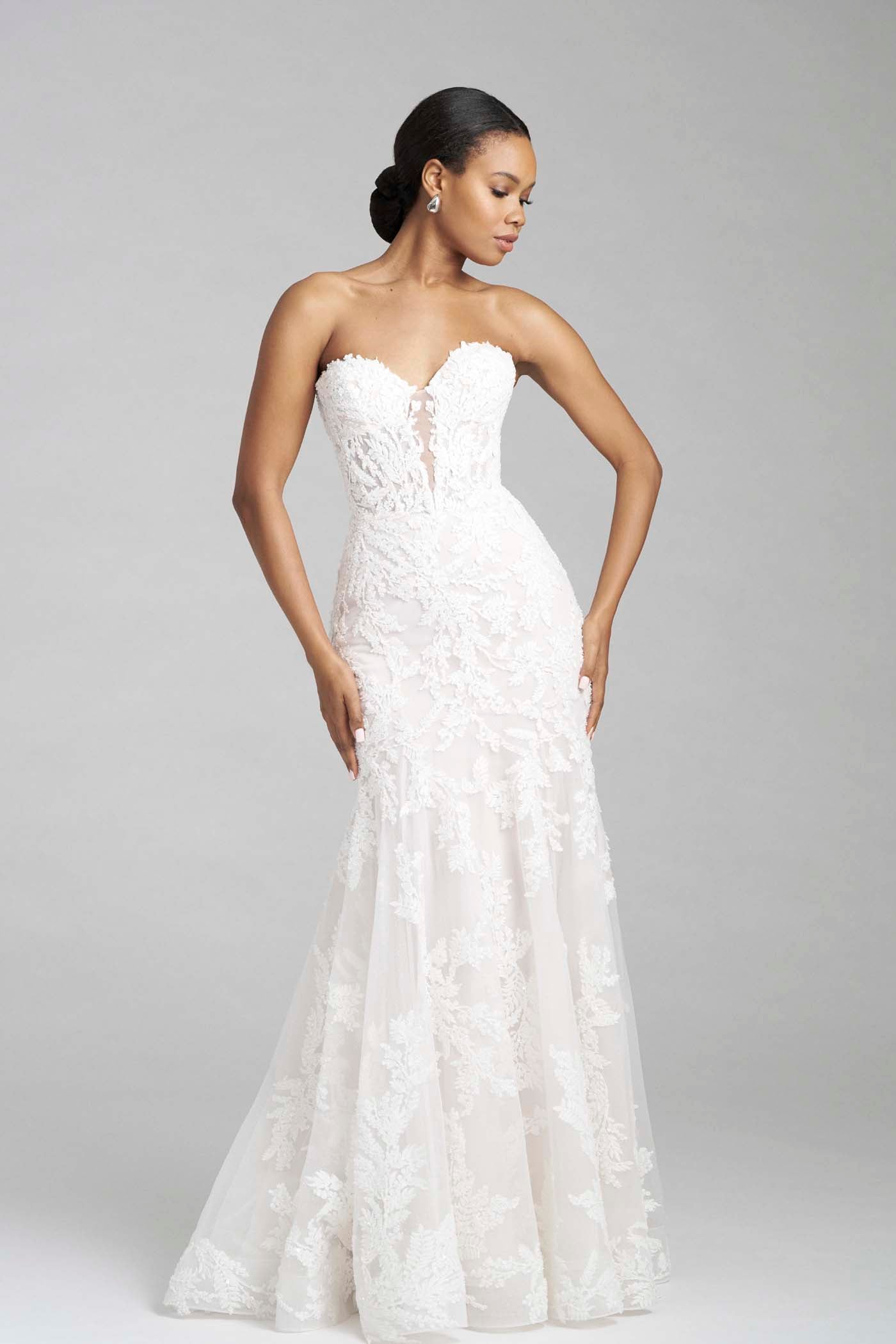 Elodie is a luminous sheath gown that pairs beaded and sequin lace appliques with layers of shimmering sparkle tulle for multidimensional shine. The plunging sweetheart neckline highlights the sheer bodice, where exposed boning adds structure beneath the surface. Sleek and radiant, it's designed for the bride who wants to glow from every angle. Read Less