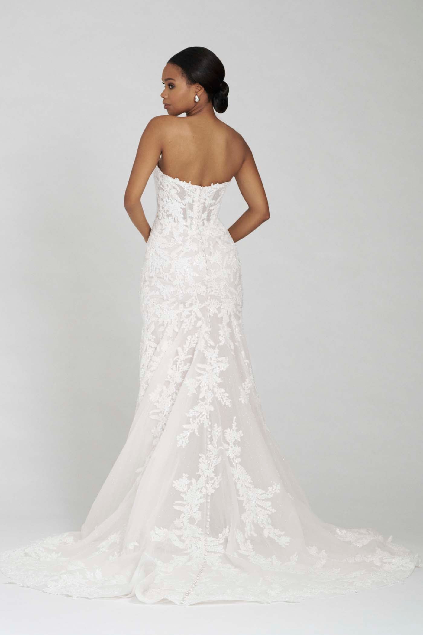 Elodie is a luminous sheath gown that pairs beaded and sequin lace appliques with layers of shimmering sparkle tulle for multidimensional shine. The plunging sweetheart neckline highlights the sheer bodice, where exposed boning adds structure beneath the surface. Sleek and radiant, it's... Read More