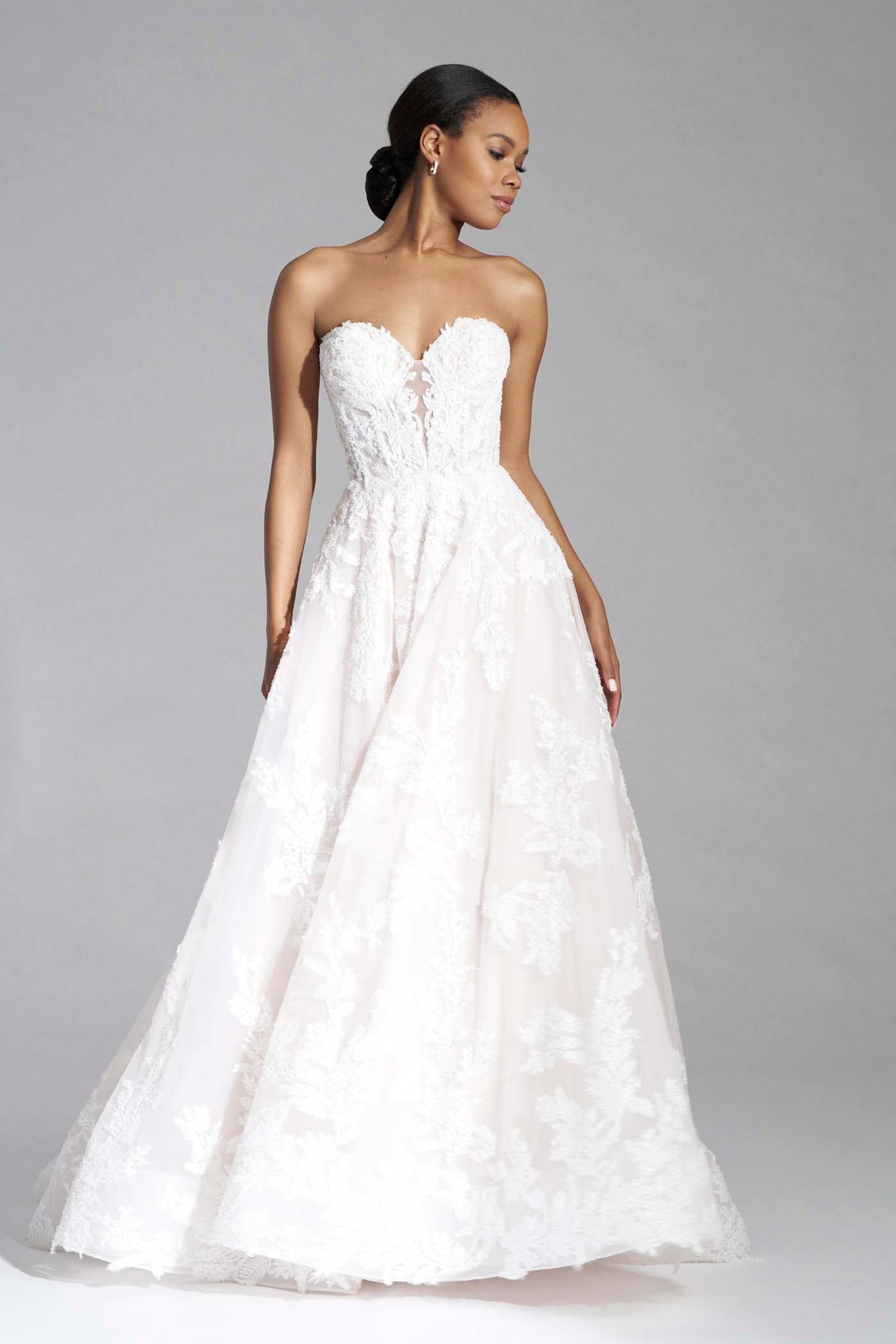 Esther is a soft A-line gown that balances structure and sparkle with ease. The plunging sweetheart neckline leads into a sheer bodice with exposed boning, adorned with sequin and beaded lace appliques that trail into the layered sparkle tulle skirt. A chapel-length train completes the ... Read More