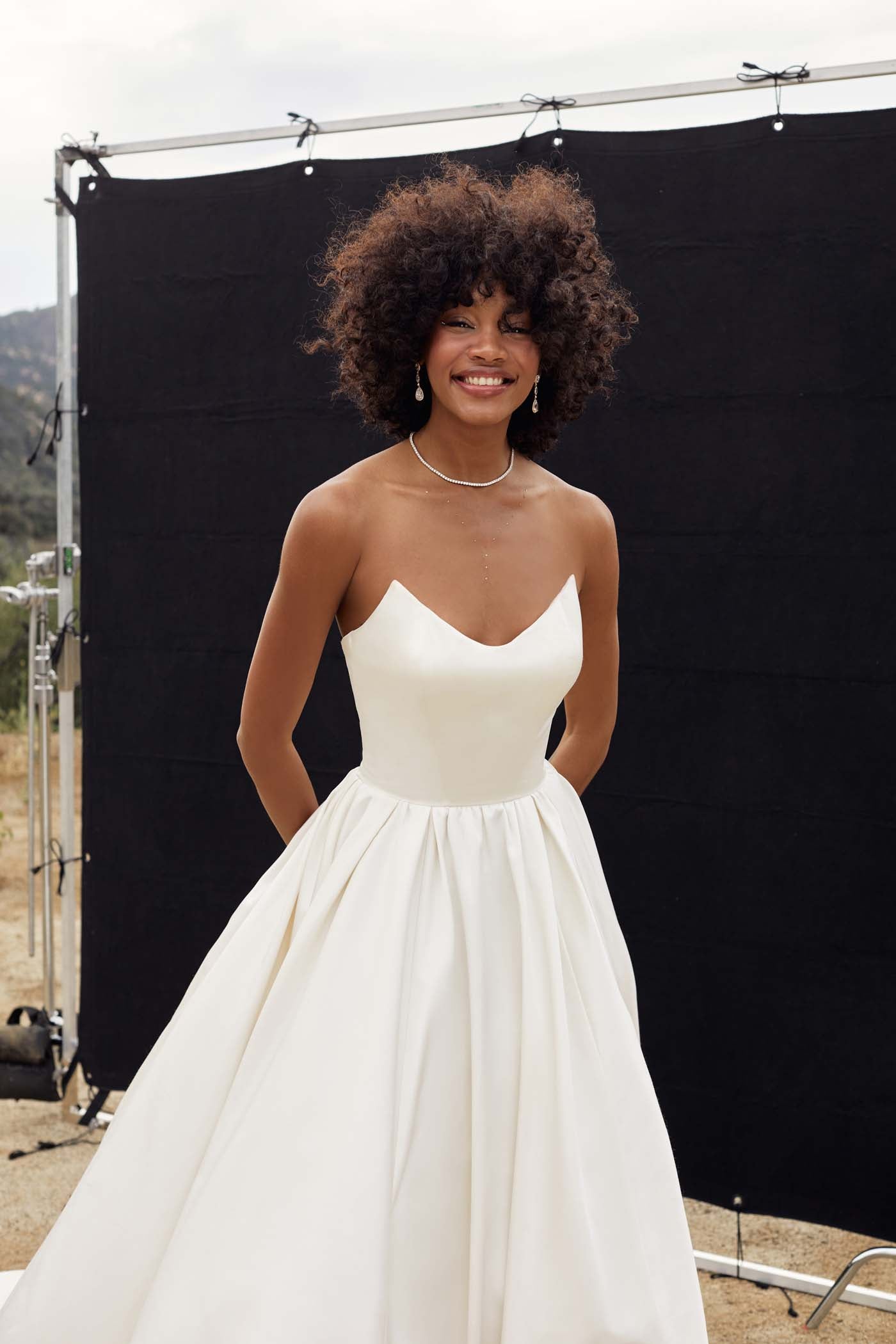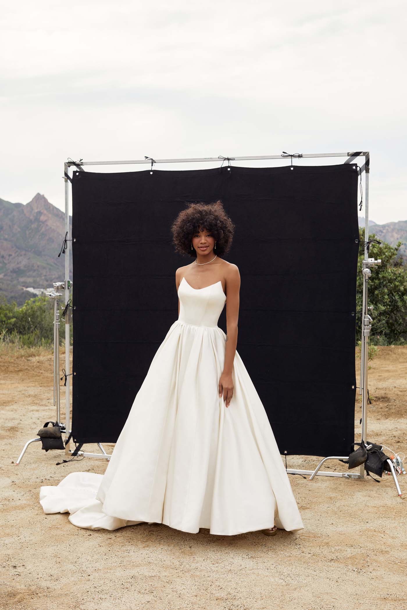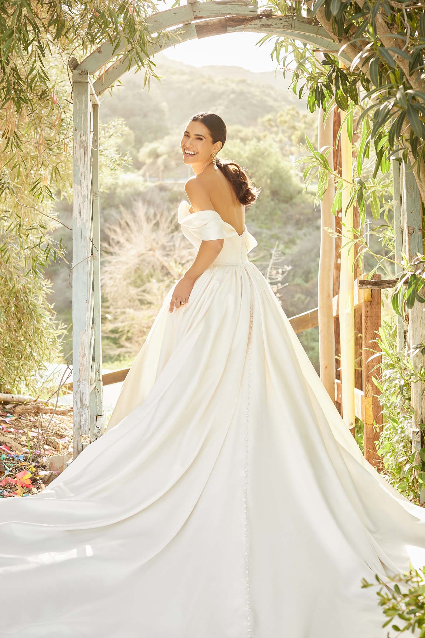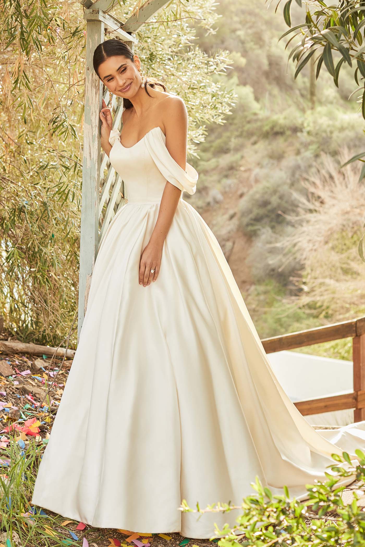 Softly ruched sleeves drapoe off the shoulders of Kari's classic satin ballgown silhouette.