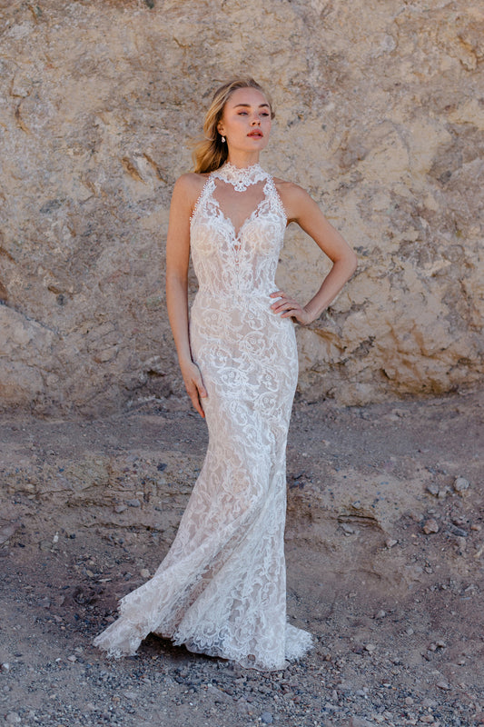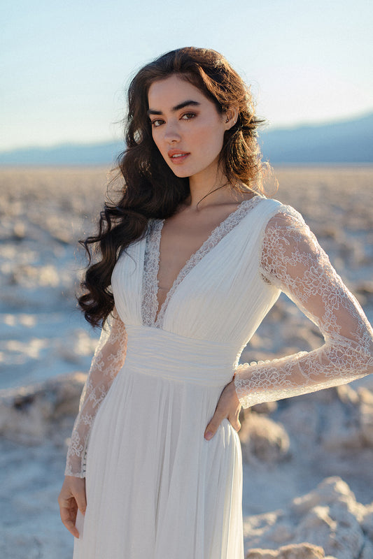 Rooted in freedom and designed for movement, the Wilderly collection was photographed in the stillness of Death Valley—where wind carves the sand and silence holds a kind of power. These gowns are made for the bride who follows her own path: sheer bodices, thigh-high slits, cropped silhouettes, and flowing accessories that lift and ripple with every breeze. Whether standing barefoot on sun-warmed rock or wandering through open landscapes, she’s unbound, effortless, and wholly herself. Wilderly is bridal for the wild-hearted—crafted for the journey, not just the destination.