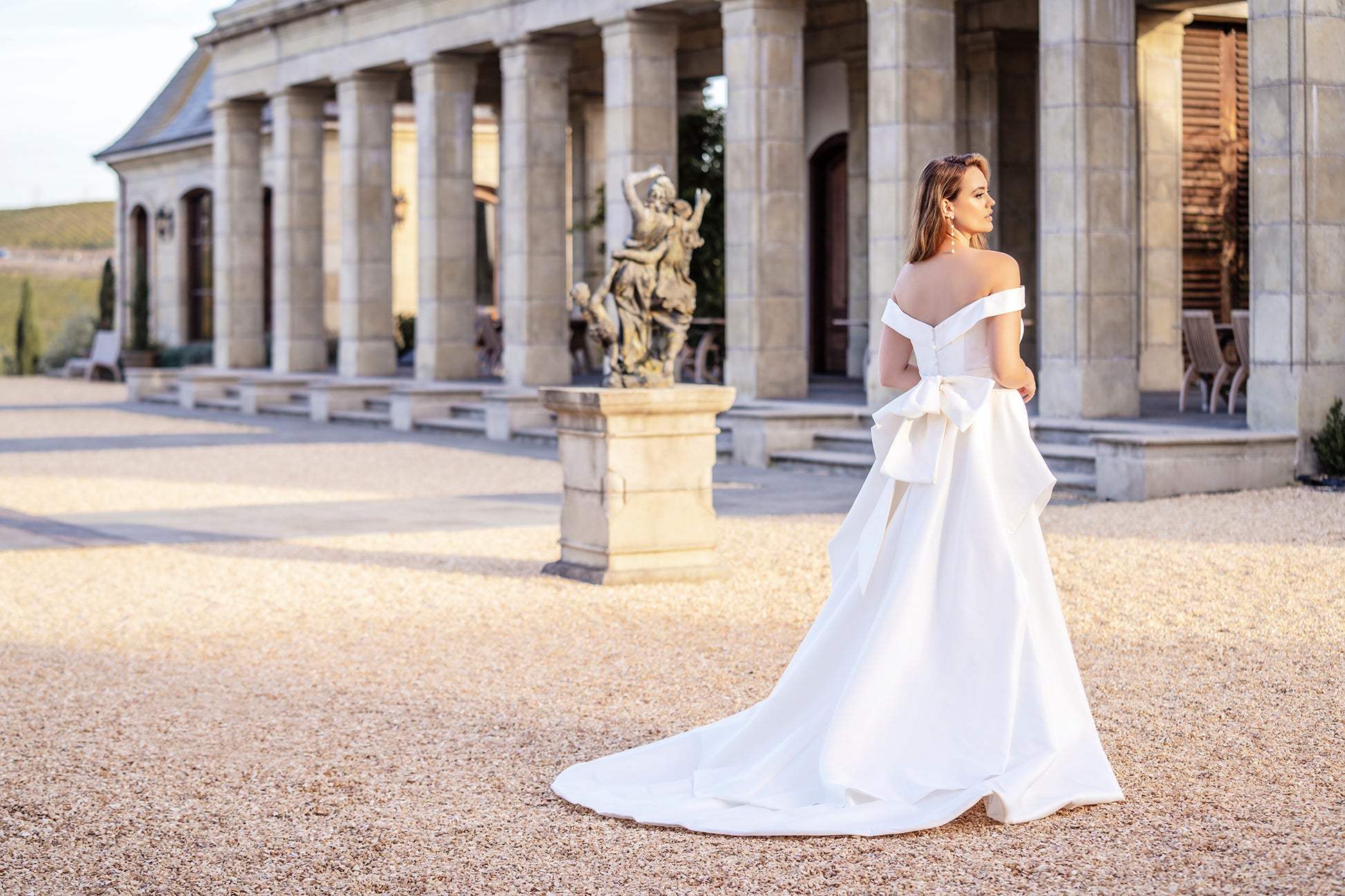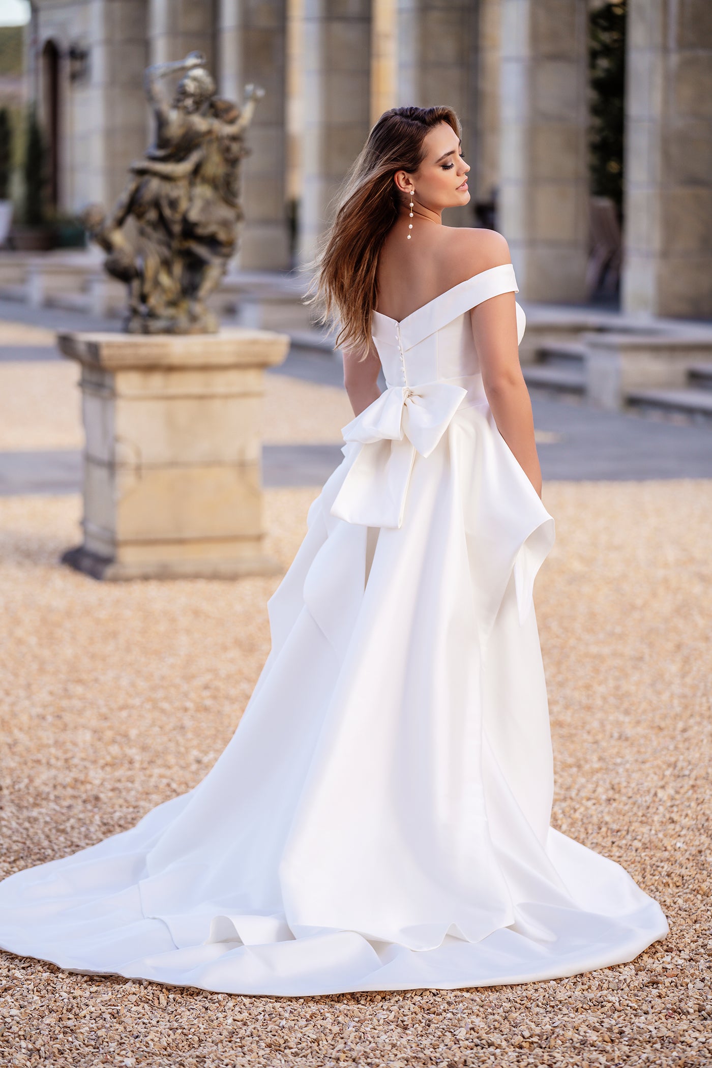 This detachable stretch Mikado train features a beautifully sculptural bow.
