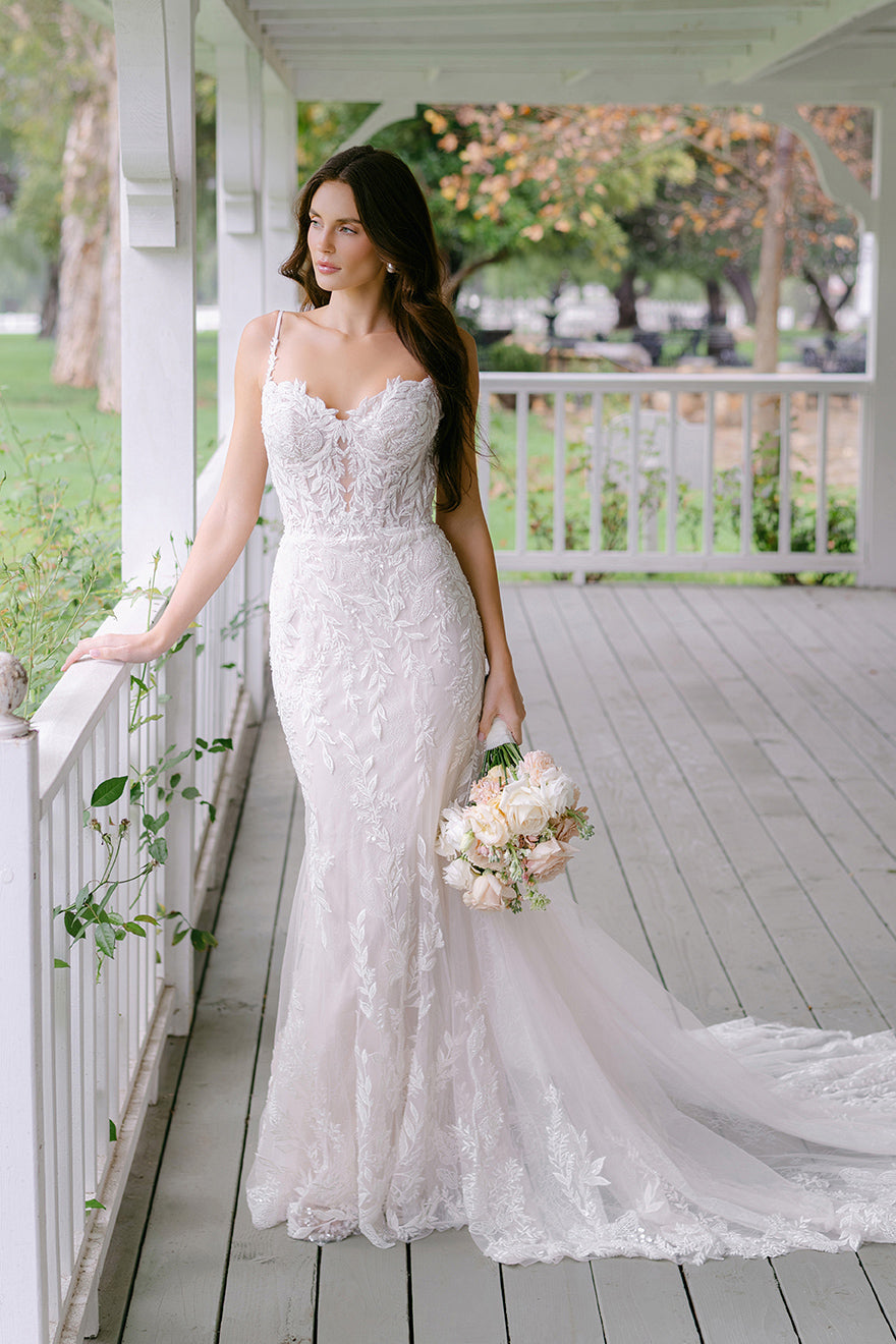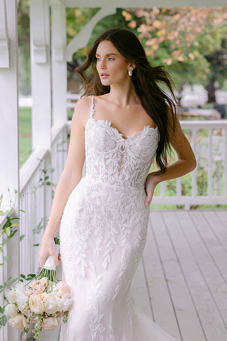 The subtlety of Chantilly lace and translucent tulle provides beautiful contrast to the sequined and tonal beaded appliques used throughout this bridal sheath gown.