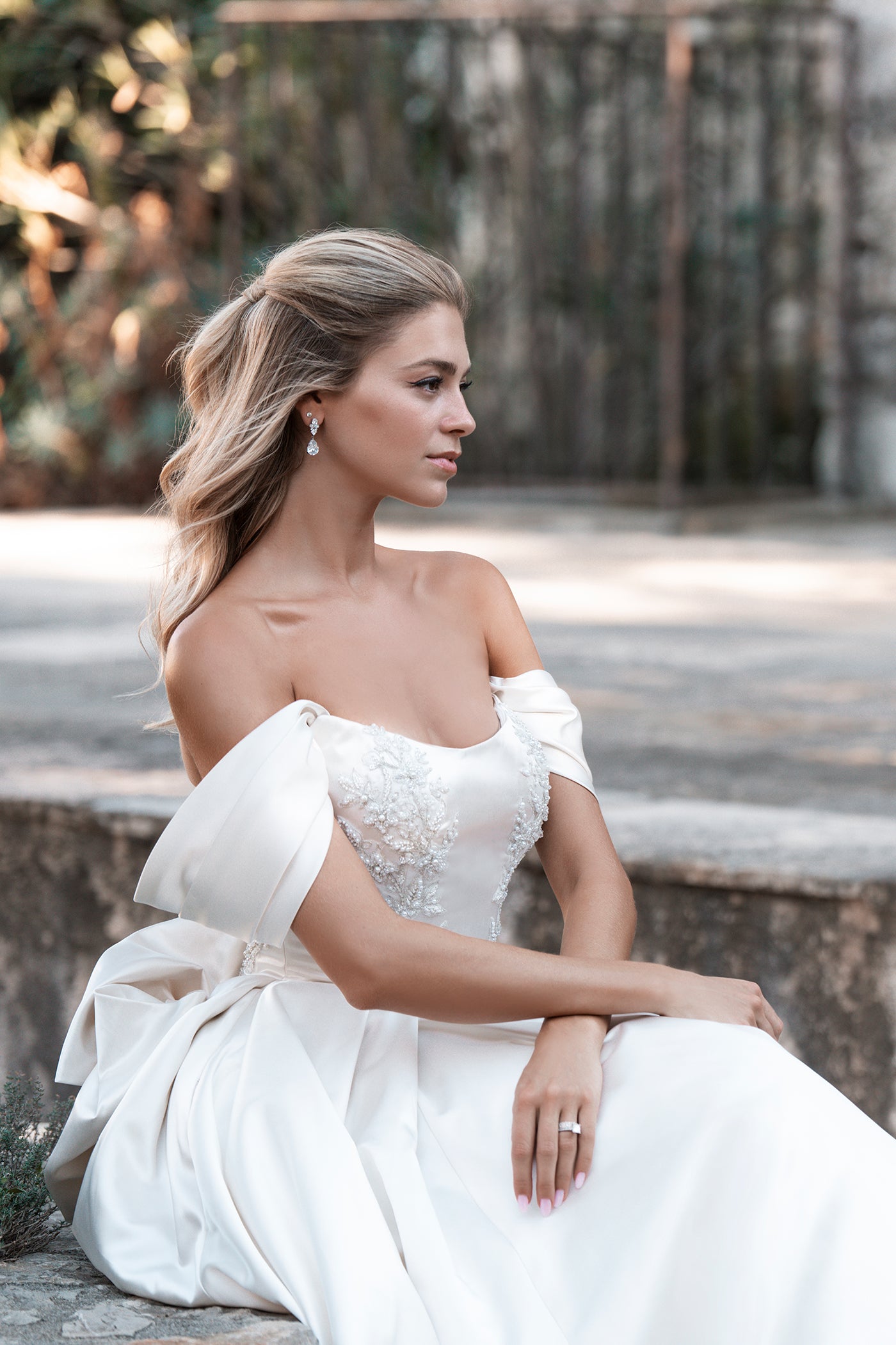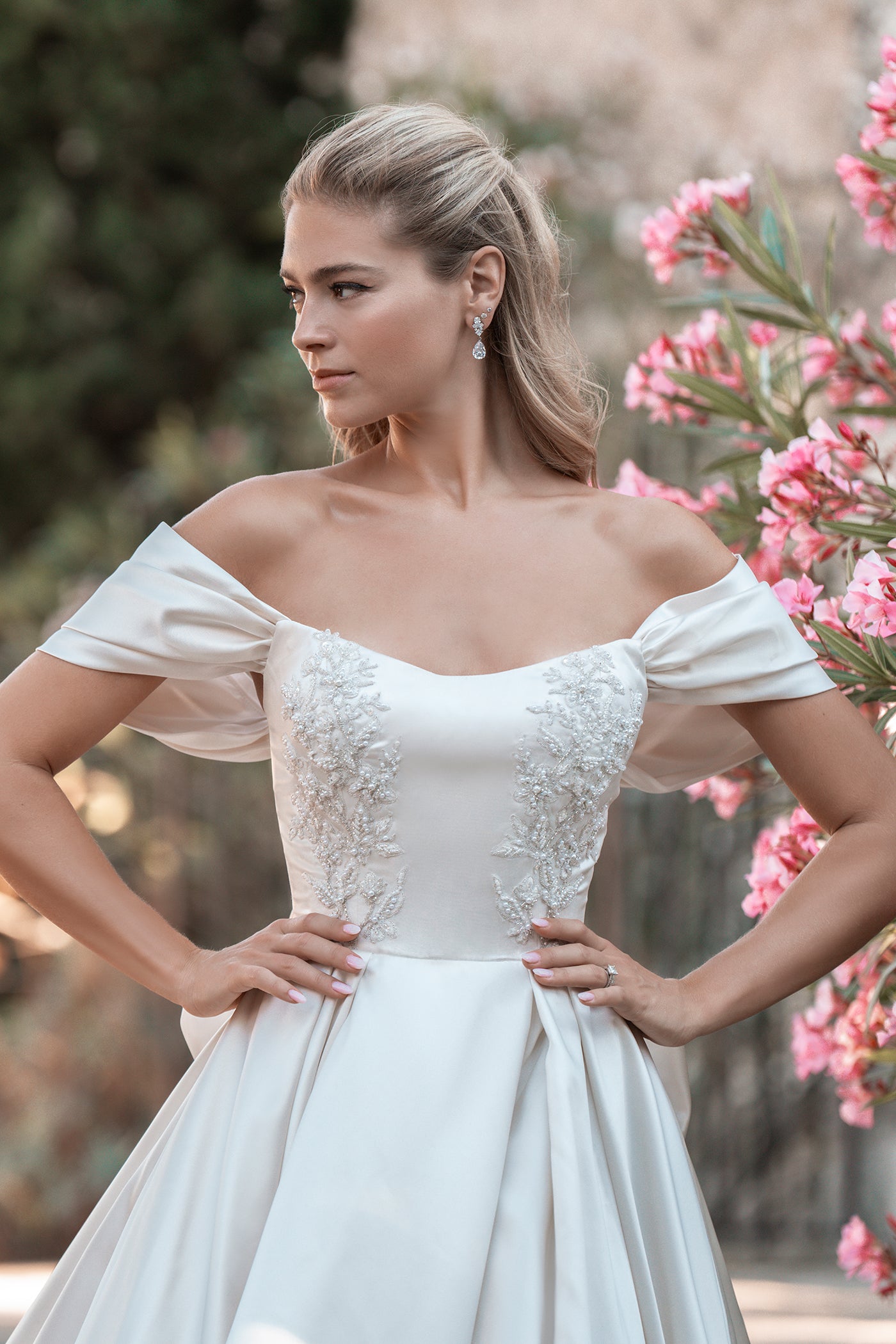Lush satin, beading and sequined appliques are all shown off to their best advantage in this opulent, elegant off-shoulder ballgown.