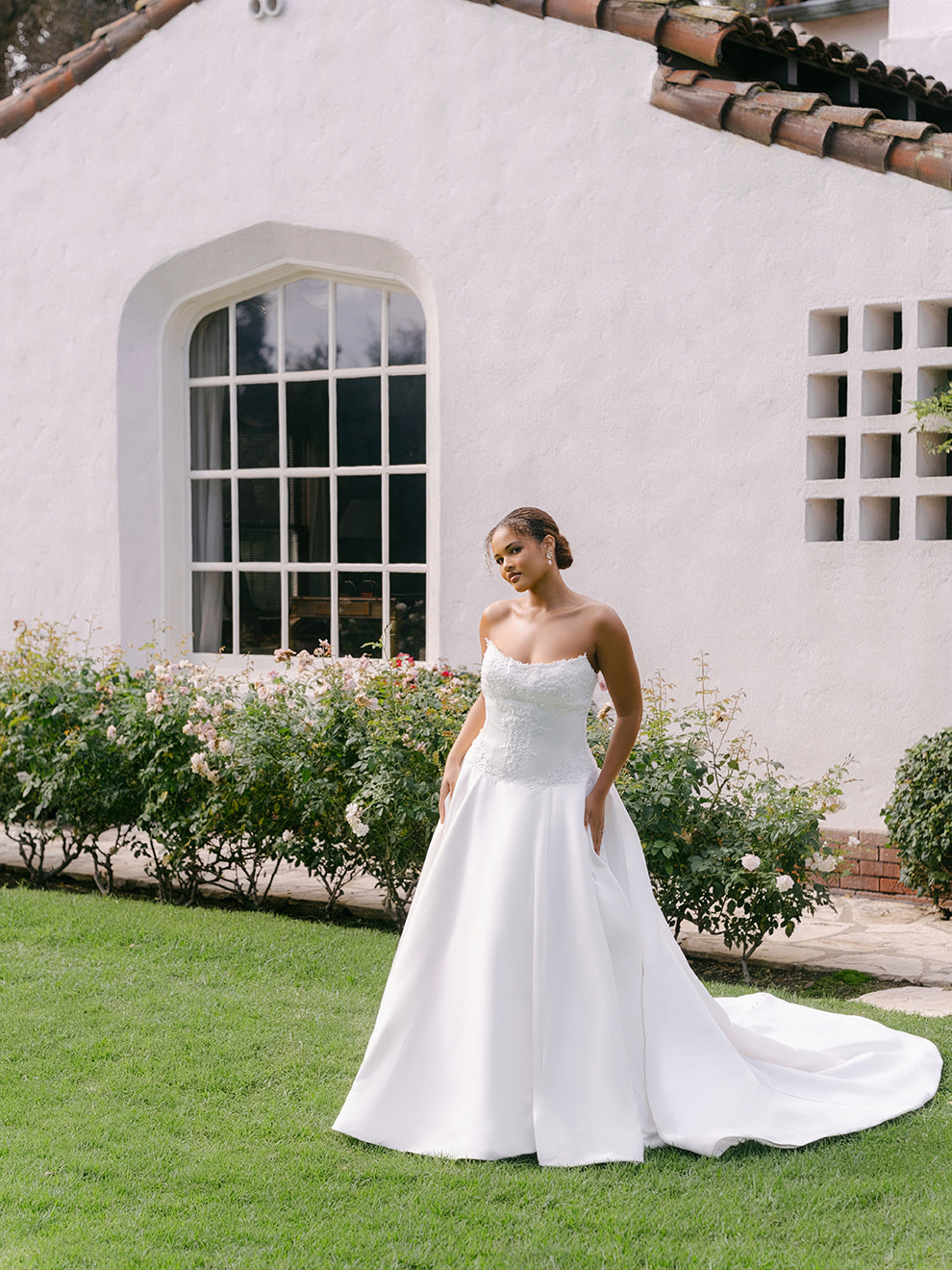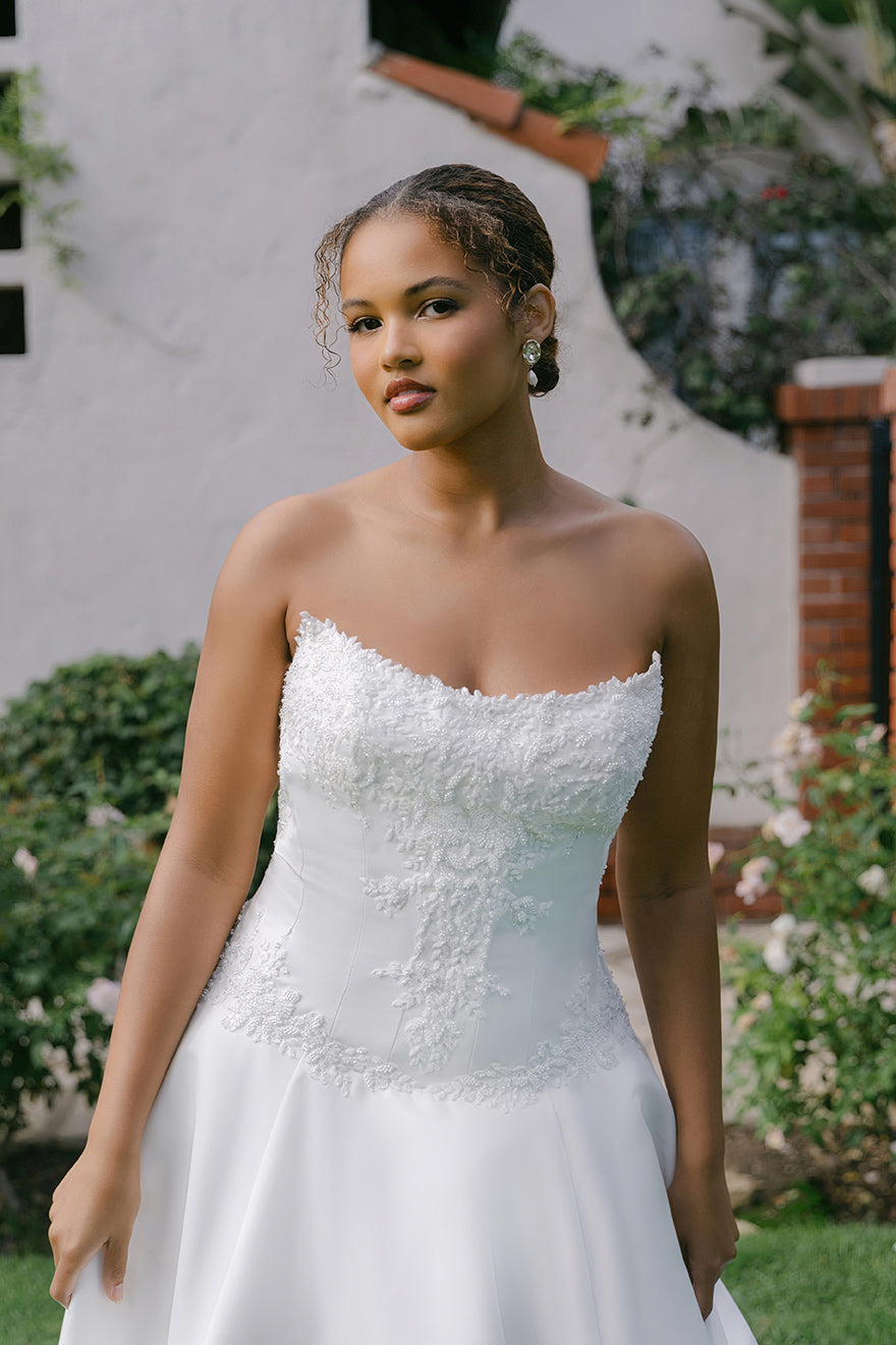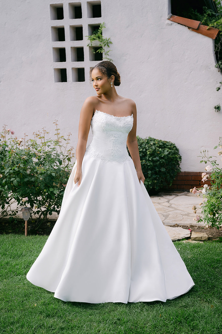 Softly lustrous satin and tonal beading bring quiet dimension to the bodice of this drop waist ballgown, framing a scoop neckline with subtle structure. The silhouette feels timeless yet elevated, offering a modern interpretation of a classic bridal silhouette.