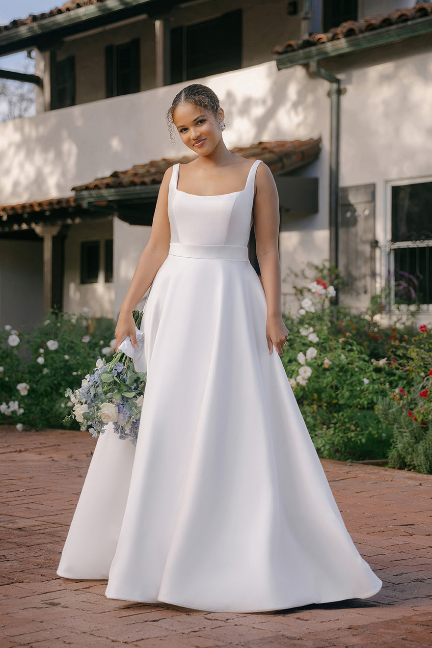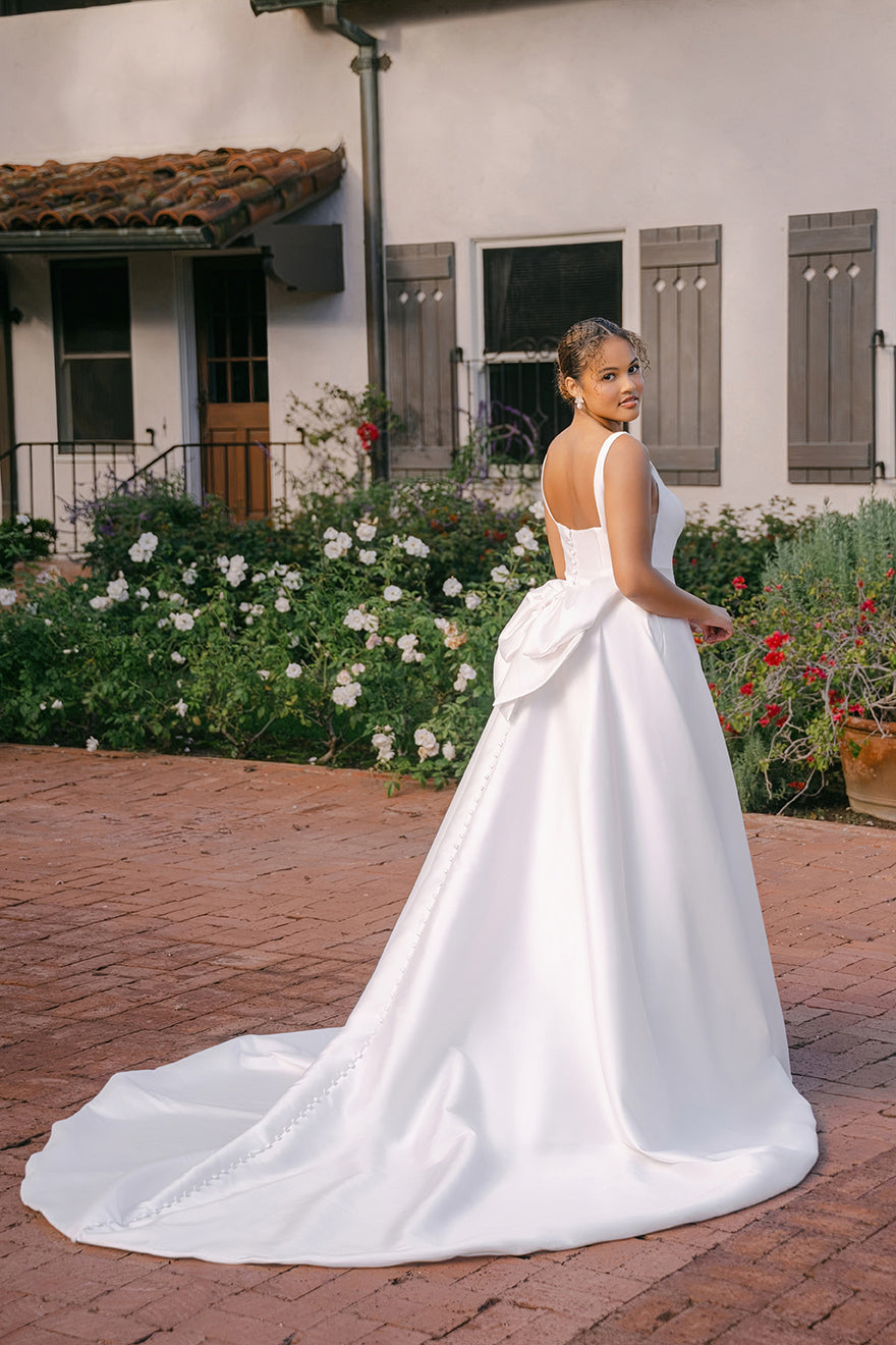 This Mikado ballgown stuns with a classic scoop neckline and delicate spaghetti straps, creating a sleek, timeless silhouette. A detachable bow at the back adds a playful, elegant detail for added versatility.
