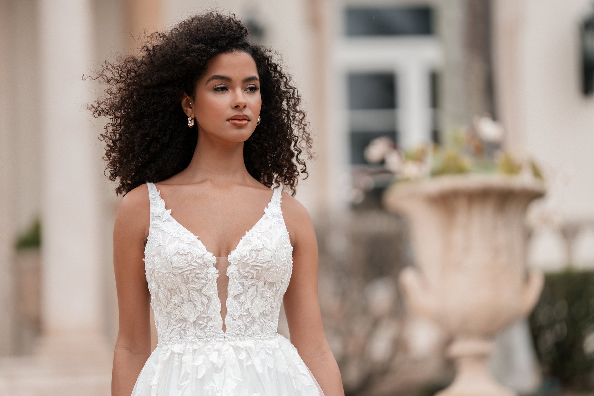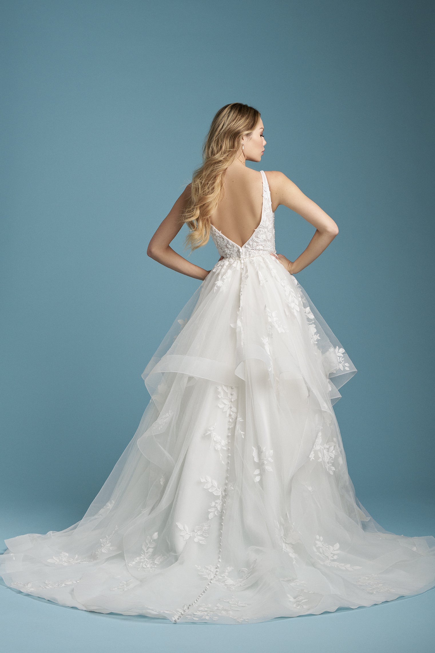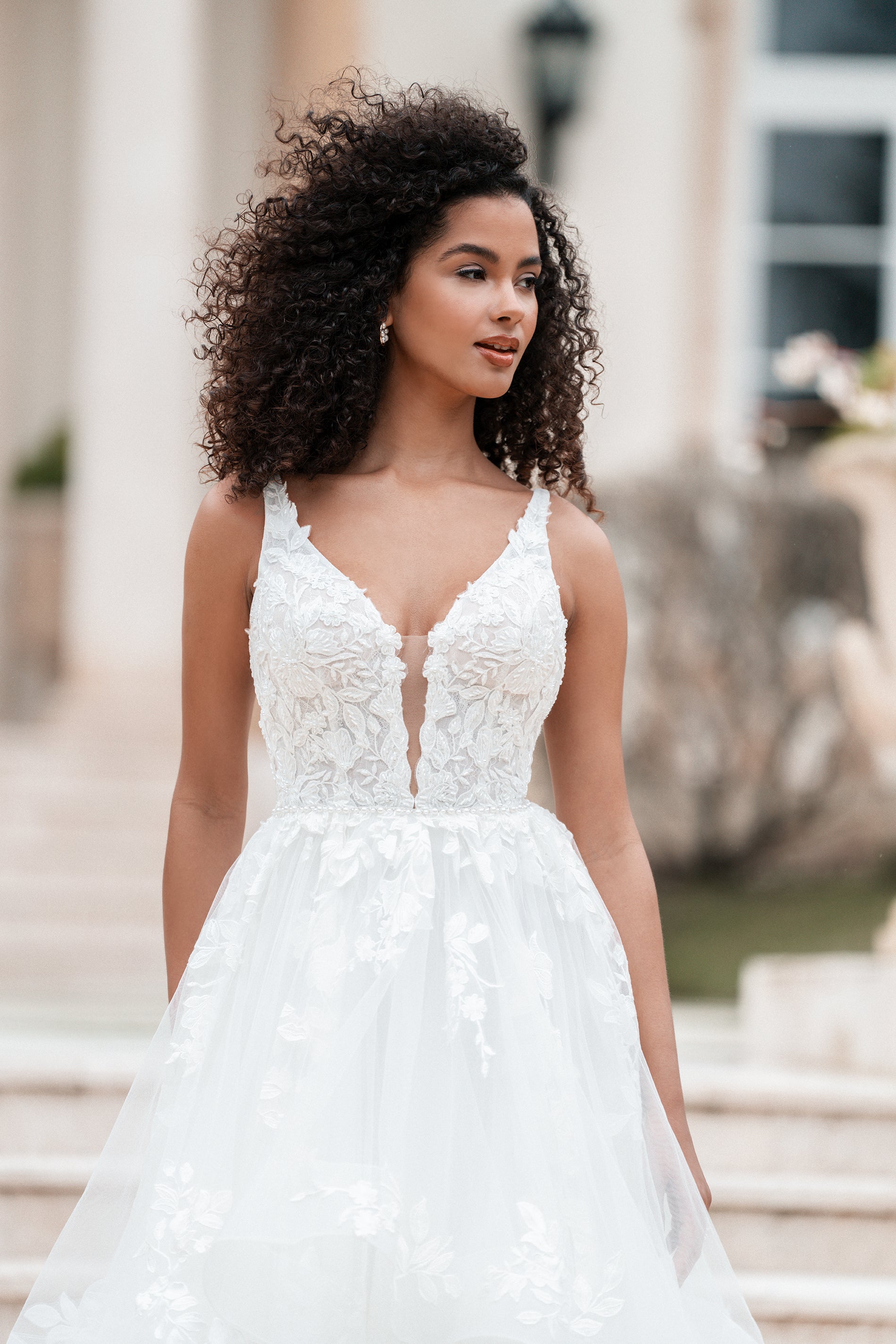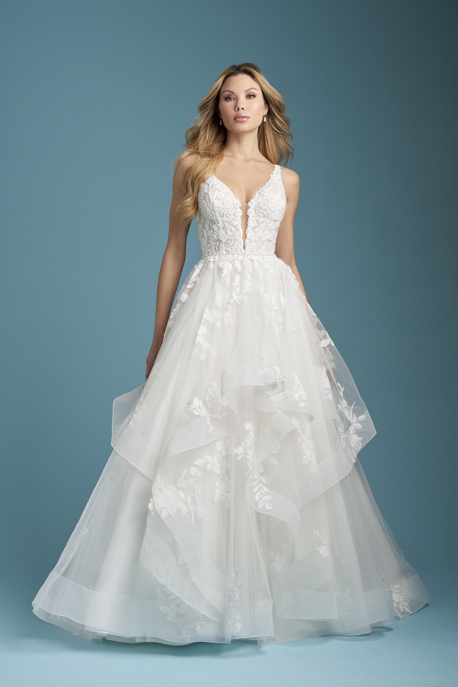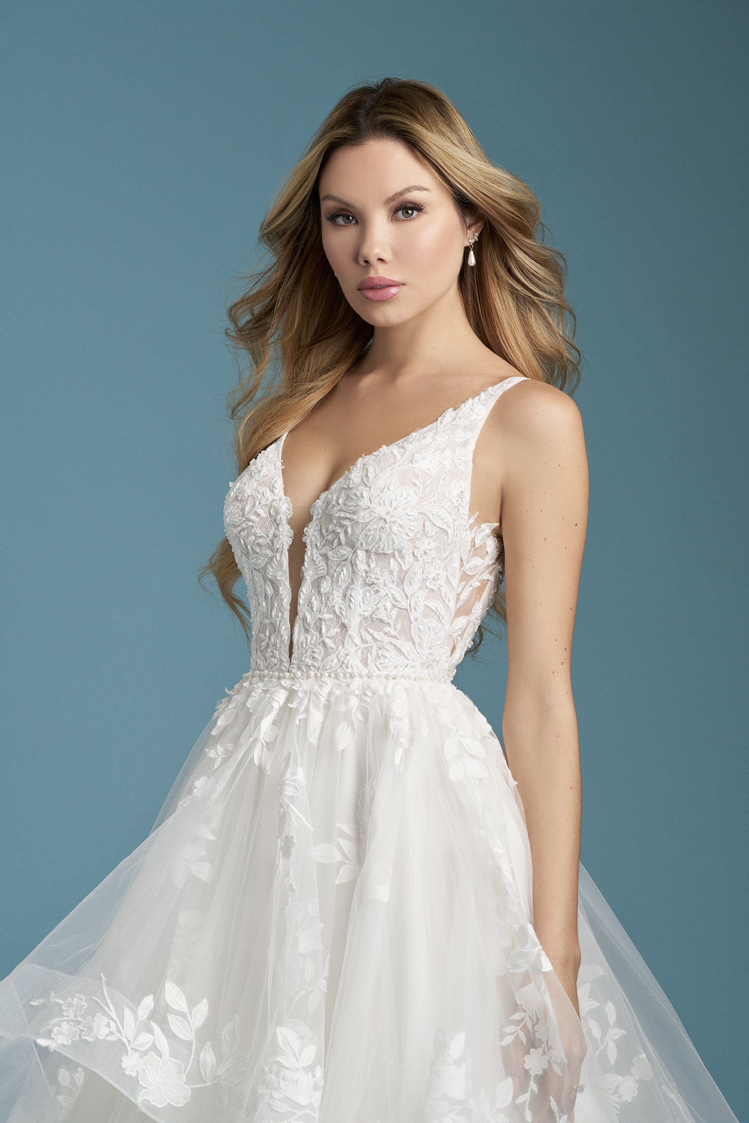This flirty ballgown was made to twirl on the dance floor, featuring a layered tulle skirt and a plunging V-neckline. Beaded lace appliques and tonal beading shimmer across the bodice, while a pearl-trimmed waistline adds a soft, polished touch.