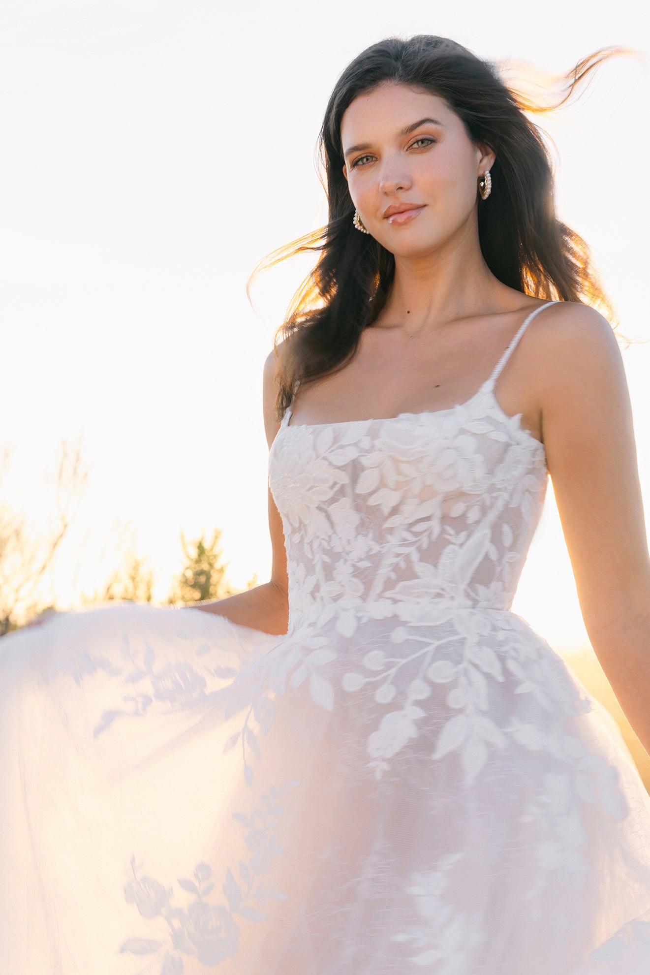 Softly shimmering beadwork and bold floral lace combine in this romantic A-line gown. Designed with a ballet neckline and delicate spaghetti straps, the bodice offers a flattering, feminine shape that flows into a natural waist and ethereal skirt. The mocha undertones enhance the dimension of the lace, while the illusion back adds a touch of intrigue—creating a look that’s effortlessly modern yet beautifully classic. Read Less