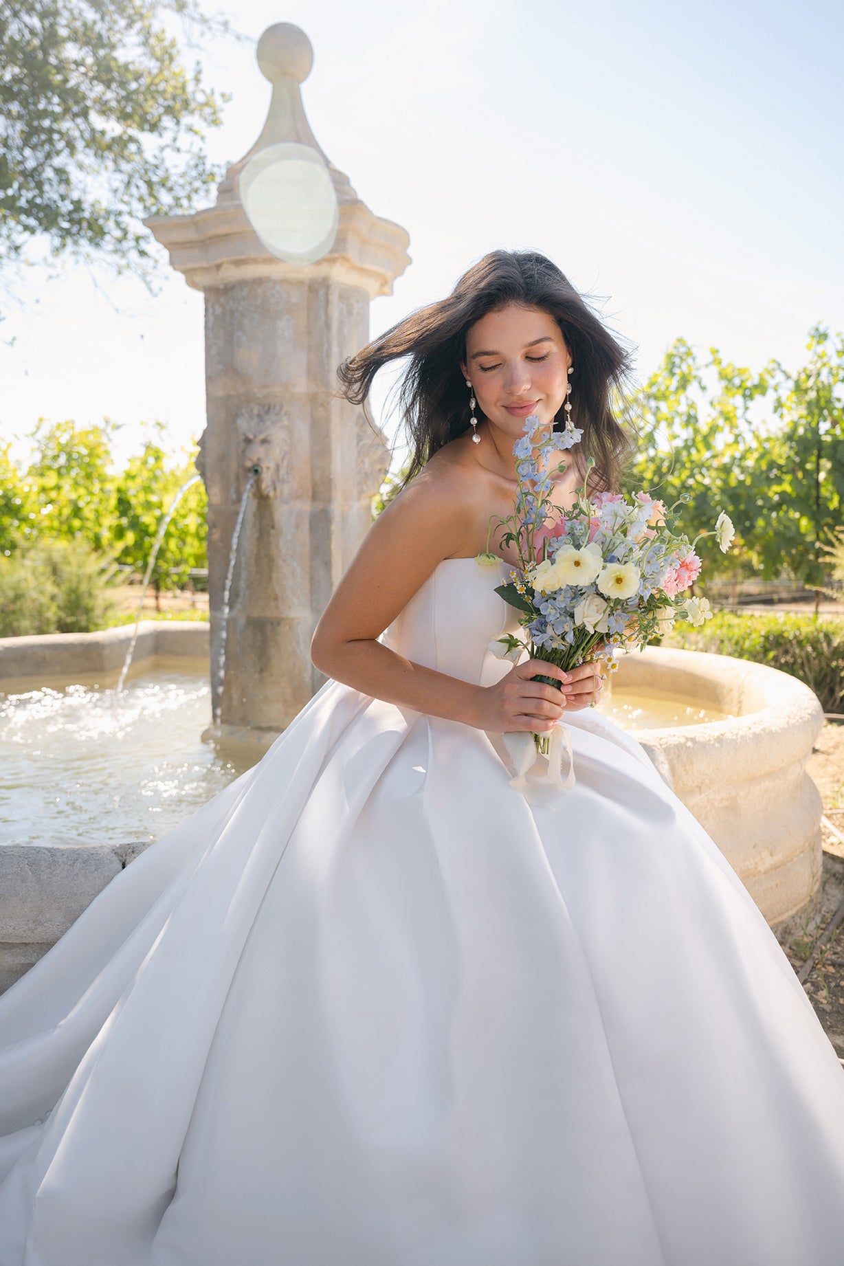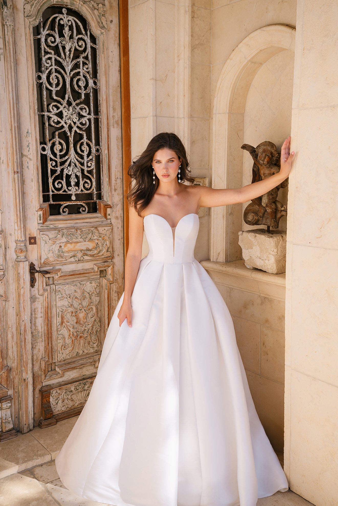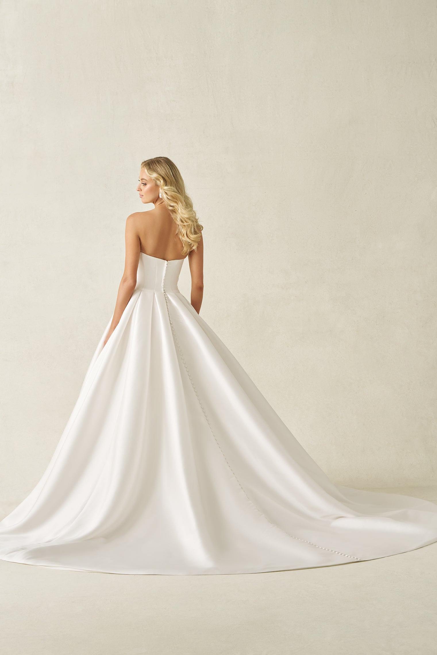 Crafted in luminous Mikado, this ballgown blends clean structure with soft romance. The bodice features a subtle sheer plunge for a hint of modern allure, balanced by the sculpted seams and fitted shape that define the waist. Flowing into a full, sweeping skirt, the gown’s polished fini... Read More
