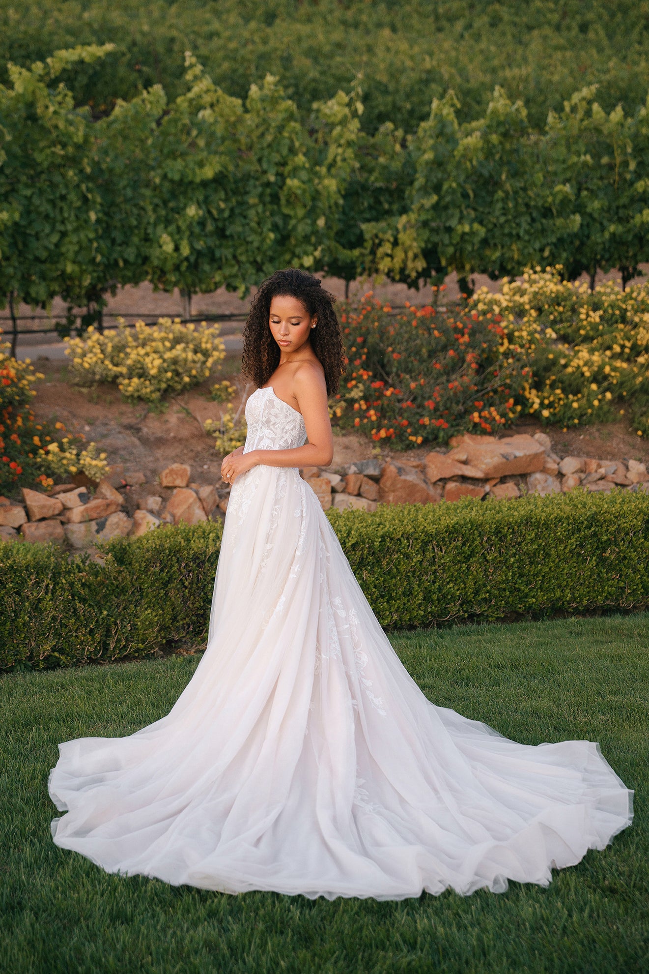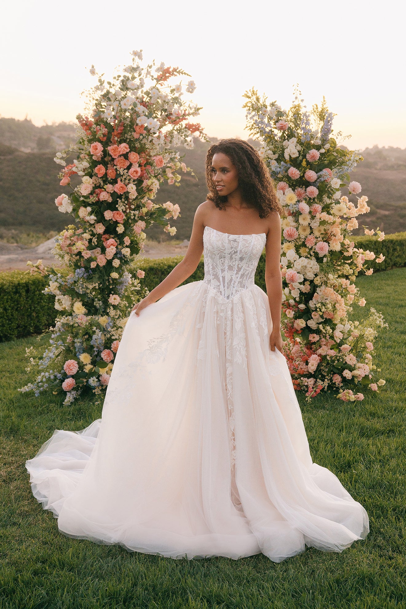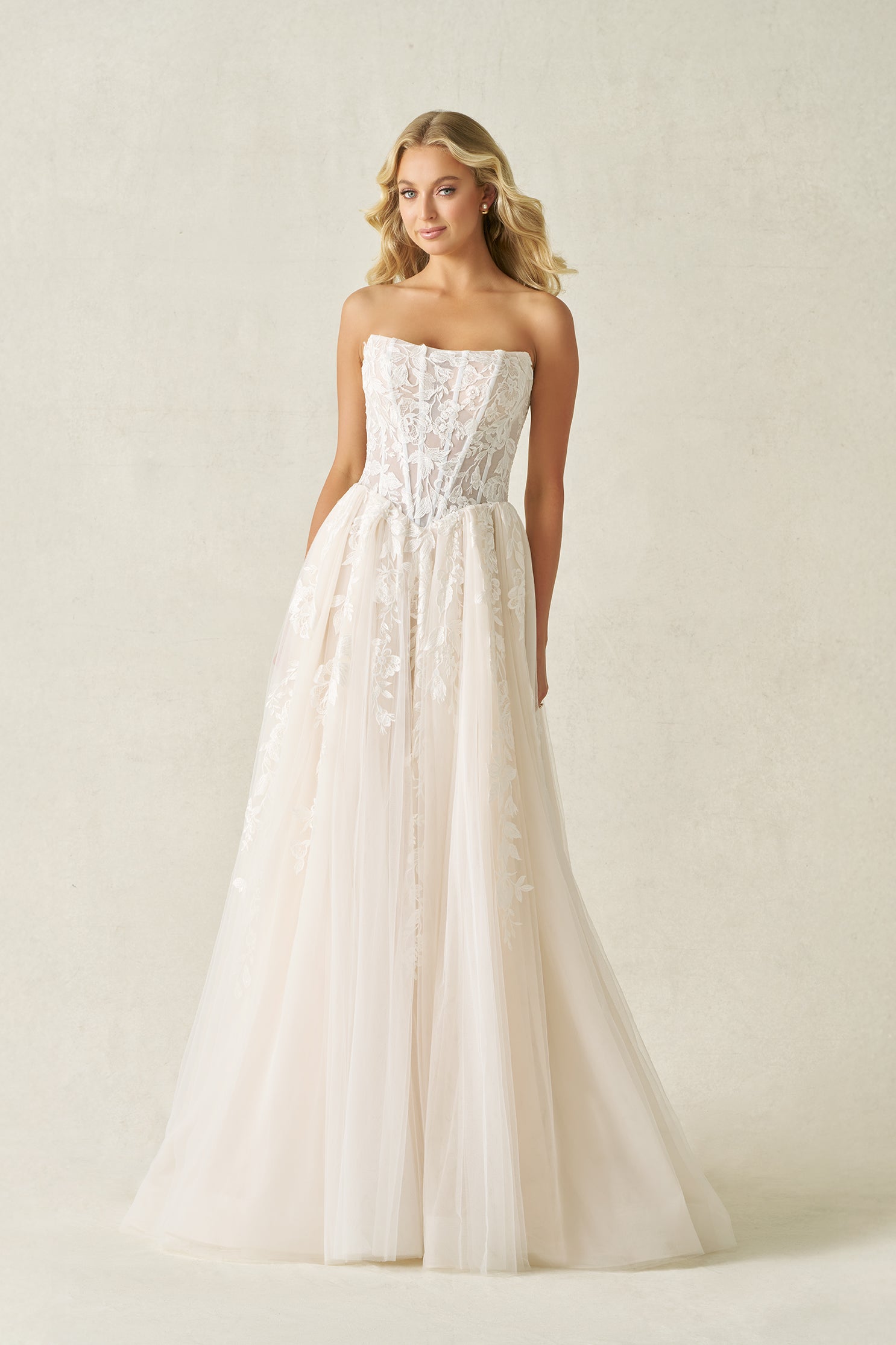 Shimmering sequin lace appliques cascade over layers of soft tulle in this romantic ballgown. The strapless subtle cat-eye neckline frames an exposed-boning, corseted bodice that sculpts and defines the basque waist before flowing into a full, airy skirt. Crafted in lace and tulle with a subtle basque waist, the gown blends ethereal texture with modern structure. A coordinating lace jacket, sold separately as A1408J, adds optional coverage and an extra touch of romance. Read Less