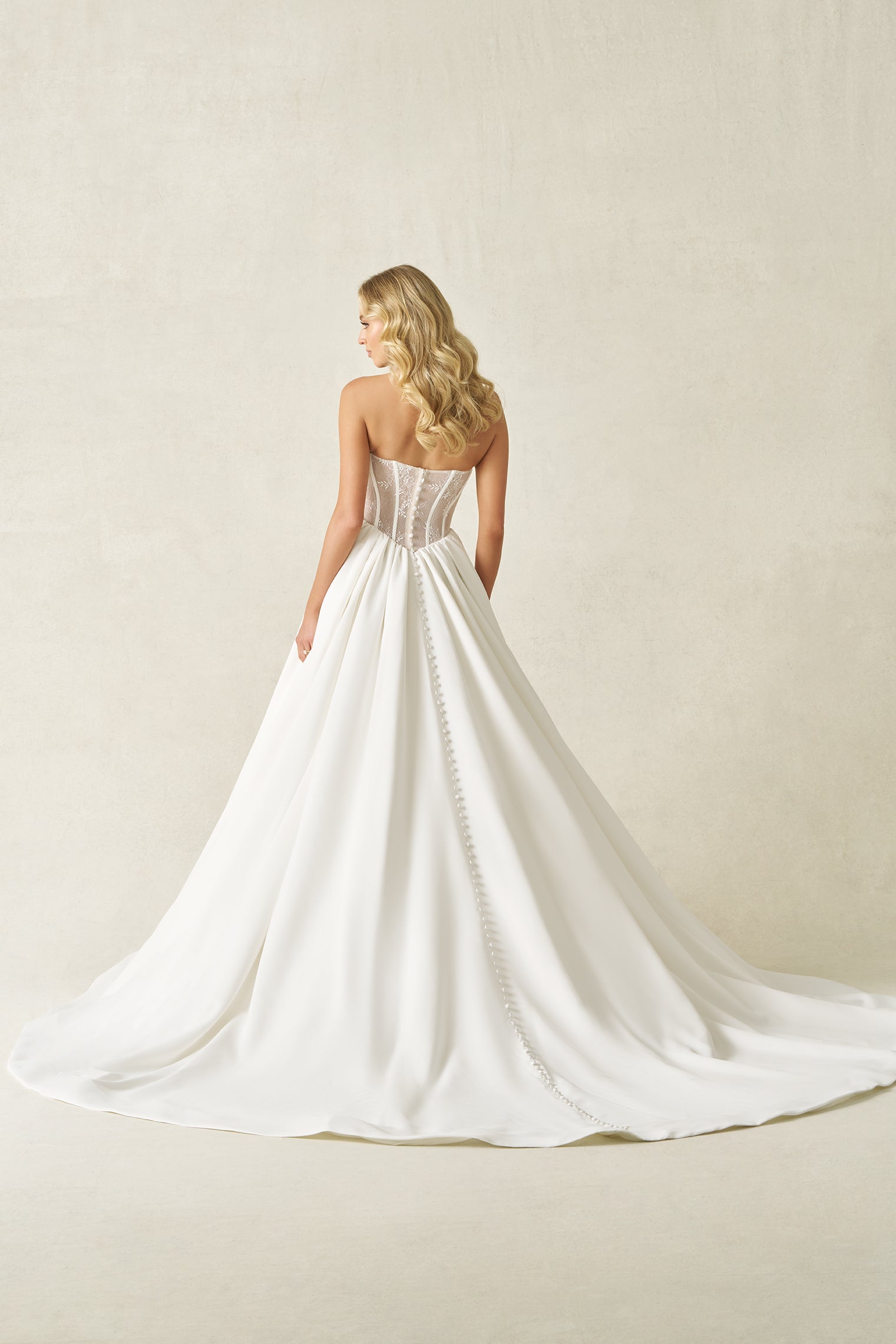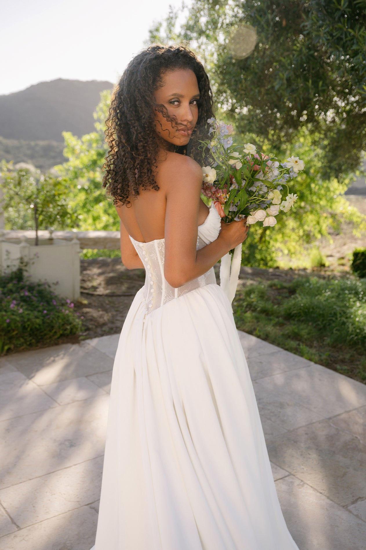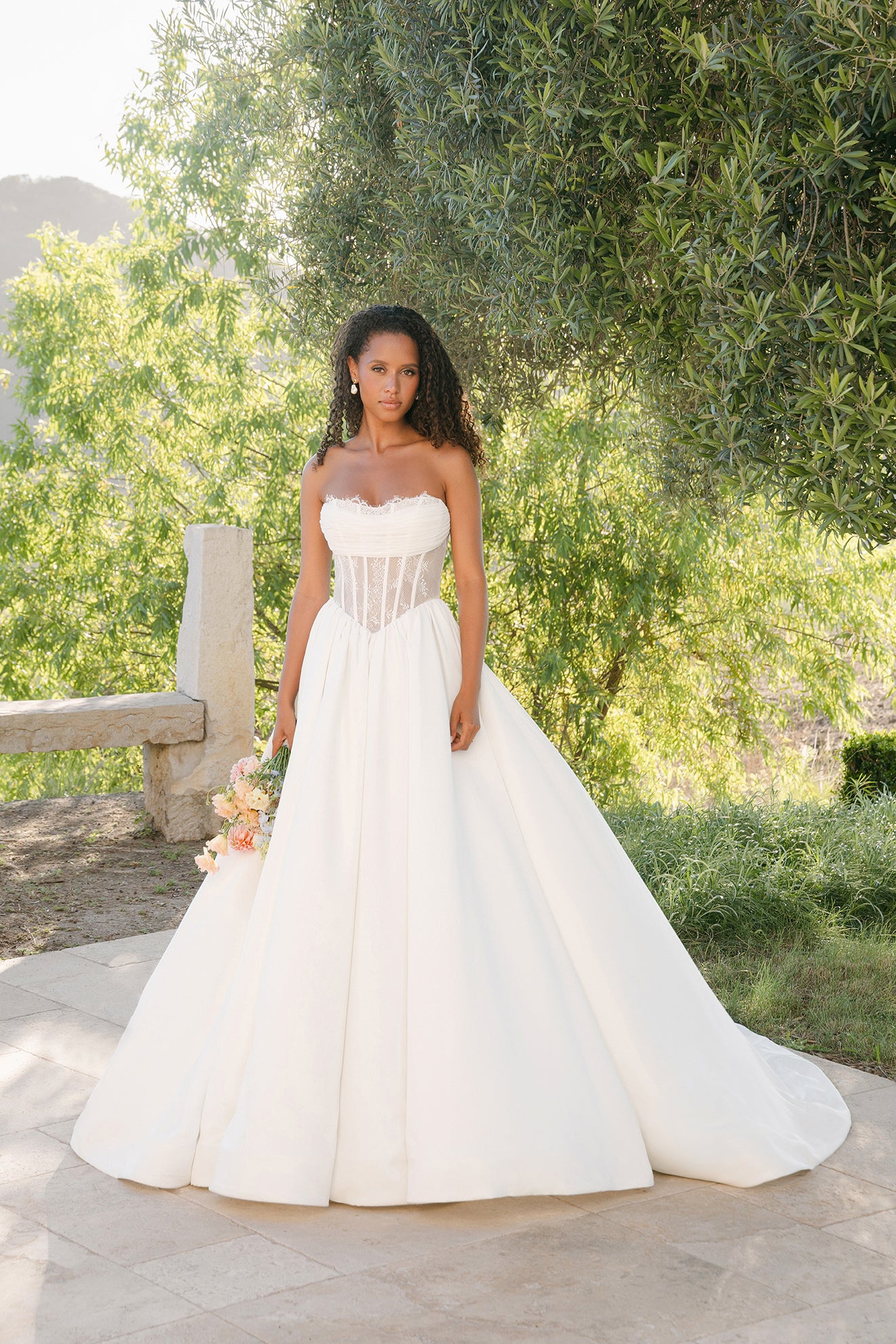 A fusion of texture and structure, this A-line gown features a Chantilly lace bodice with exposed boning and a sheer, corseted design that flatters the figure. Soft ruching of dove satin along the bust adds dimension and contrast against the lace’s intricate pattern. The basque waist transitions into a flowing satin skirt, creating a look that feels effortlessly refined and romantic. Read Less