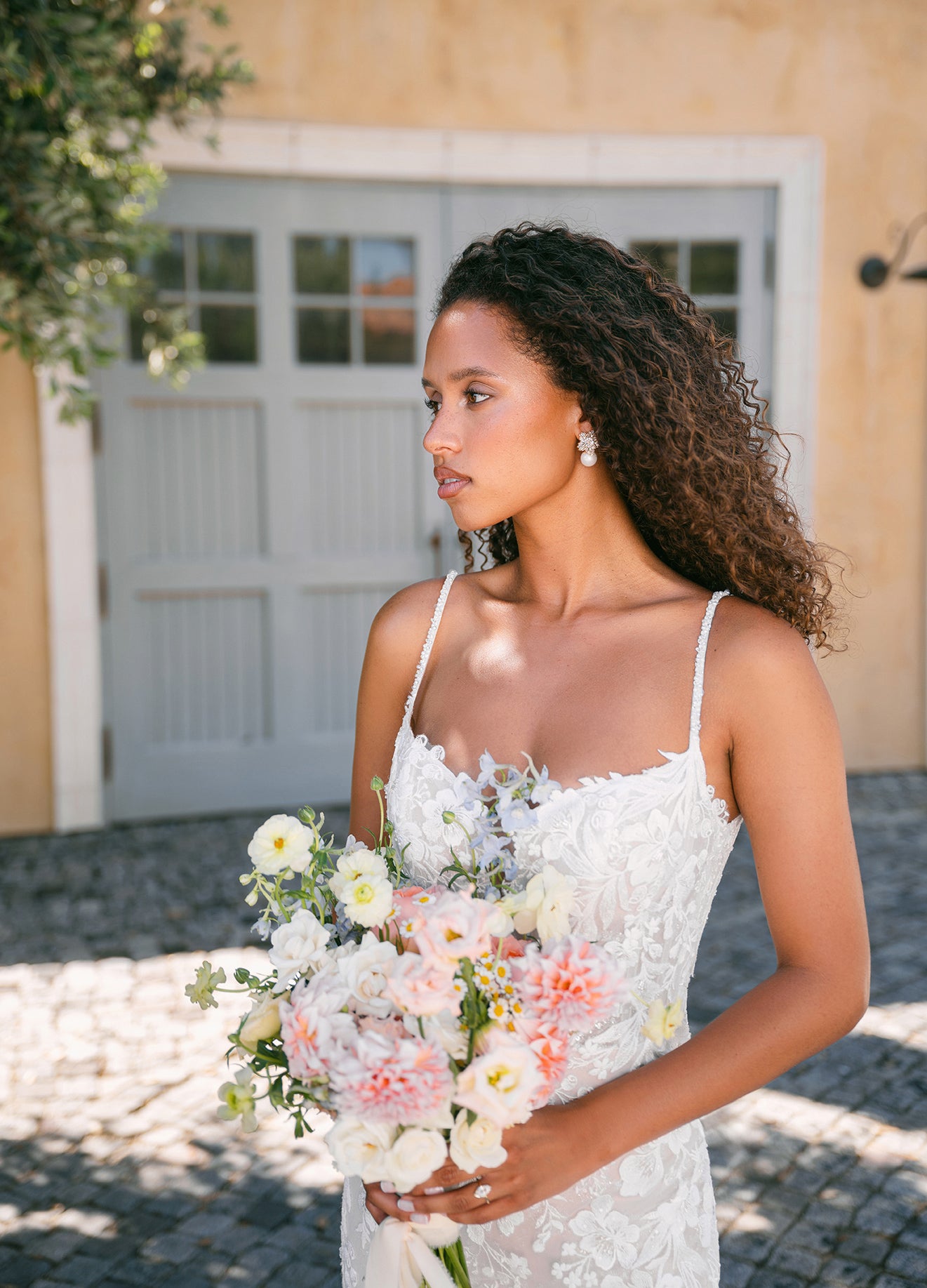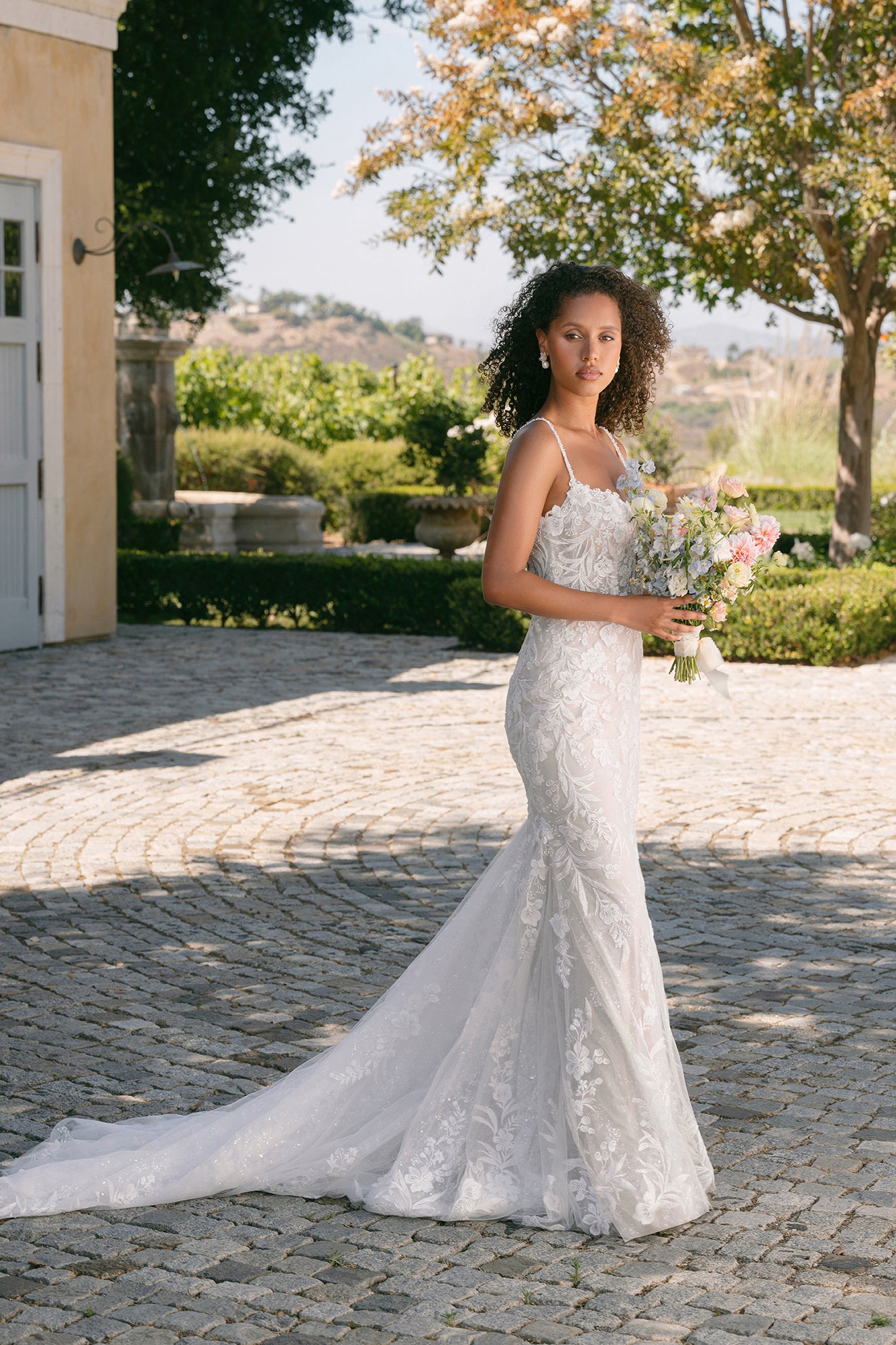This shimmering sheath gown combines modern allure with delicate detailing. Beaded and sequin lace appliques trail over layers of sequin and sparkle tulle, catching the light with every movement. The V-neck bodice and slender spaghetti straps create a graceful, feminine shape, while the low back and natural waist enhance the gown’s sleek, sculpted silhouette. Elegant and luminous, this design captures the perfect balance of texture, shimmer, and sophistication. Read Less
