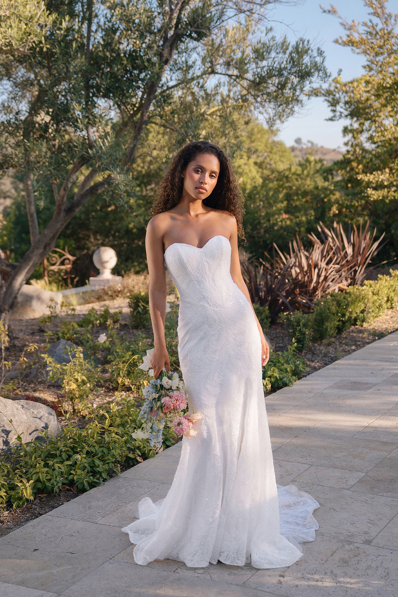 This sleek sheath gown showcases the beauty of corded lace with subtle sequin beading that adds soft, dimensional shimmer. The strapless sweetheart bodice features a sculpted basque waist that enhances the silhouette with elegant structure, while the smooth satin base creates a clean, modern finish. Designed for versatility, this gown pairs seamlessly with Train Style A1420T for added volume and dramatic movement. Read Less
