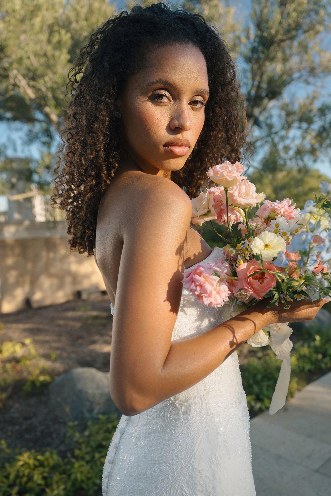 This sleek sheath gown showcases the beauty of corded lace with subtle sequin beading that adds soft, dimensional shimmer. The strapless sweetheart bodice features a sculpted basque waist that enhances the silhouette with elegant structure, while the smooth satin base creates a clean, m... Read More