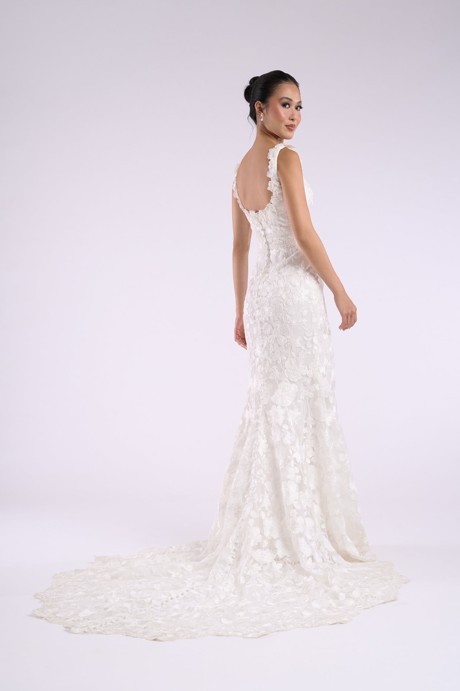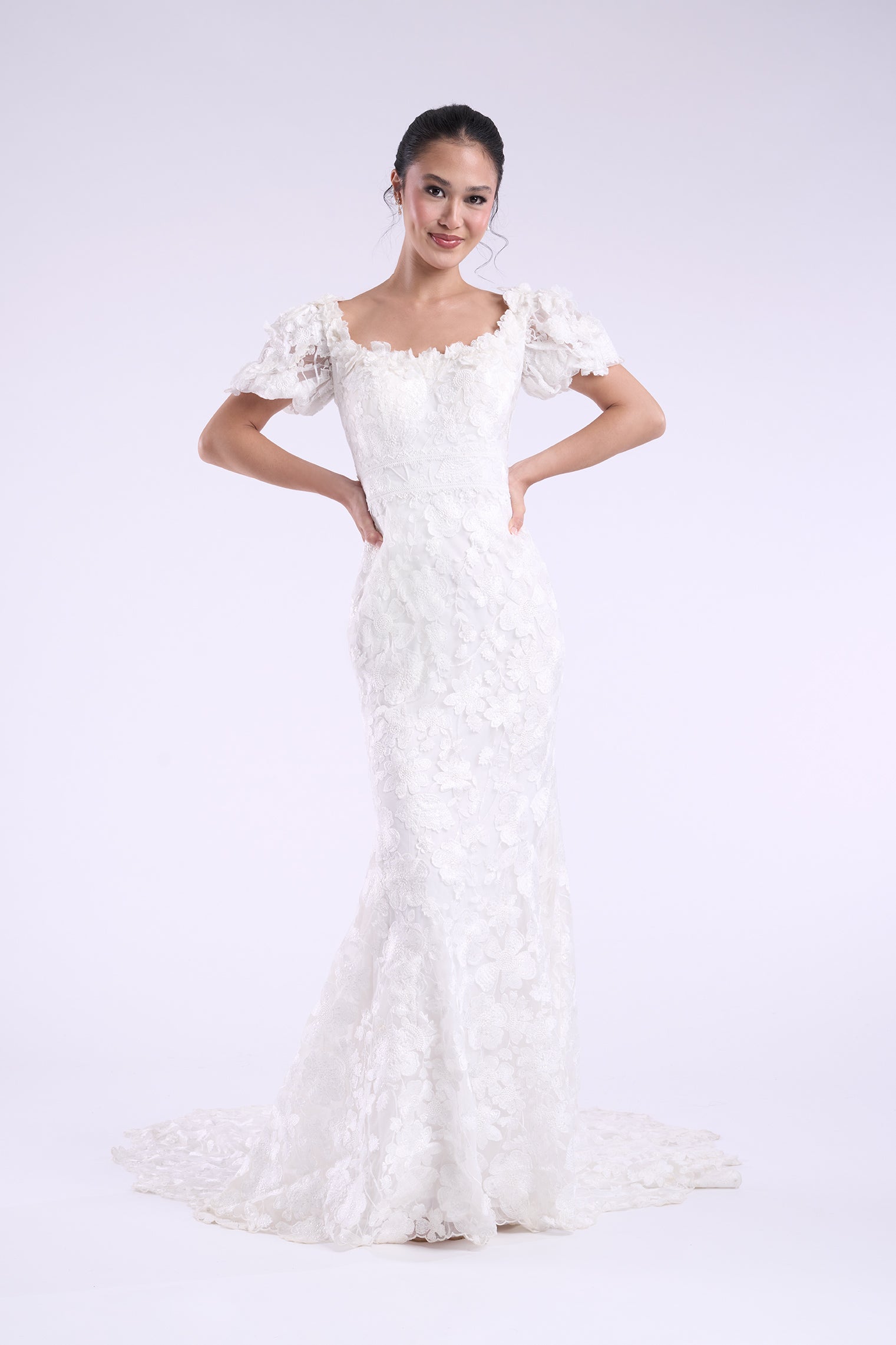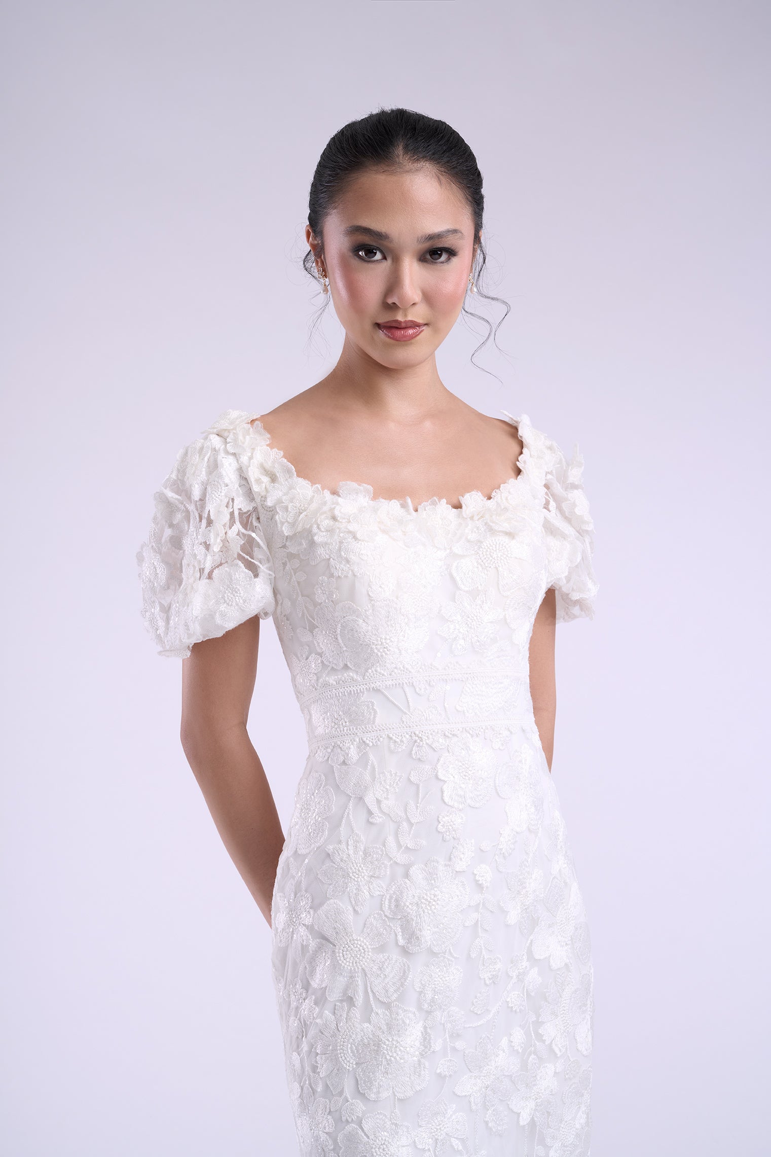The Daphne gown is a vision of modern elegance in lavender and ivory, crafted with sparkling sequin lace appliques over soft stretch jersey. This sheath wedding dress features a scoop neckline and natural waistline, skimming the figure with graceful ease before flowing into a floor-length silhouette. Detachable lace sleeves offer versatile styling—romantic for the ceremony, effortless for the celebration. Much like Daphne Bridgerton herself, this gown blends sweetness with quiet strength, ensuring the bride is both captivating and unforgettable.   Read Less