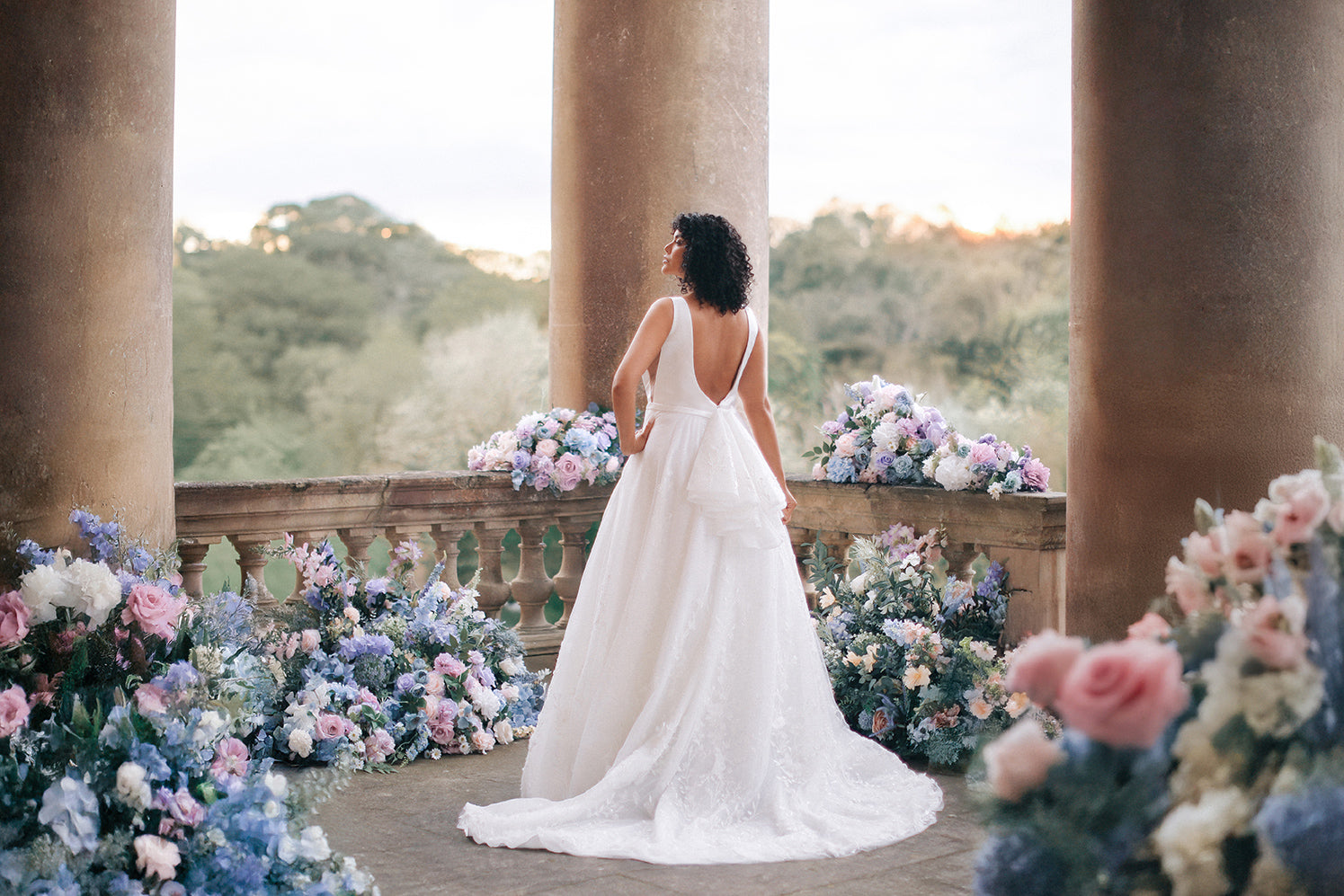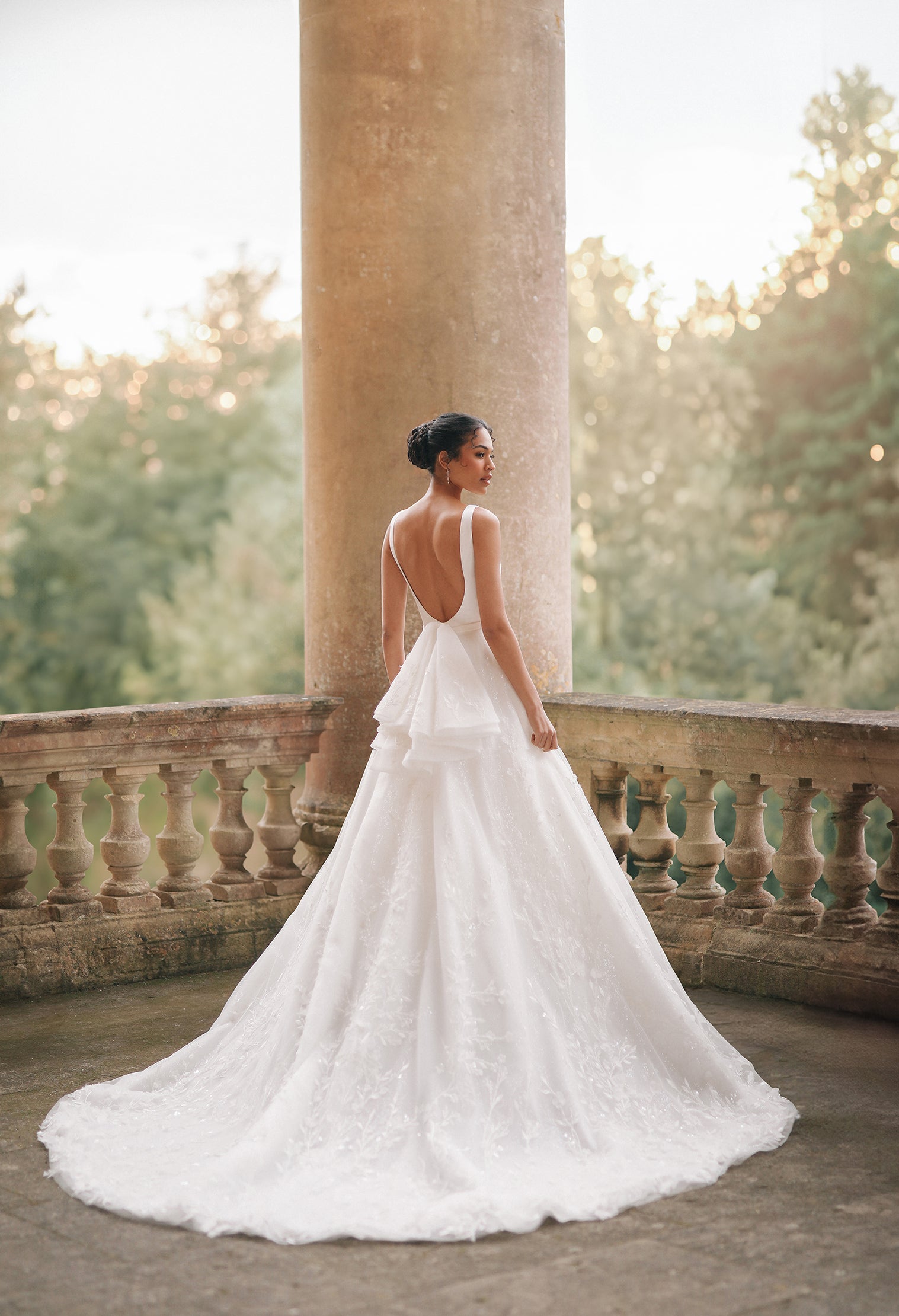 The Young Violet gown is a romantic ballgown that captures both sparkle and sophistication. An ivory satin bodice with a flattering V-neckline flows into a natural waistline and a full, floor-length tulle skirt embellished with shimmering sparkle layers and intricate beaded lace appliqués. The sleeveless design balances modern elegance with timeless bridal tradition, while lace and bow accents add a refined flourish. Much like Violet Bridgerton in her youth, this wedding dress is filled with grace and quiet strength—poised to capture every admiring glance. Read Less