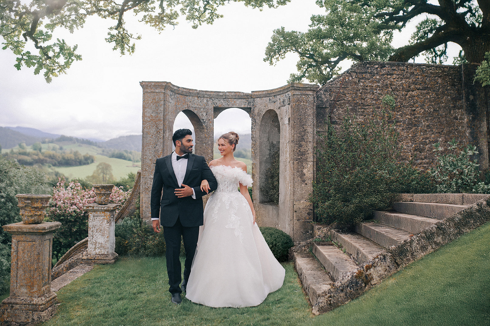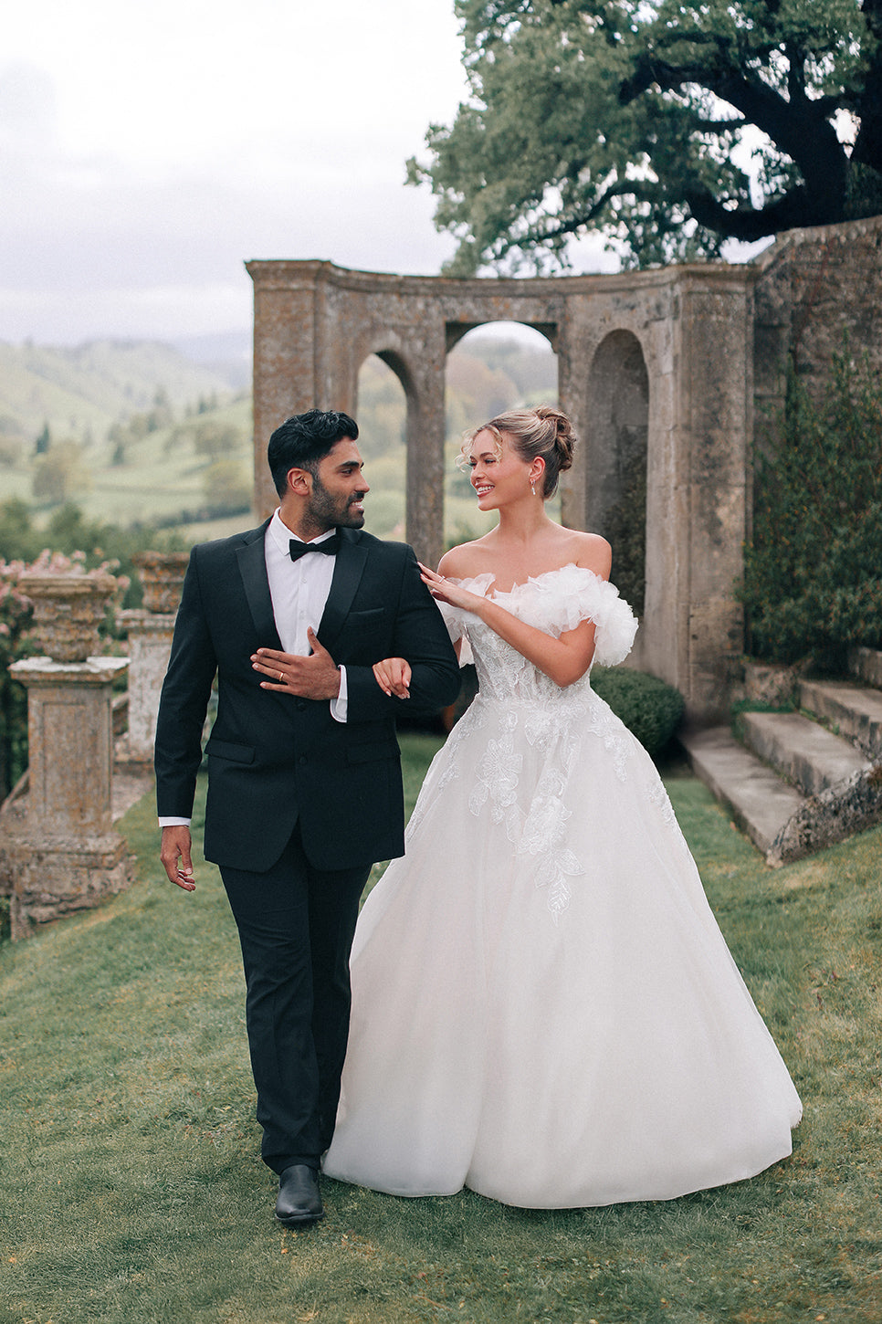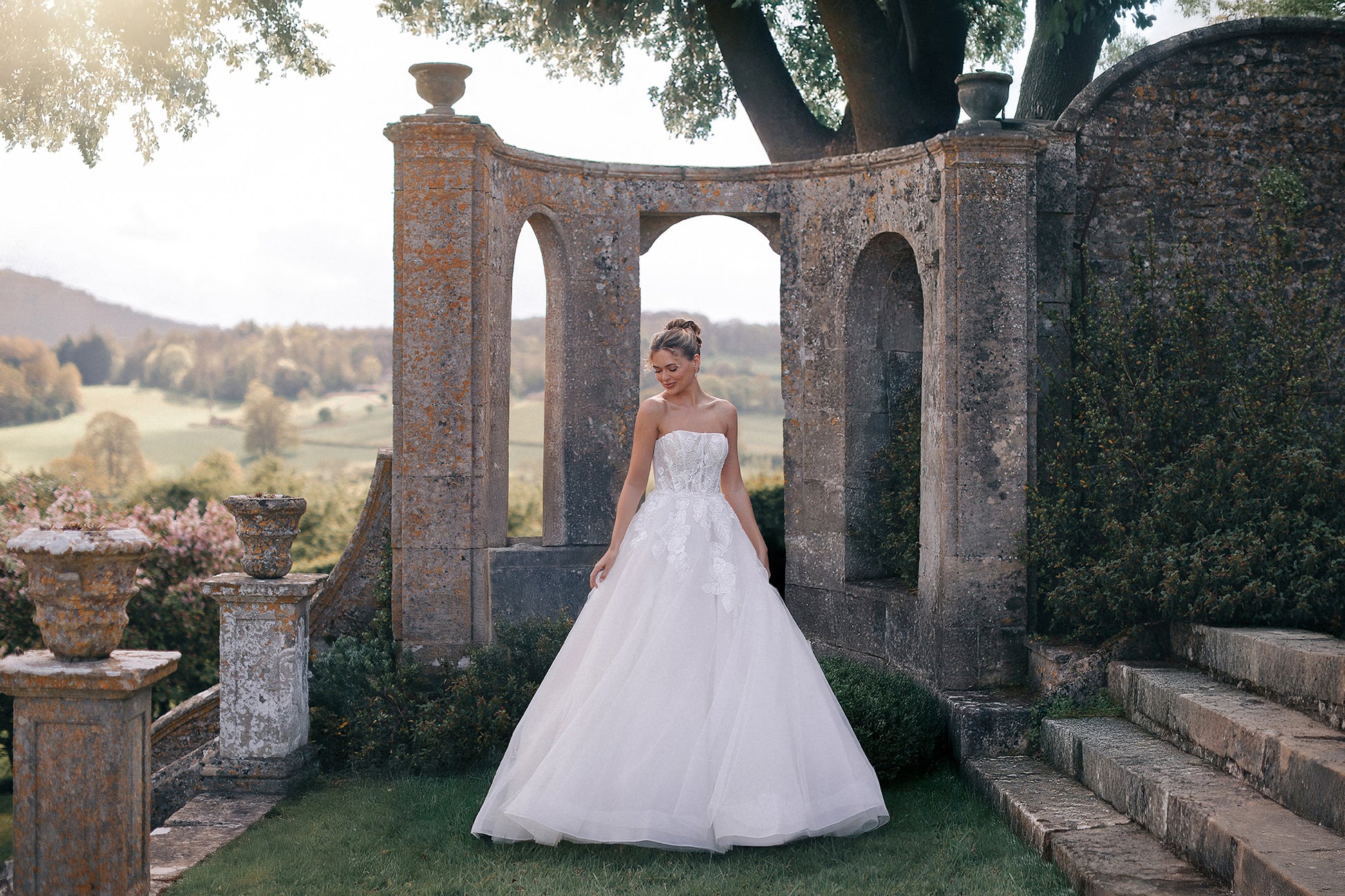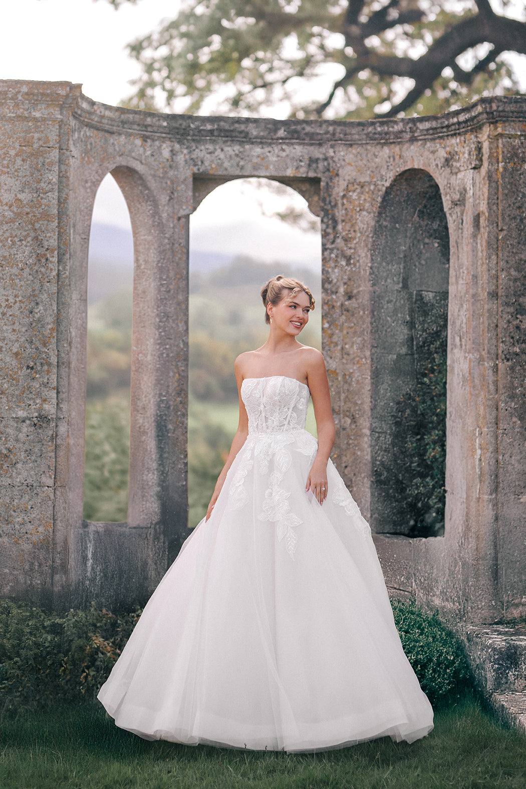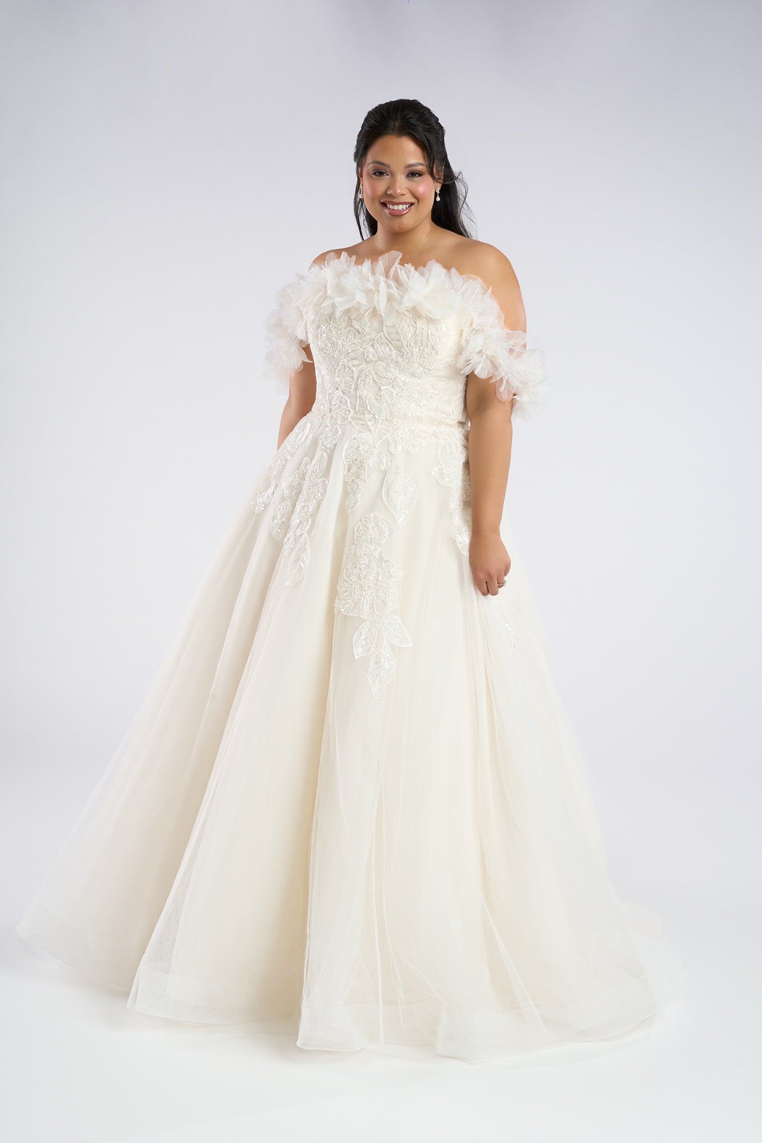 The Araminta gown is a romantic ballgown designed with layers of soft tulle and adorned with intricate beaded lace appliques. A strapless bodice with a natural waistline flows into a full, floor-length skirt, creating a silhouette of timeless elegance. Detachable off-the-shoulder lace s... Read More