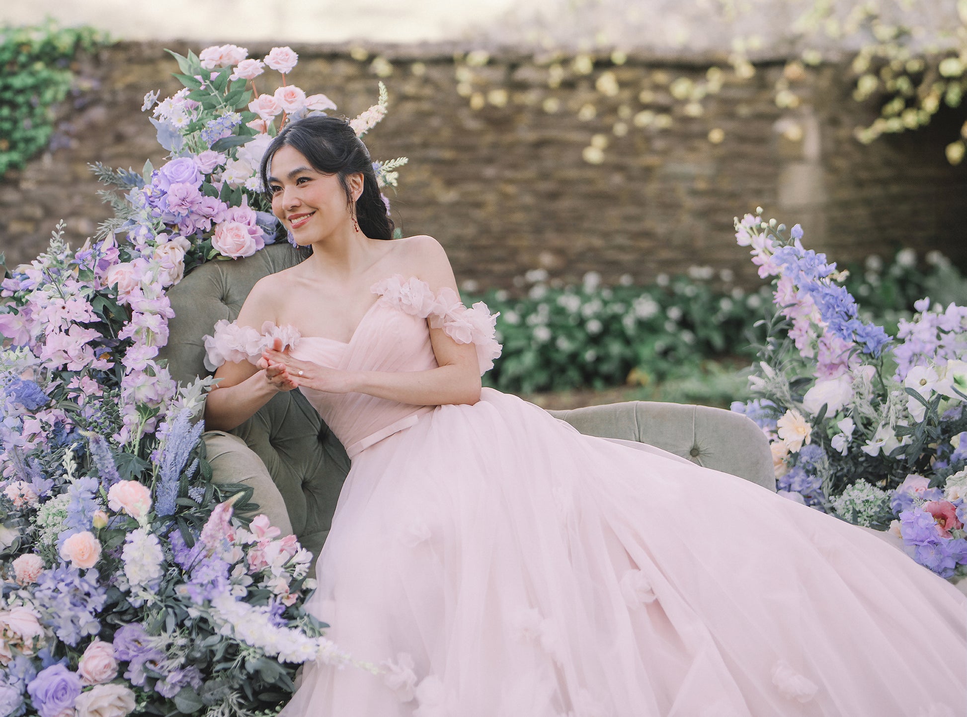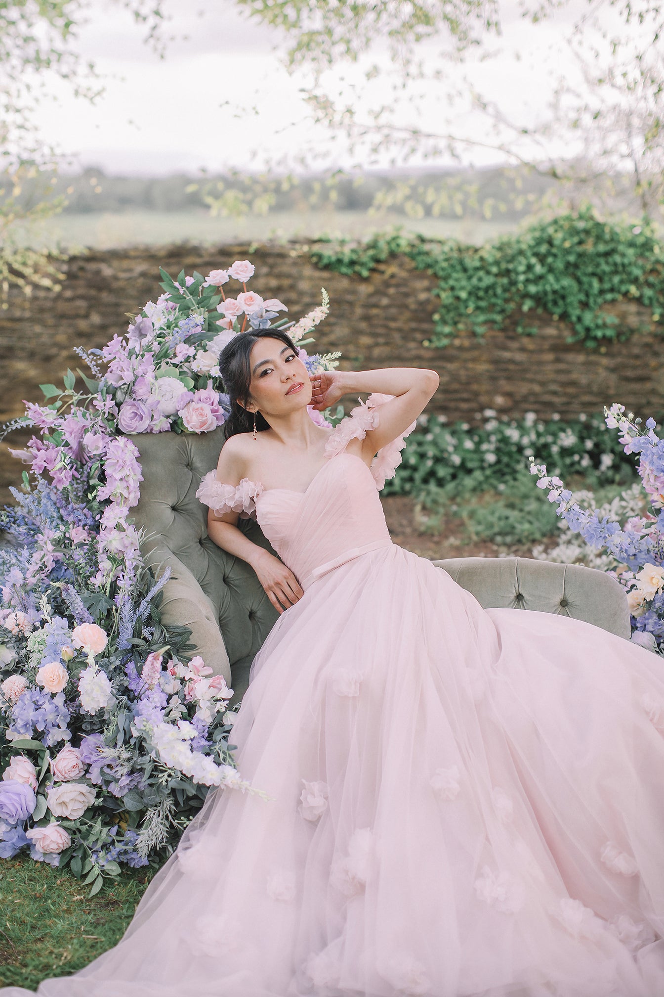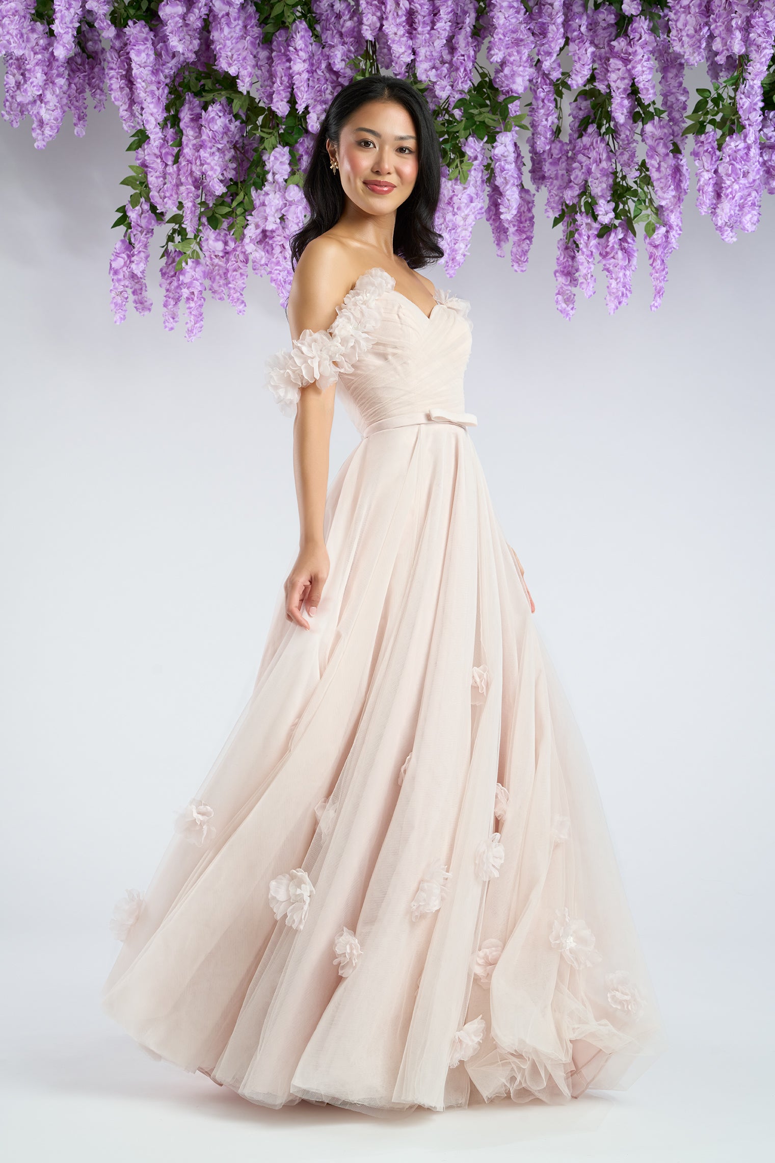 The Posey gown is a romantic A-line wedding dress crafted in airy tulle, adorned with delicate 3D floral appliqués that bloom across the skirt and straps. A strapless bodice with a natural waistline flows into a graceful, floor-length silhouette, while optional off-the-shoulder floral straps add a touch of whimsical charm. A soft bow detail completes the look, striking the perfect balance of sweetness and refinement. Much like Posey herself, this gown carries an enchanting charm—gentle, graceful, and destined to be remembered. Read Less
