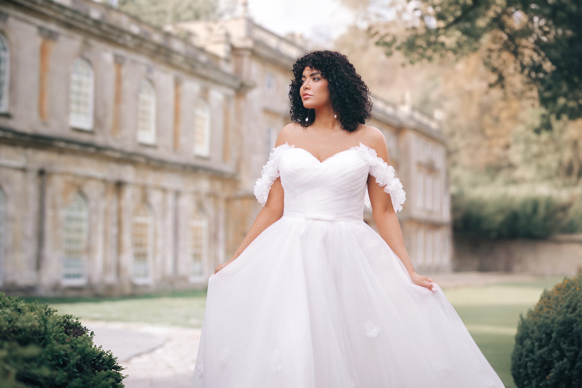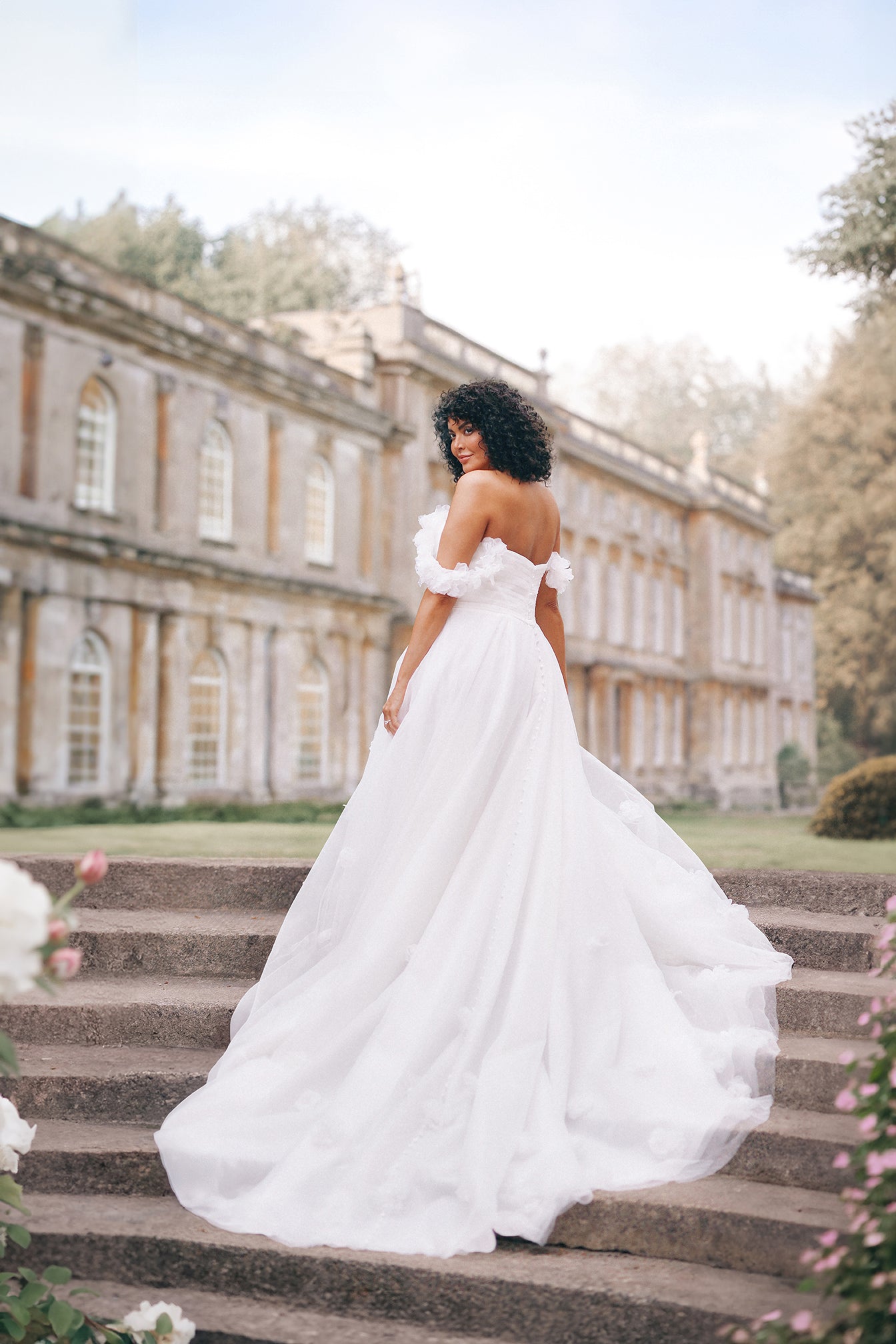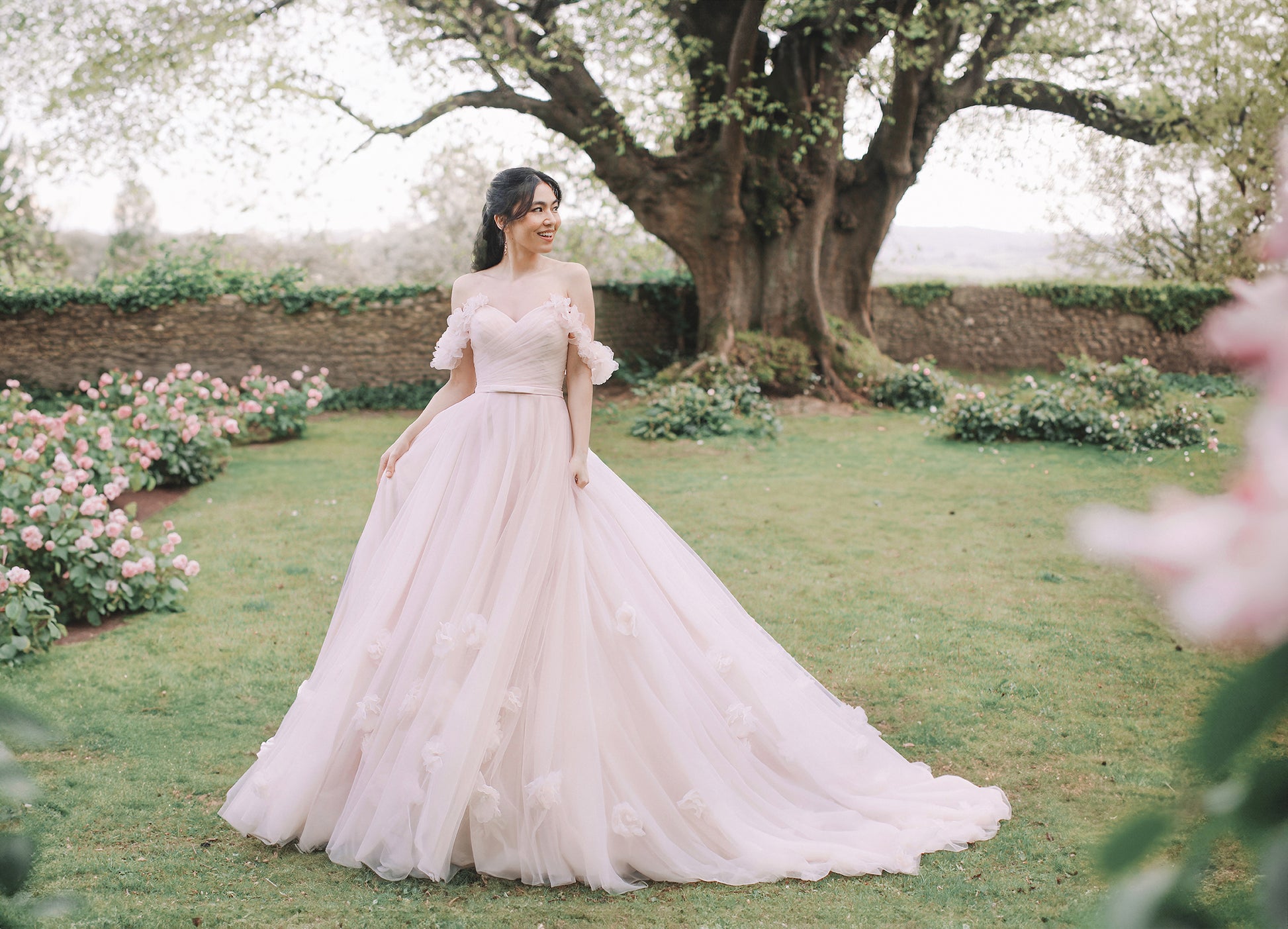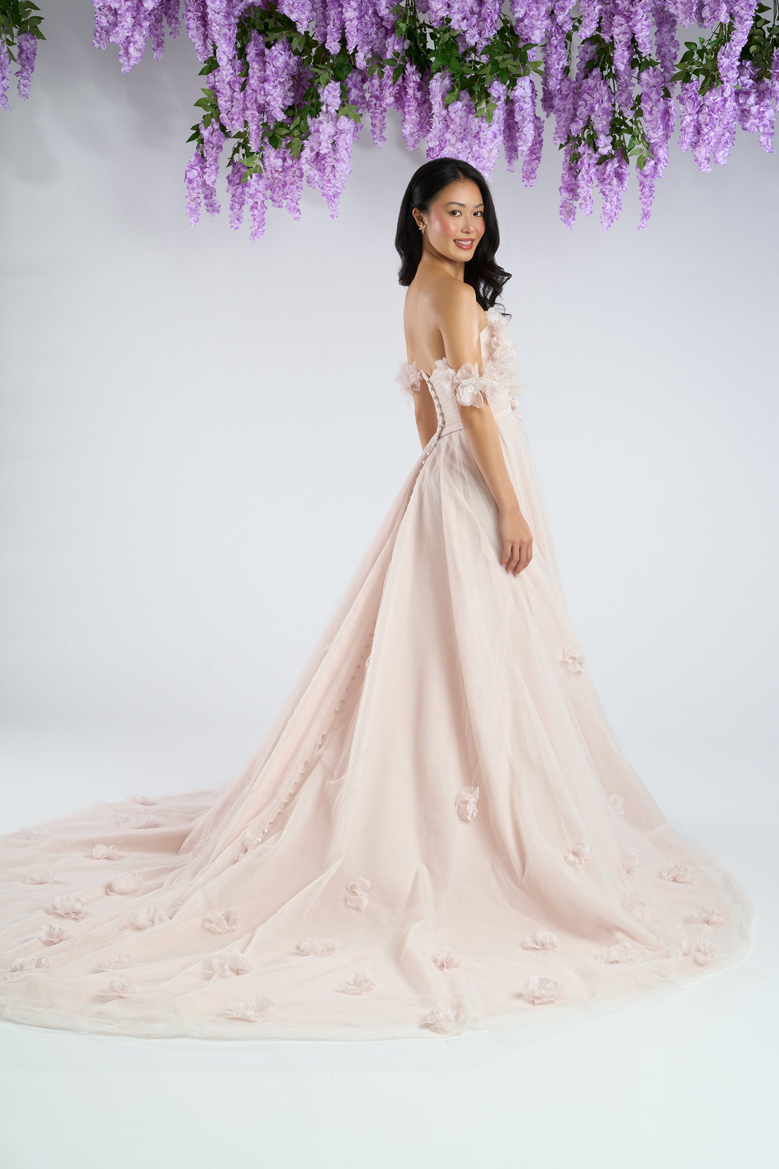 The Posey gown is a romantic A-line wedding dress crafted in airy tulle, adorned with delicate 3D floral appliqués that bloom across the skirt and straps. A strapless bodice with a natural waistline flows into a graceful, floor-length silhouette, while optional off-the-shoulder floral s... Read More