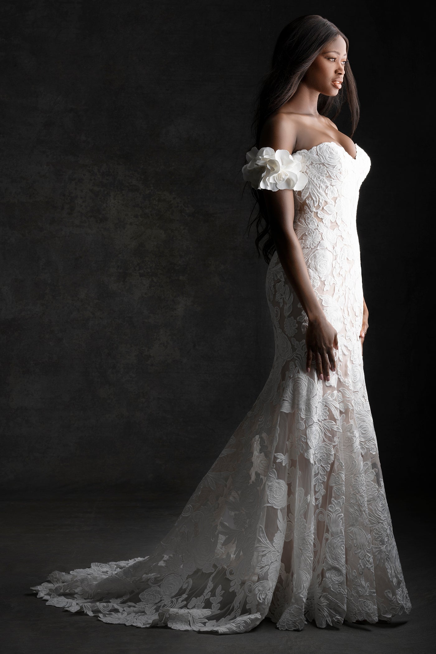 Blowsy matte lace blooms scatter along the fit and flare silhouette of this off-shoulder gown. Photographed with Veil V070C and detachable Cap Sleeves CP67.