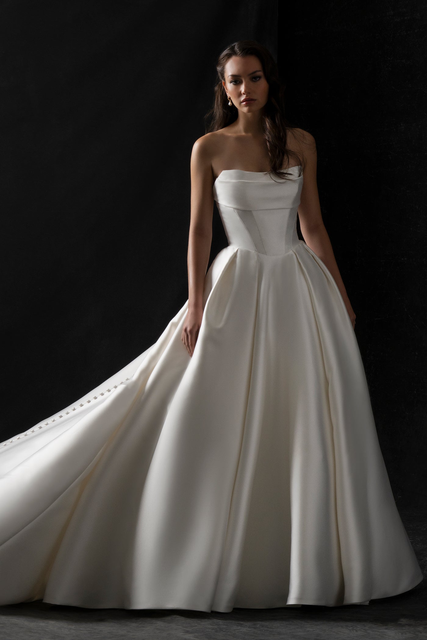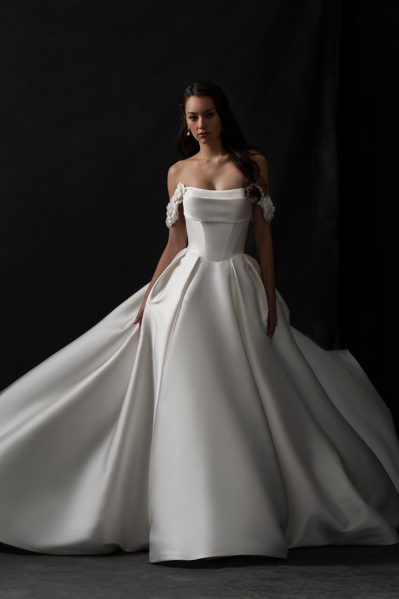 An understated Basque waist and pleated off-shoulder bustline lend a classical air to this stretch Mikado ballgown.