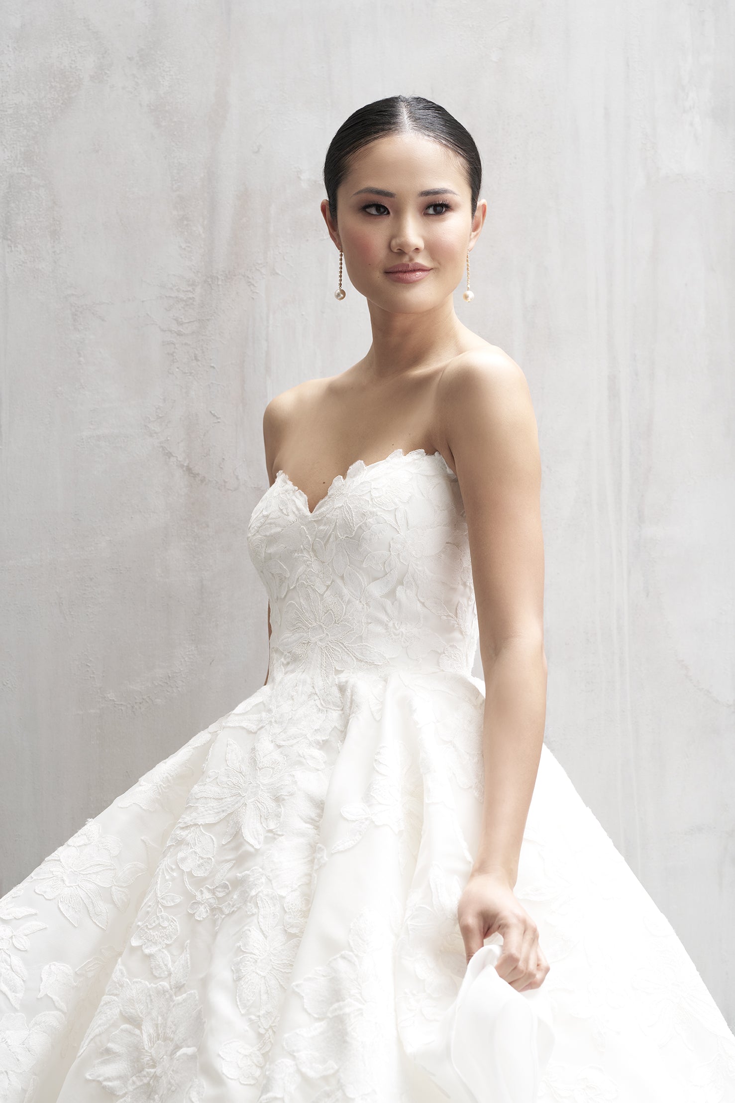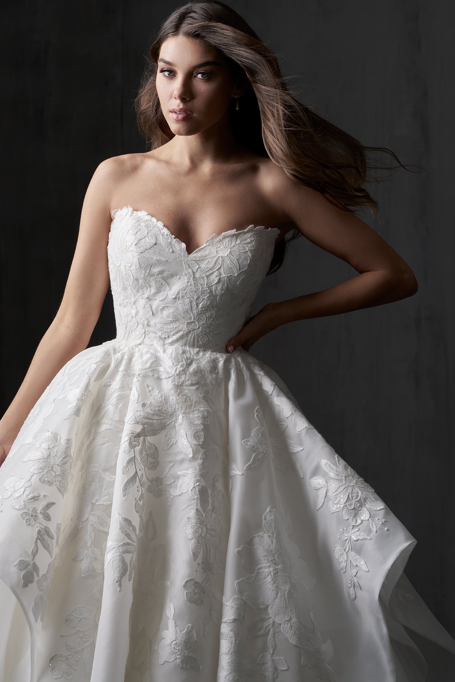 This ethereal ballgown features a strapless sweetheart neckline and a natural waistline that flows into a full, layered organza skirt. Bold sequin lace appliques bloom across the bodice and train, adding shimmer and dimension. Finished with covered buttons and a handkerchief hem, this gown moves with lightness and drama in every step. Read Less