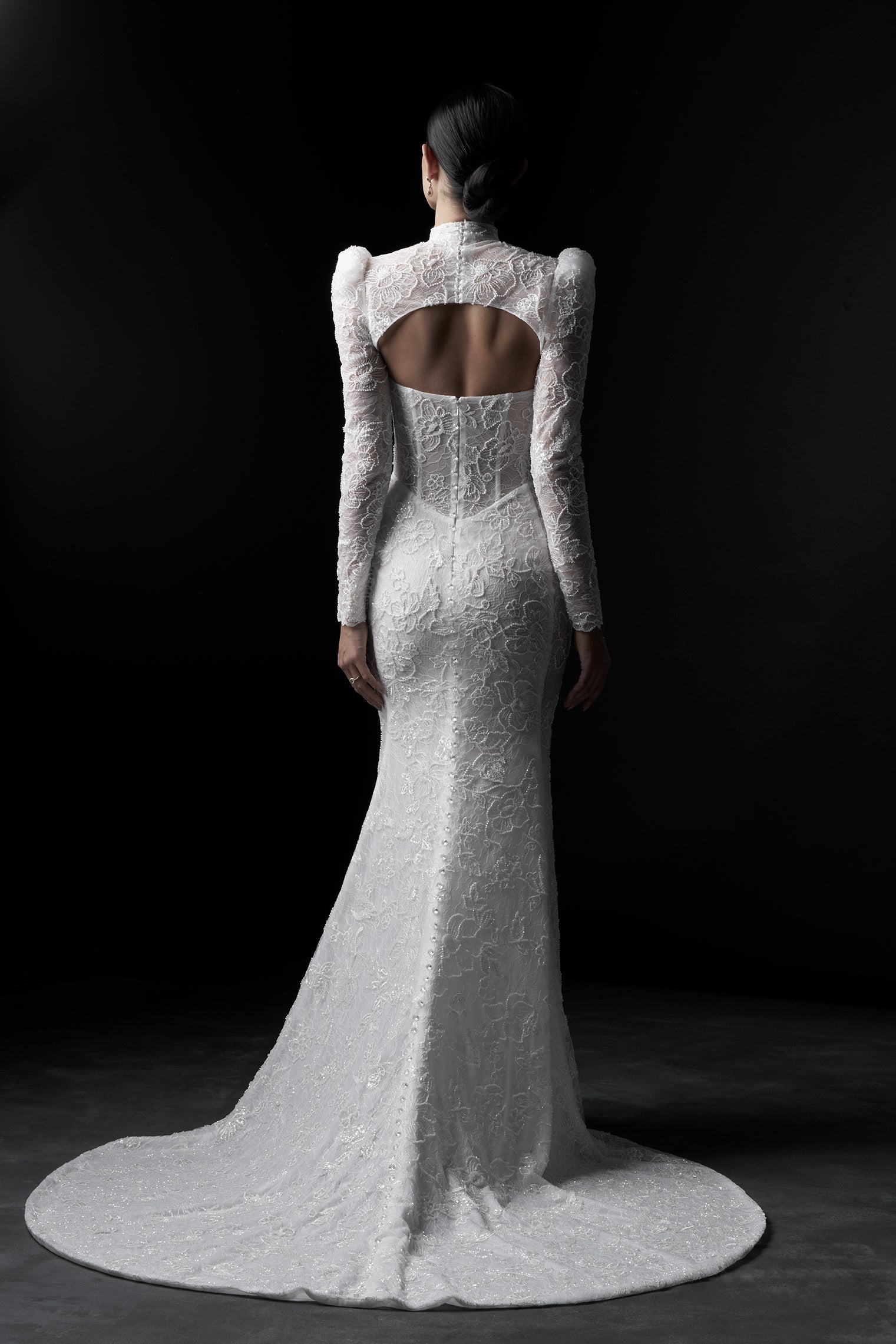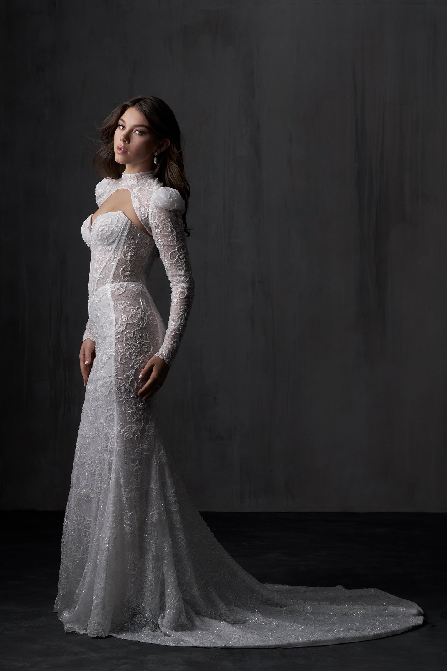 Designed to pair seamlessly with style C782, this dramatic accessory jacket features a high neckline, padded shoulders, and full-length sleeves. Crafted to add structure and presence, the jacket transforms the gown into a bold, high-fashion statement—perfect for a grand ceremony entrance or layered reception look. Read Less
