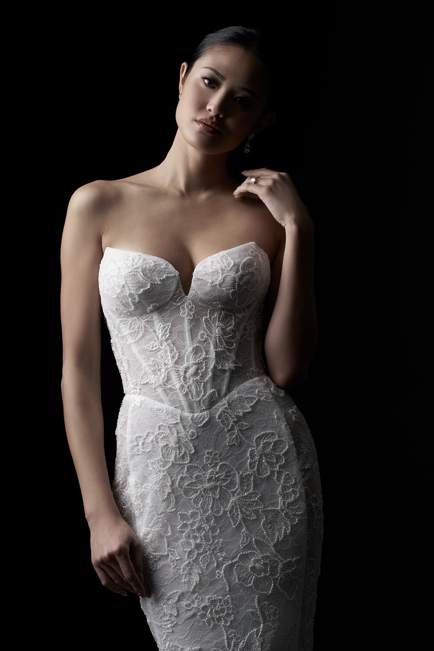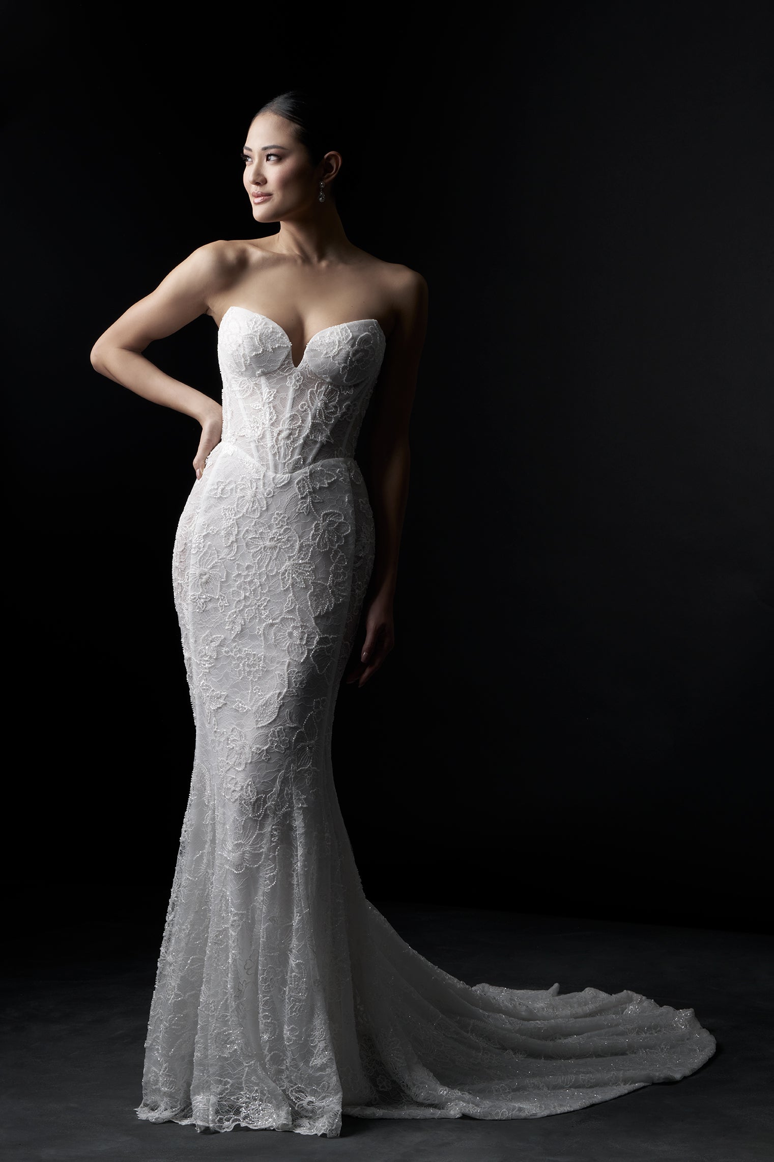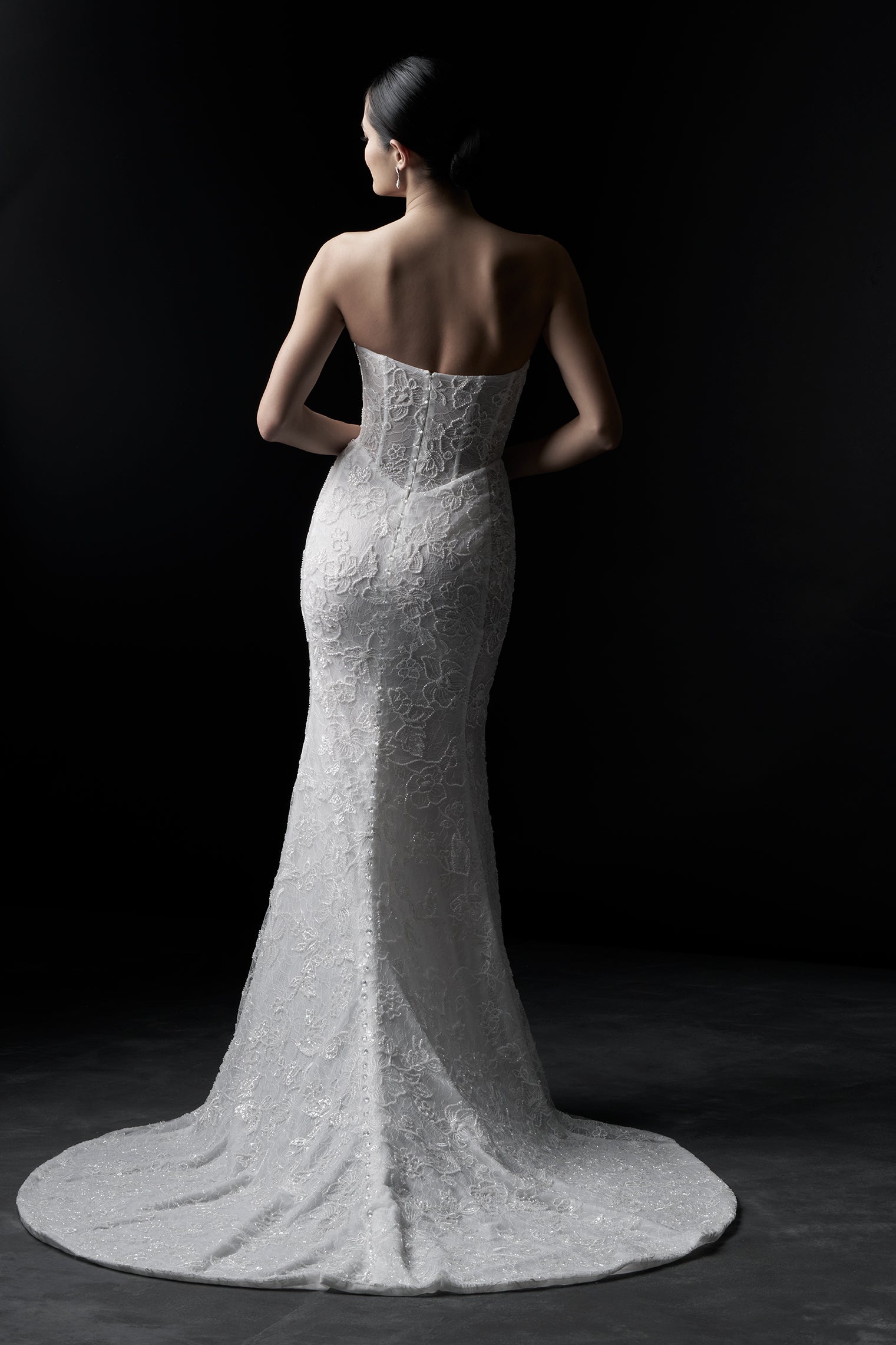 This sleek sheath gown is designed to sculpt and streamline. A strapless sweetheart neckline meets a soft Basque waistline, with beaded sequin lace appliqués and sheer side panels that trace from bodice to hem. A lined version is available for added structure and coverage. Please note: This style does not allow for custom changes. Read Less