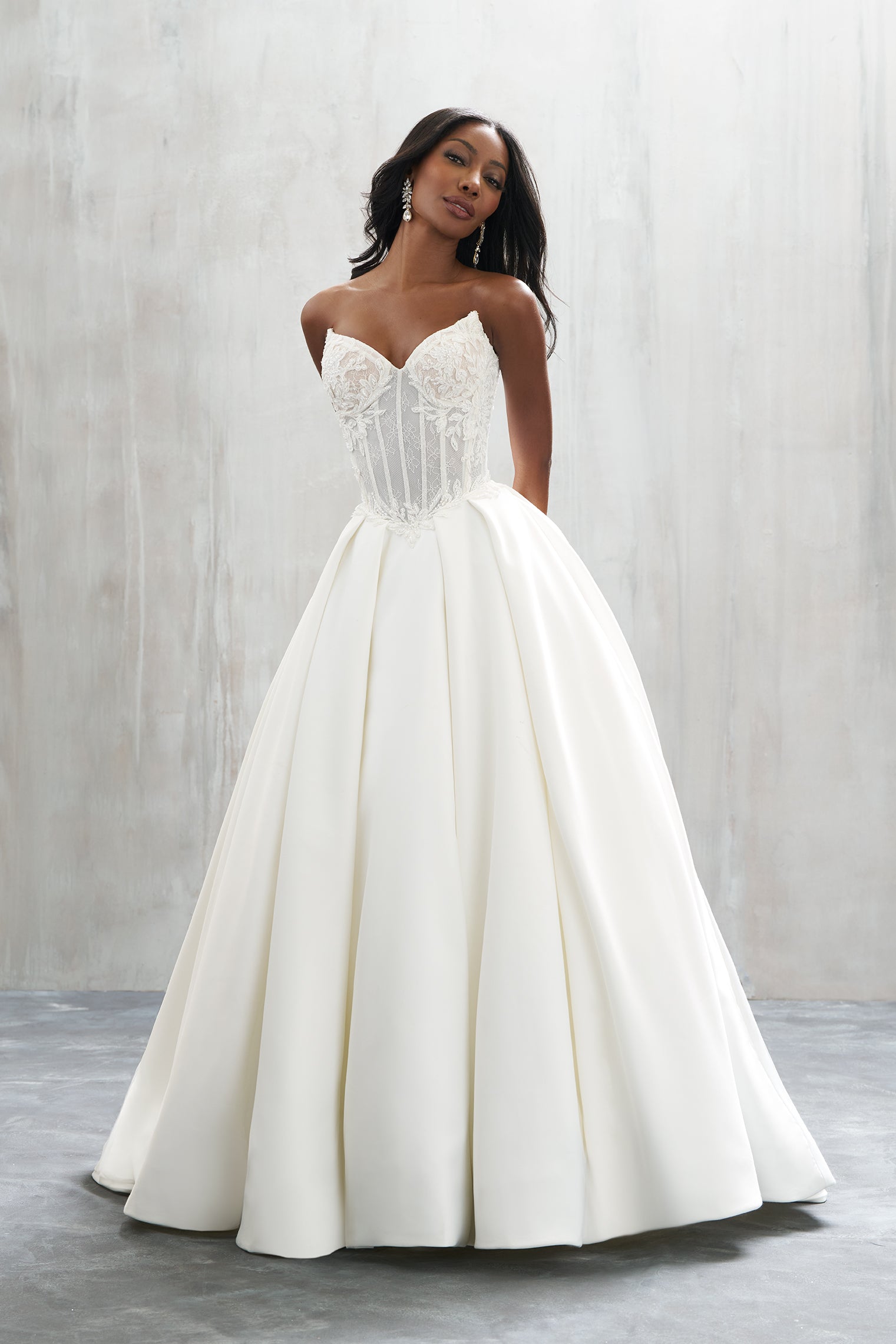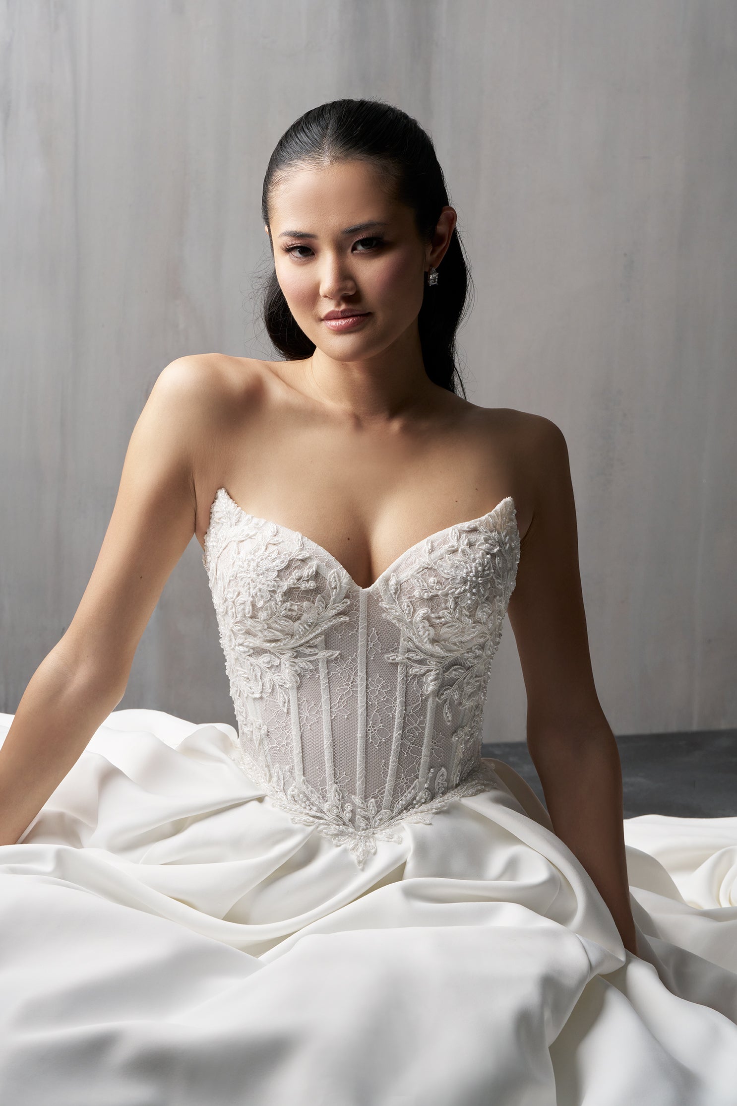 A dramatic ballgown silhouette sets the stage for this statement-making gown. The strapless cateye neckline crowns a lace bodice adorned with beaded and sequin appliques, complete with exposed boning for a modern corseted effect. A subtle Basque waist gives shape and structure, flowing into a full dove satin skirt that commands attention. Read Less