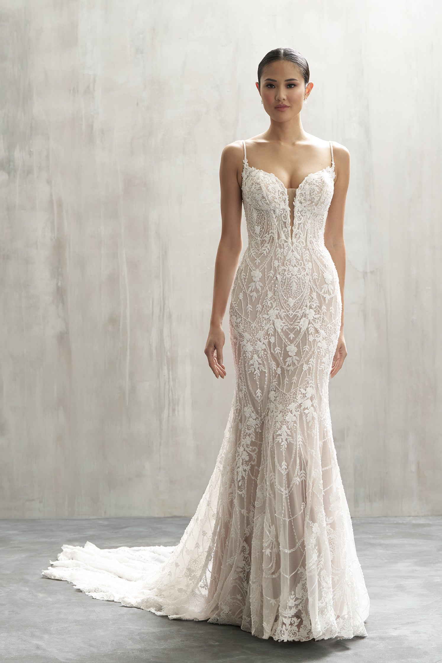 With a plunging sweetheart neckline and delicate spaghetti straps, this stretch sheath gown balances softness and edge. Geometric beaded and sequin lace adds bold texture through the bodice, while covered buttons trail down the back of the sleek silhouette for a clean, confident finish.