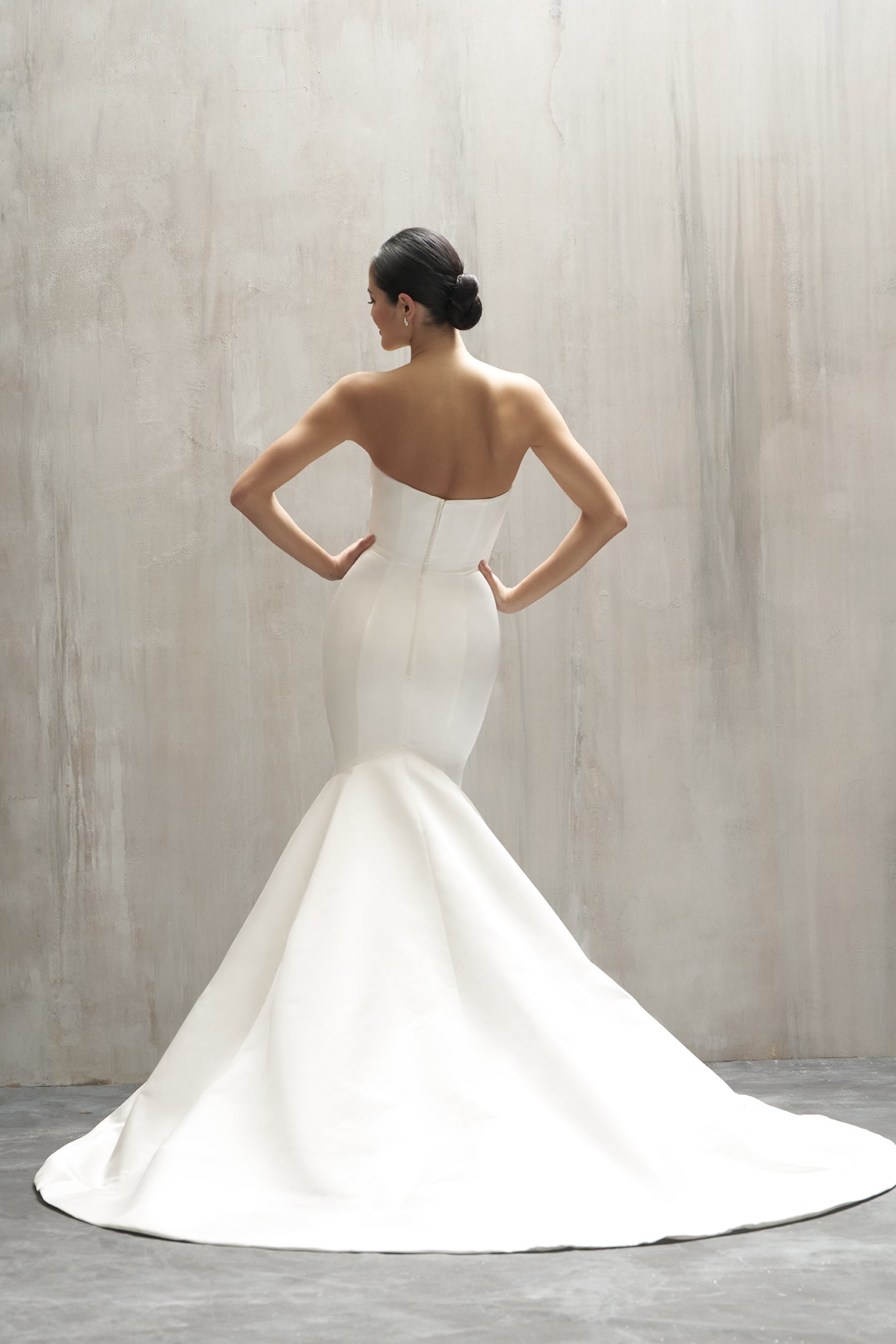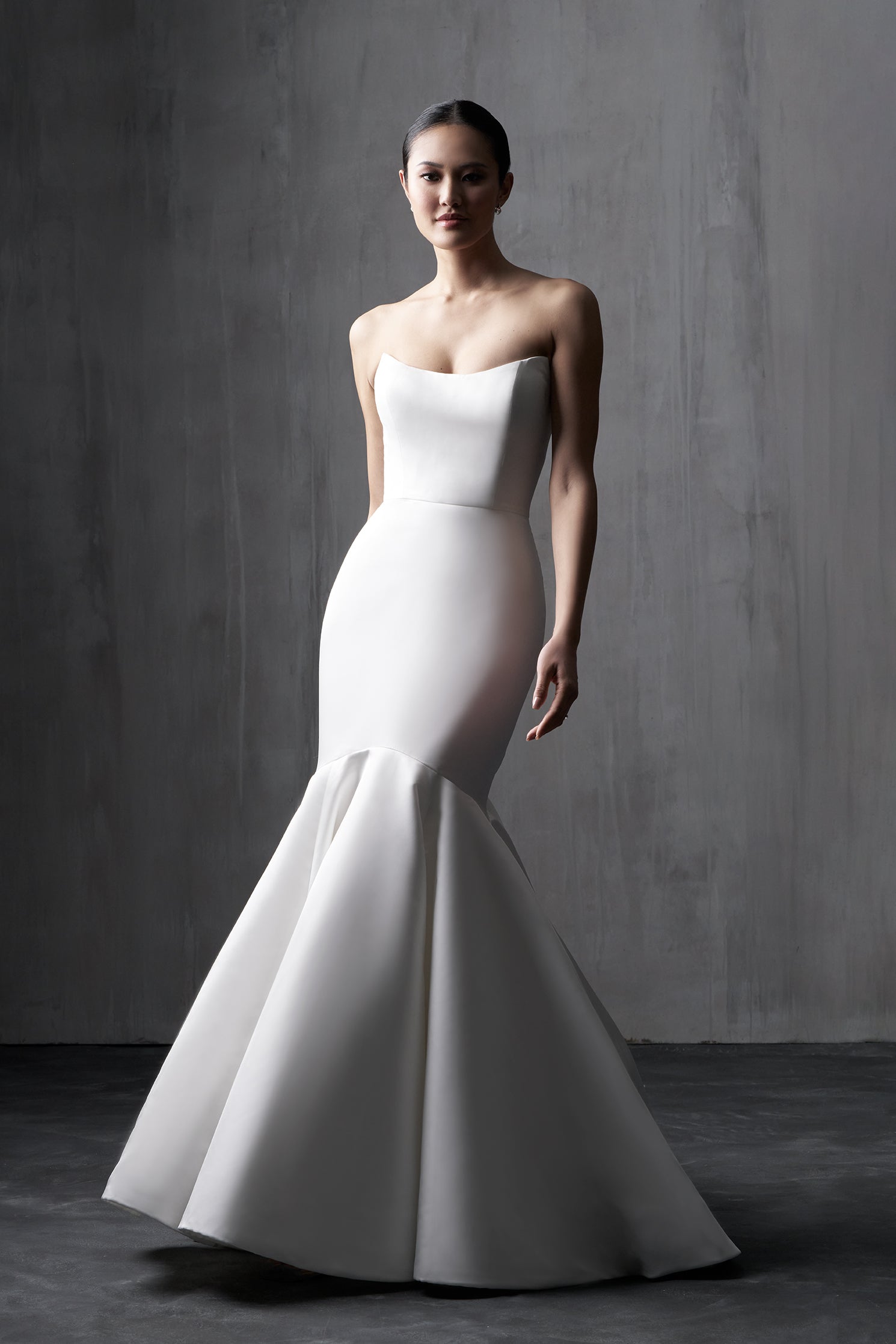 Sleek and striking, this satin mermaid gown brings dramatic flair with its contoured silhouette and flared skirt. A scoop neckline and sleeveless bodice create a clean, modern look, while the natural waistline adds definition. Minimalist at its core, this gown was made to accessorize—pe... Read More