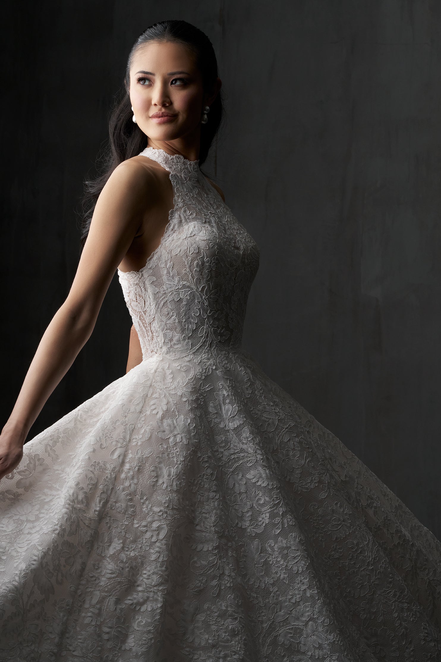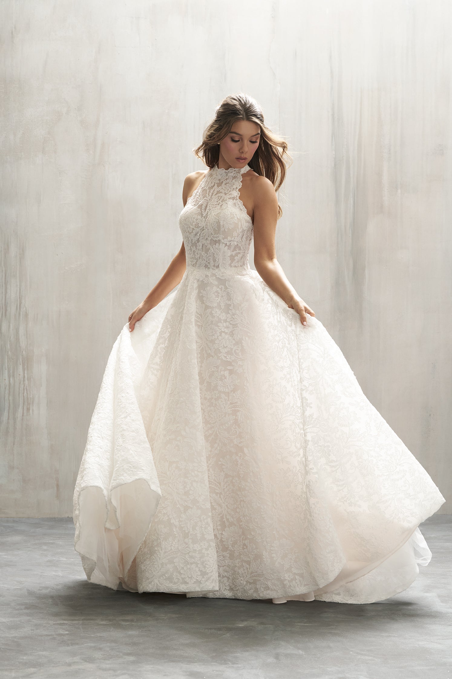 This all over sheet lace ballgown features a high halter neckline and a softly contoured bodice that flows into a full, sweeping skirt. Delicate texture and dramatic volume combine to create a silhouette that’s effortlessly timeless and full of quiet romance.
