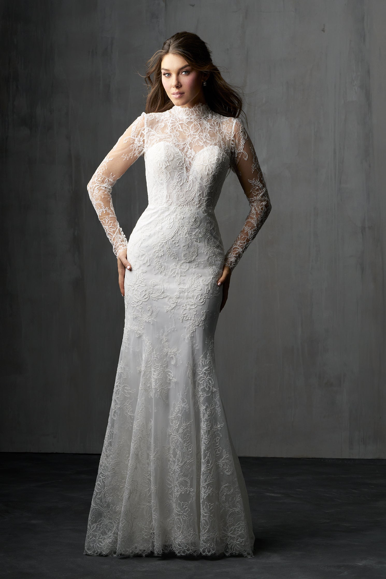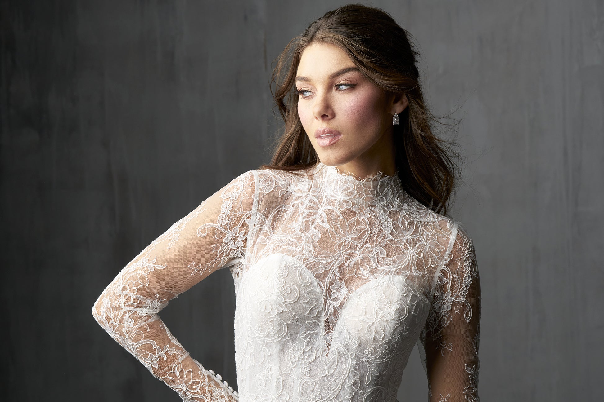 Delicate lace overlays a sculpted sweetheart bodice, framed by a sheer high neckline and long, fitted sleeves. The boldness lies in the sheer back, where covered buttons trail from neck to train, adding a striking finish to the soft sheath silhouette.