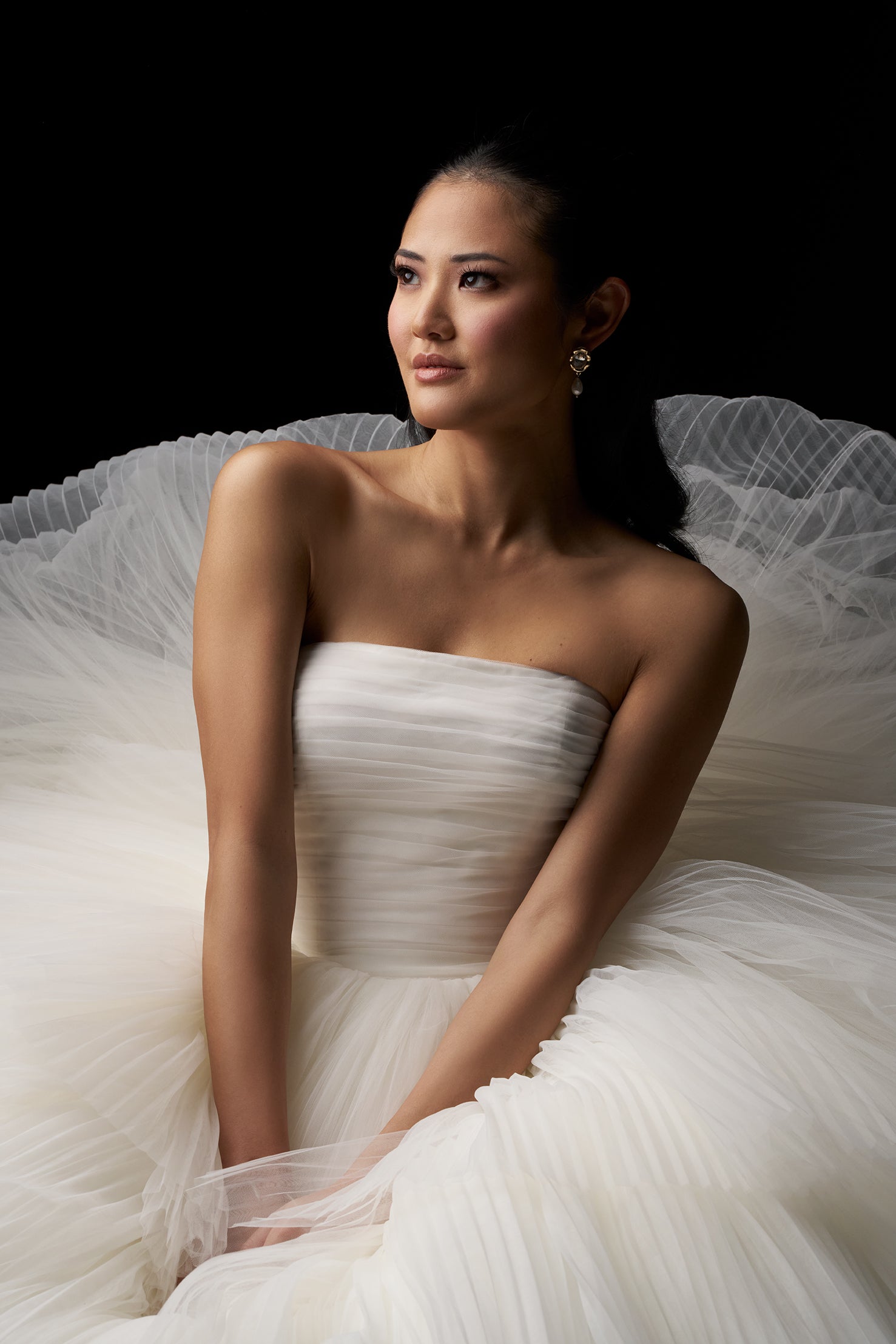 While crafted entirely from tulle, this gown is anything but simple. A ruched straight neckline and natural waist give way to a cascade of accordion-pleated tiers, creating airy volume and dimensional movement throughout the full skirt. Light, layered, and full of texture, it’s a study ... Read More