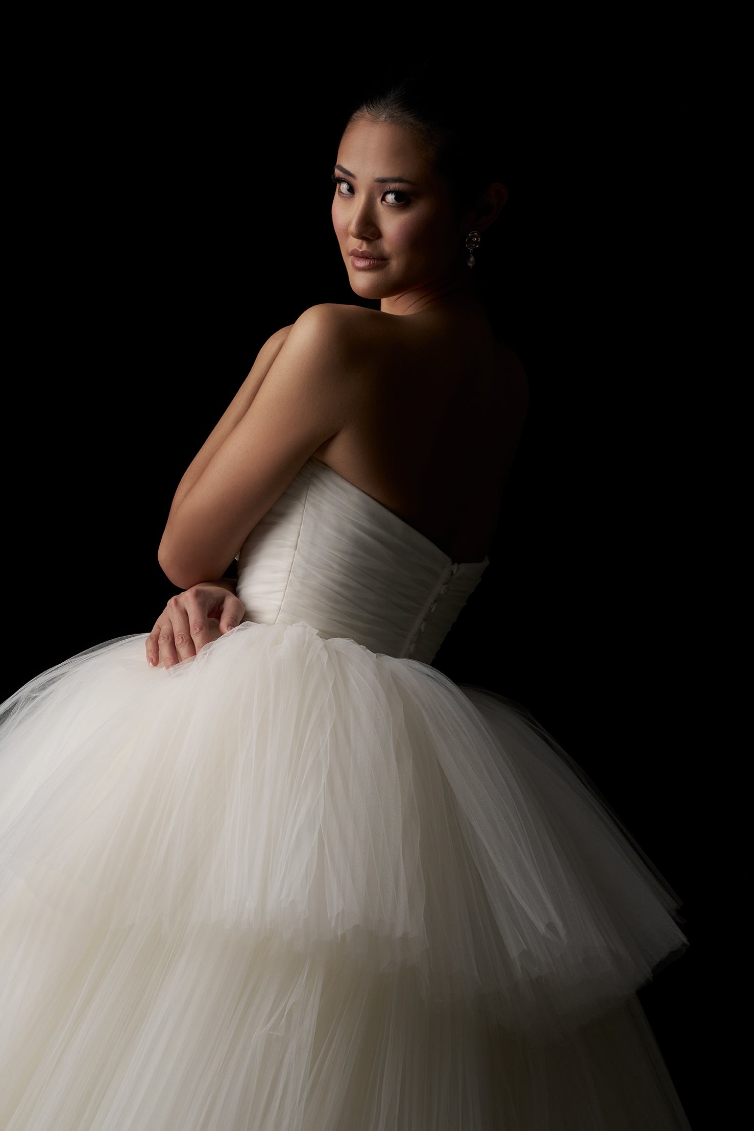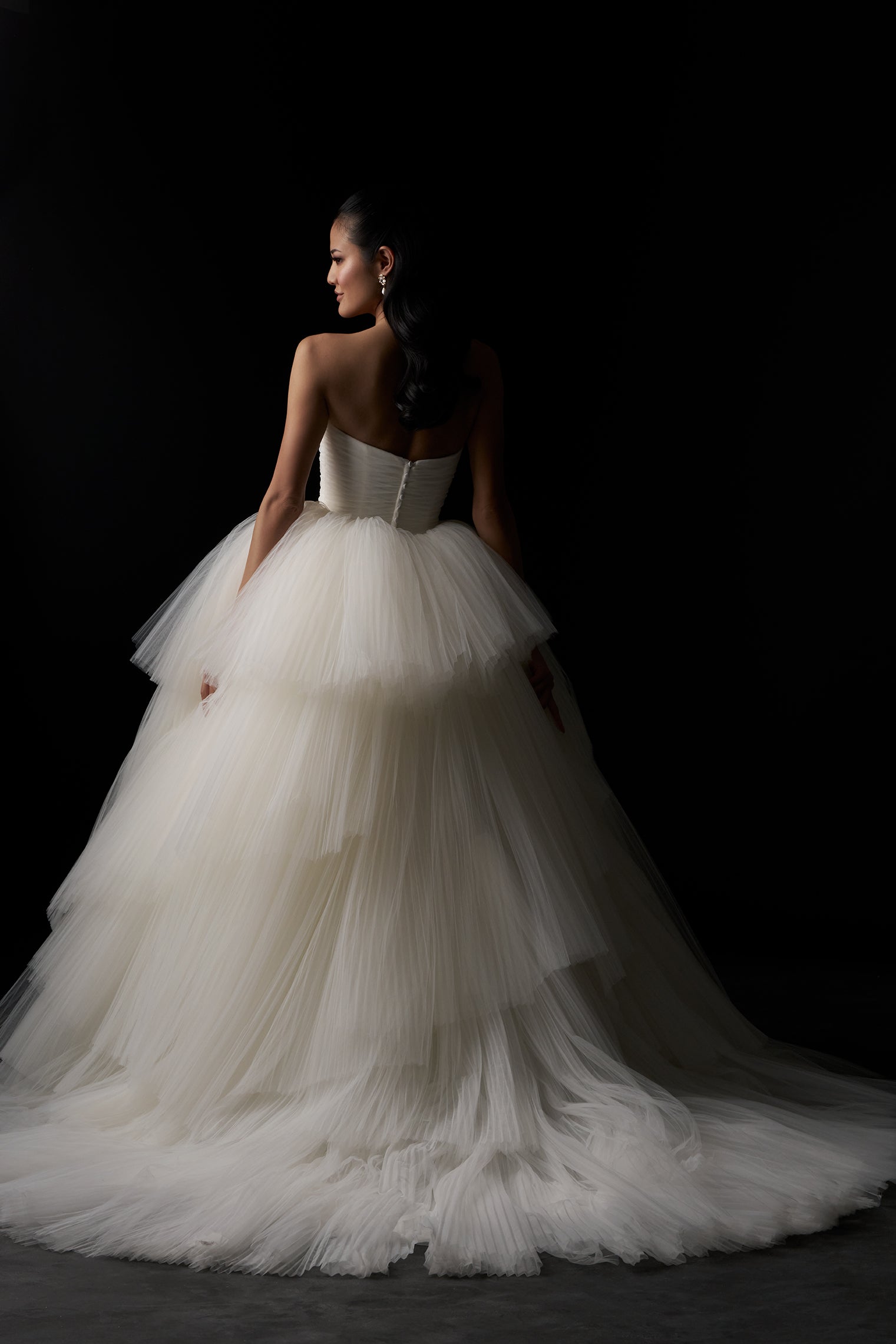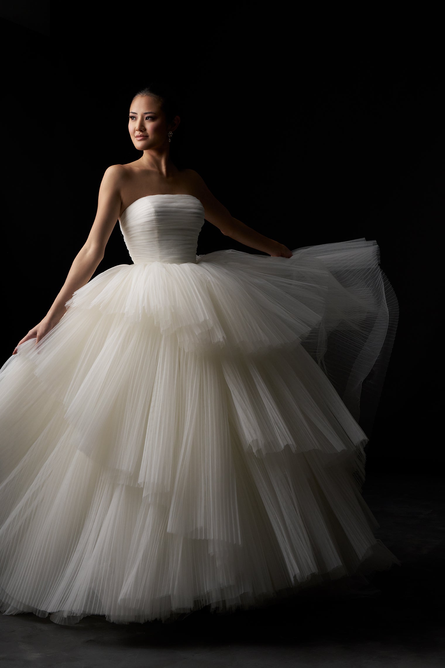 While crafted entirely from tulle, this gown is anything but simple. A ruched straight neckline and natural waist give way to a cascade of accordion-pleated tiers, creating airy volume and dimensional movement throughout the full skirt. Light, layered, and full of texture, it’s a study in elegant restraint with dramatic payoff. Read Less