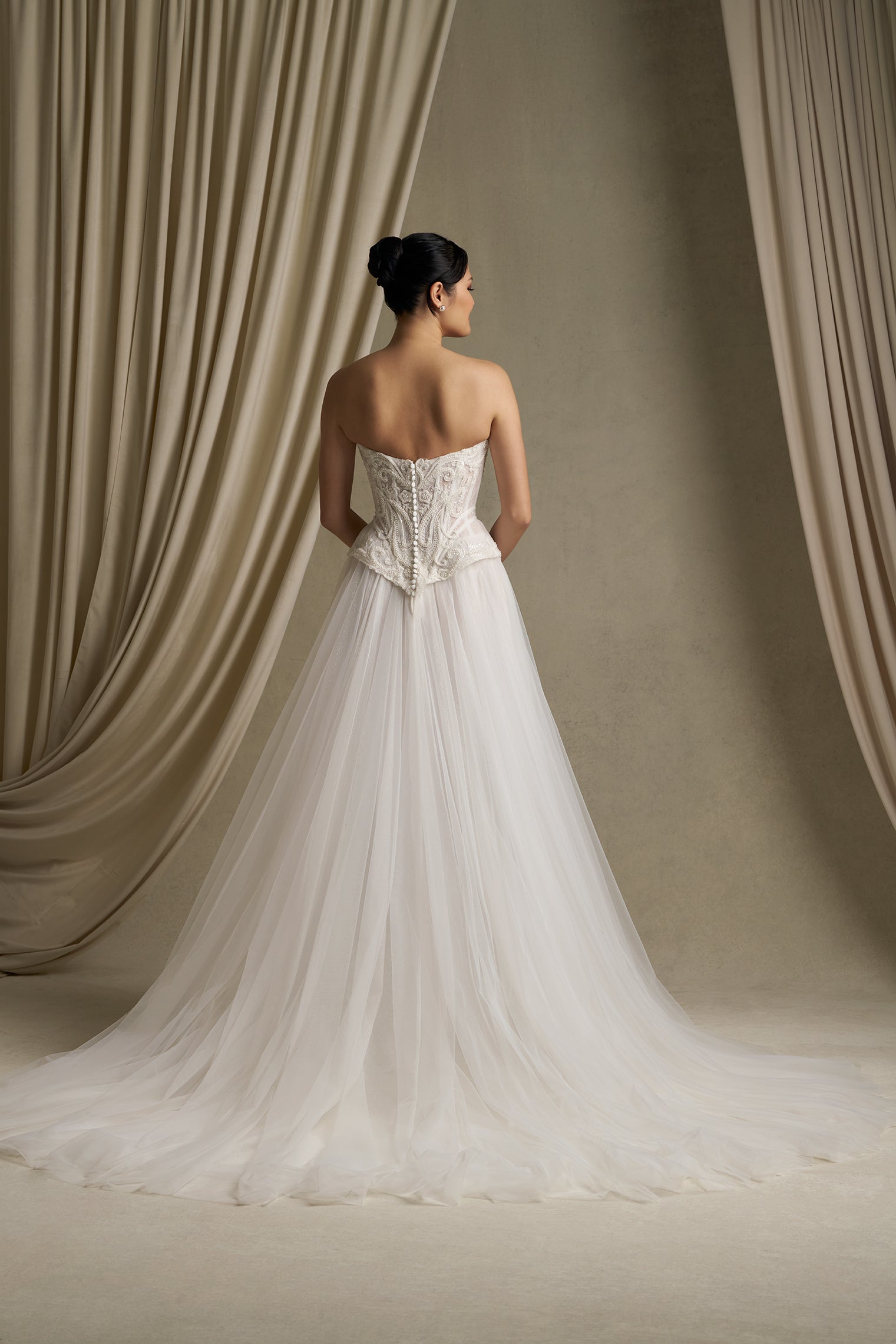 Beaded scrolling lace adorns the bodice of this strapless A-line gown, forming an ornate pattern that sparkles with dimension. The structured bodice features exposed boning that sculpts the waist and enhances the gown’s couture shape. A modern peplum detail transitions into layers of soft sparkle tulle, creating movement and contrast between structure and fluidity. Elegant yet contemporary, this gown captures the essence of Allure Couture’s refined craftsmanship. Read Less