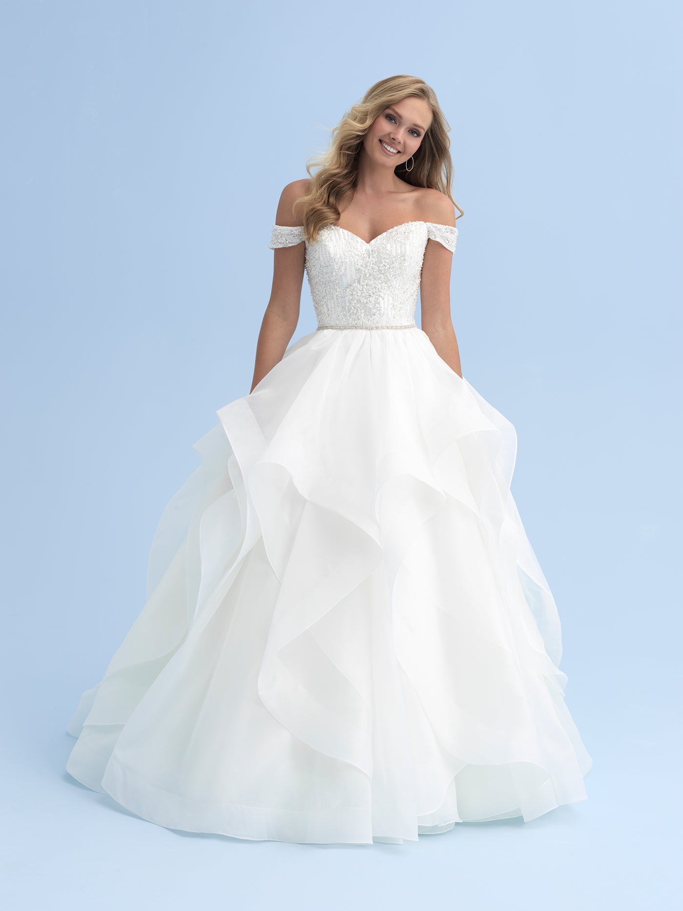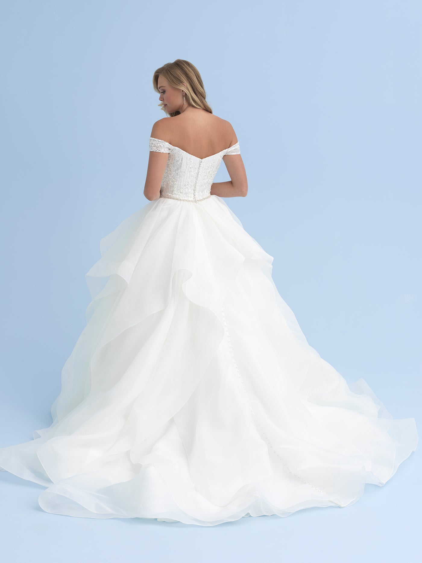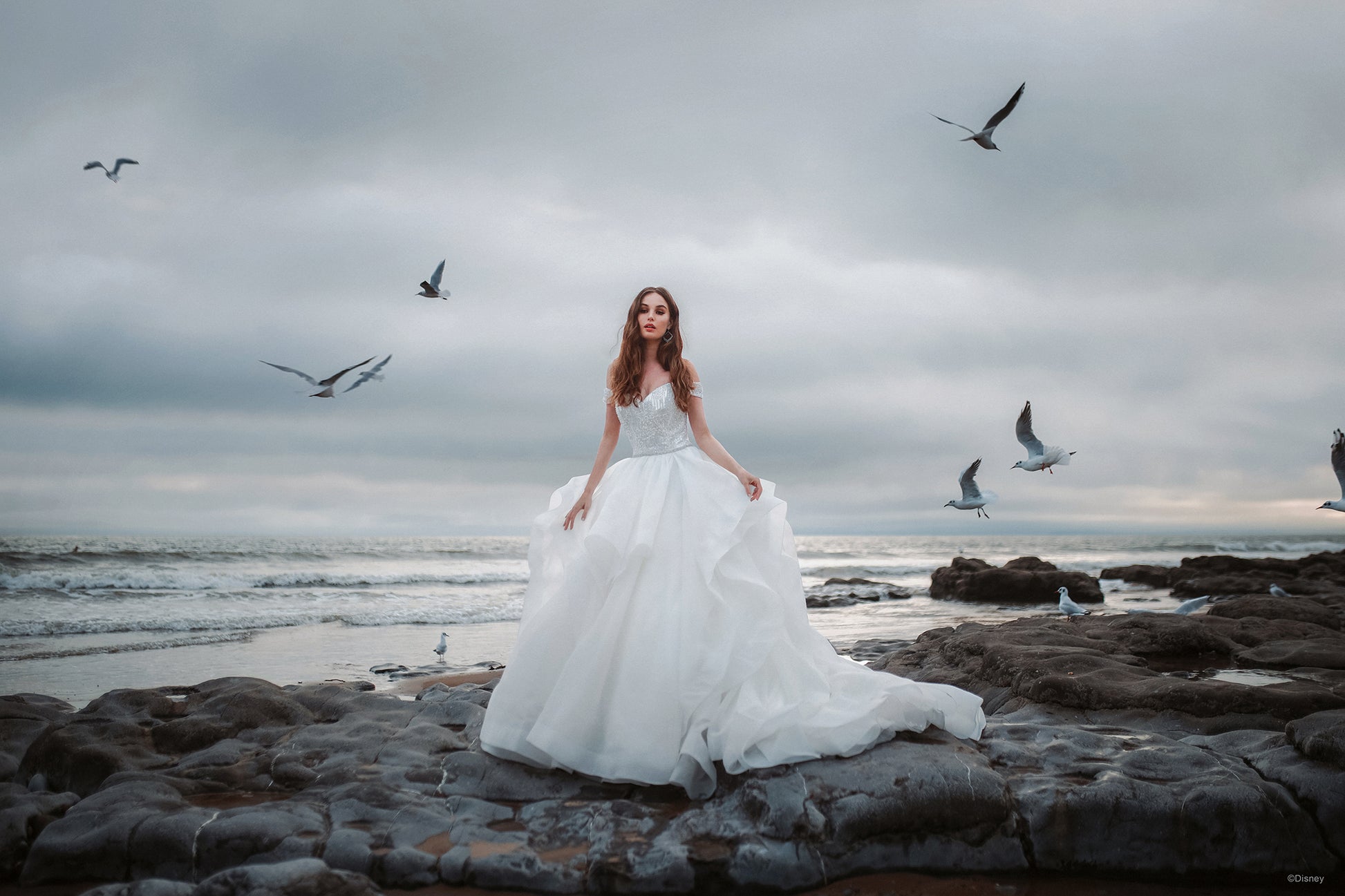 This A-line gown features stunning organza ruffles inspired by ocean waves and Ariel's sense of adventure. The off-the-shoulder sweetheart bodice, covered in pearl beading, crystals, and sequins, is simply stunning.