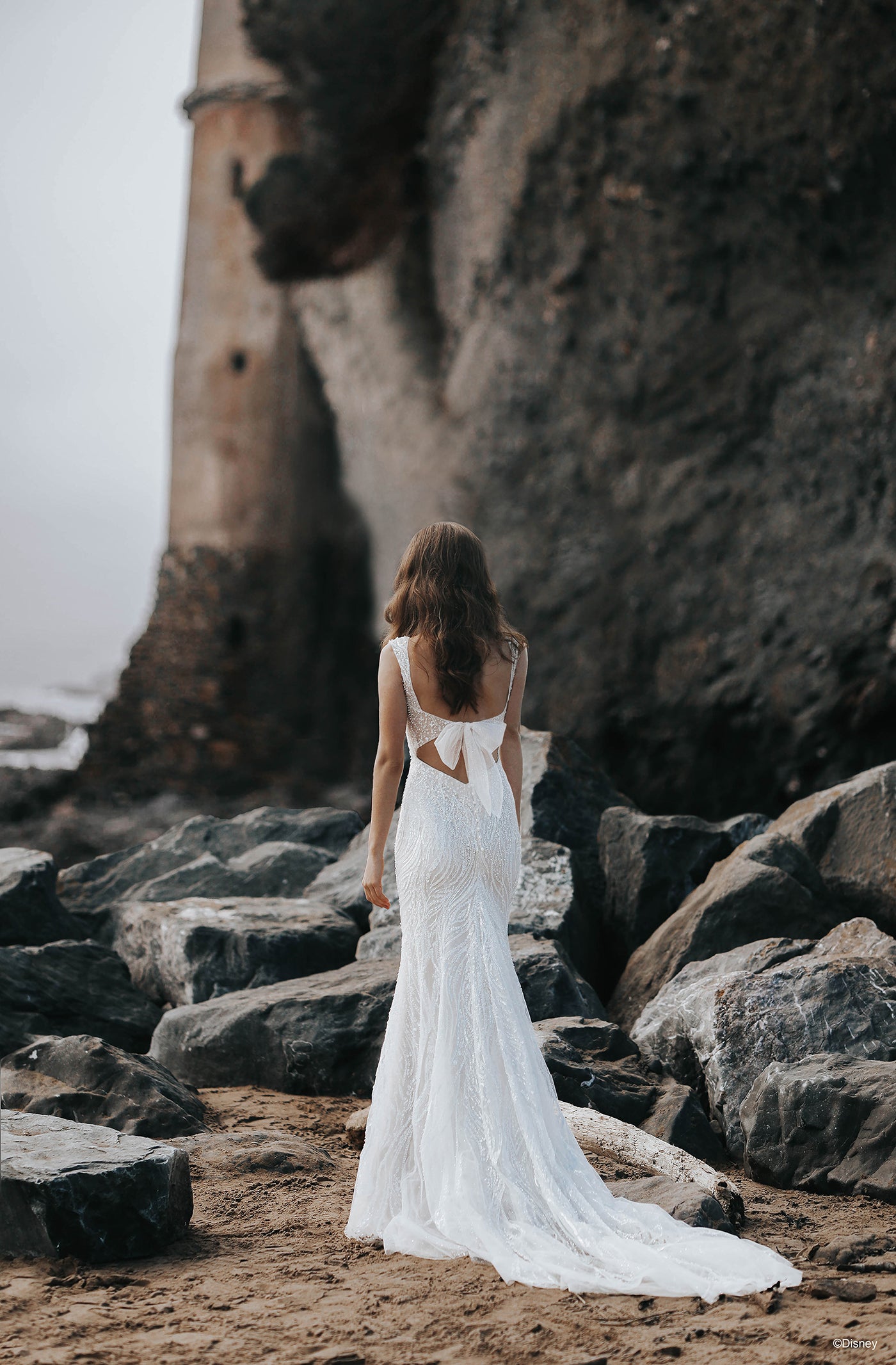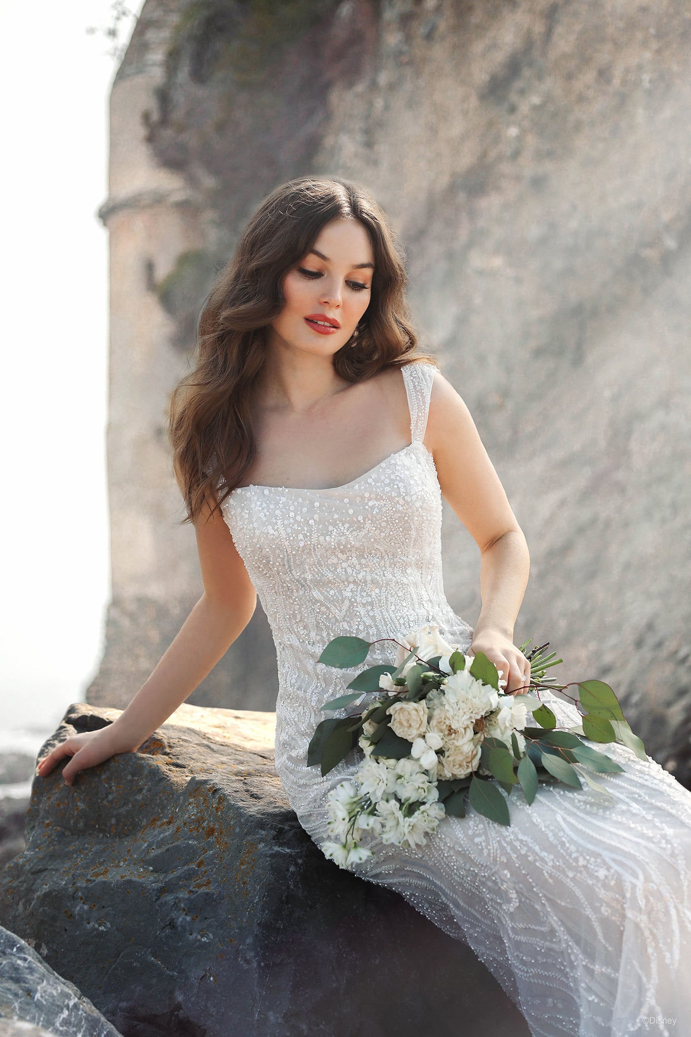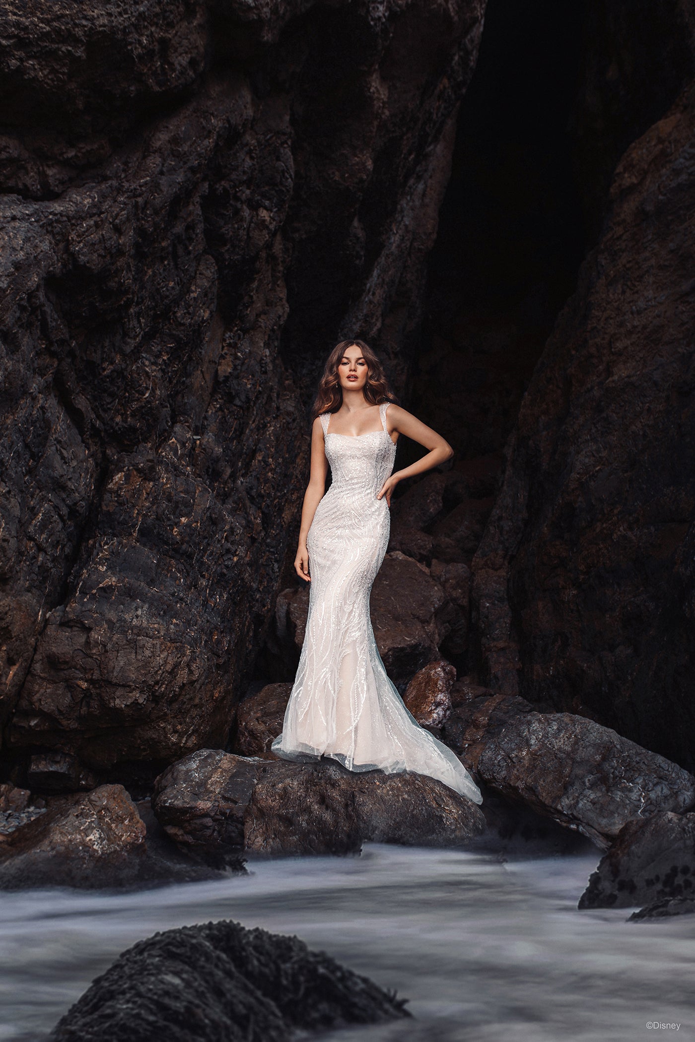 Make your wedding day complete with a gown inspired by a hero who followed her heart no matter the cost. Our D360 Ariel wedding dress is a gorgeous choice for the bride who takes her happily ever after into her own hands. Inspired by The Little Mermaid’s Ariel, this wedding dress features intricate, flowing sequin and pearl designs that evoke the beauty of the ocean waves. Ocean-like shimmer with sequins and pearled beading trail along the bodice and tulle skirt of the Ariel-inspired sheath gown, which is finished with a delicate, translucent bow at the back and features a modified sweetheart neckline and tapered straps. Find yours at an Allure Bridals retailer near you. Show with Veil DV23, sold separately. Read Less