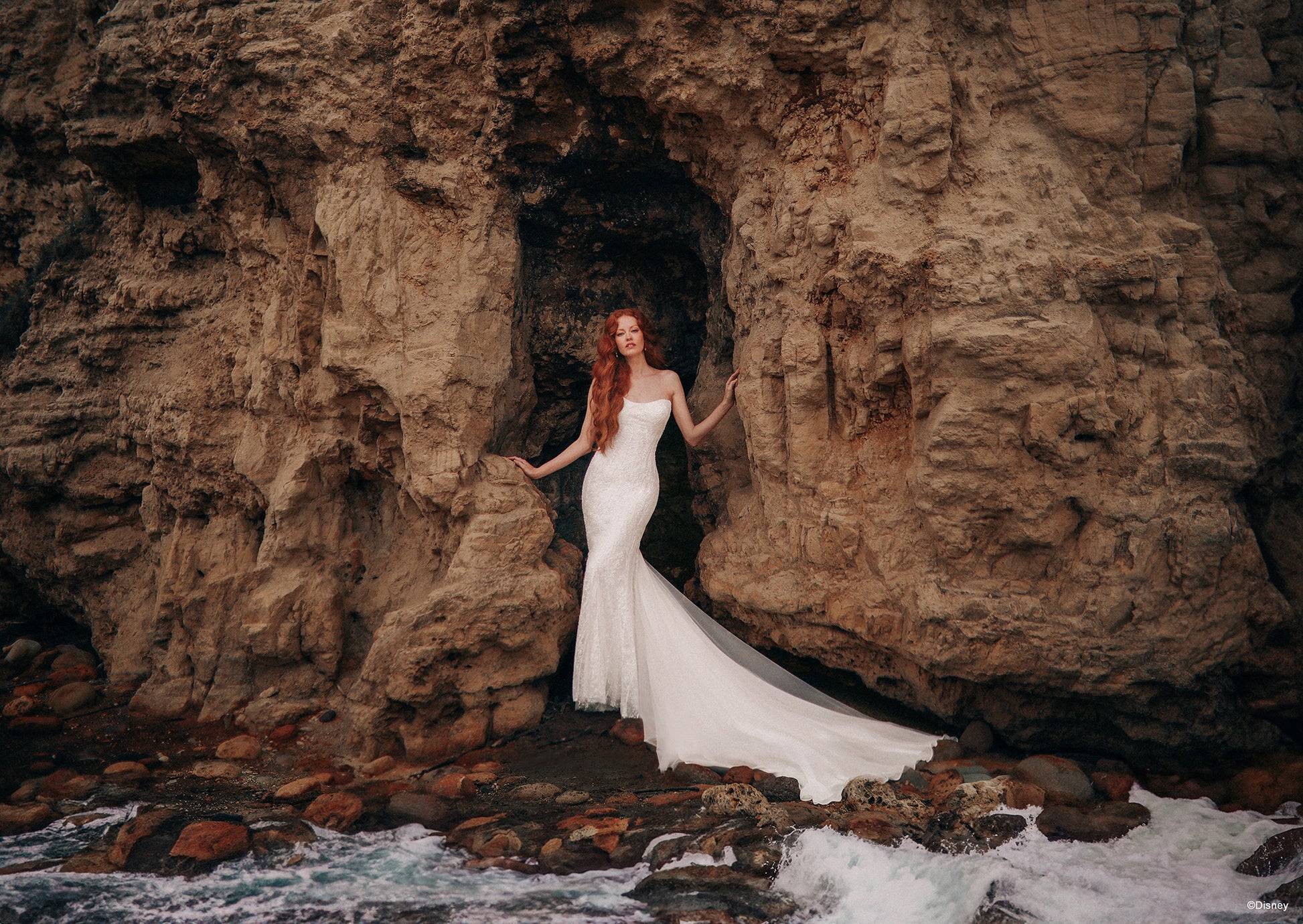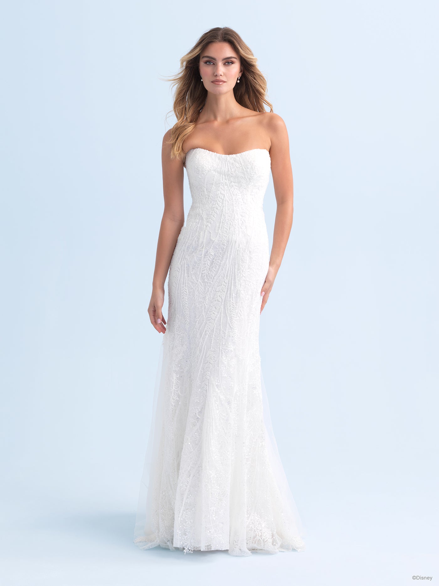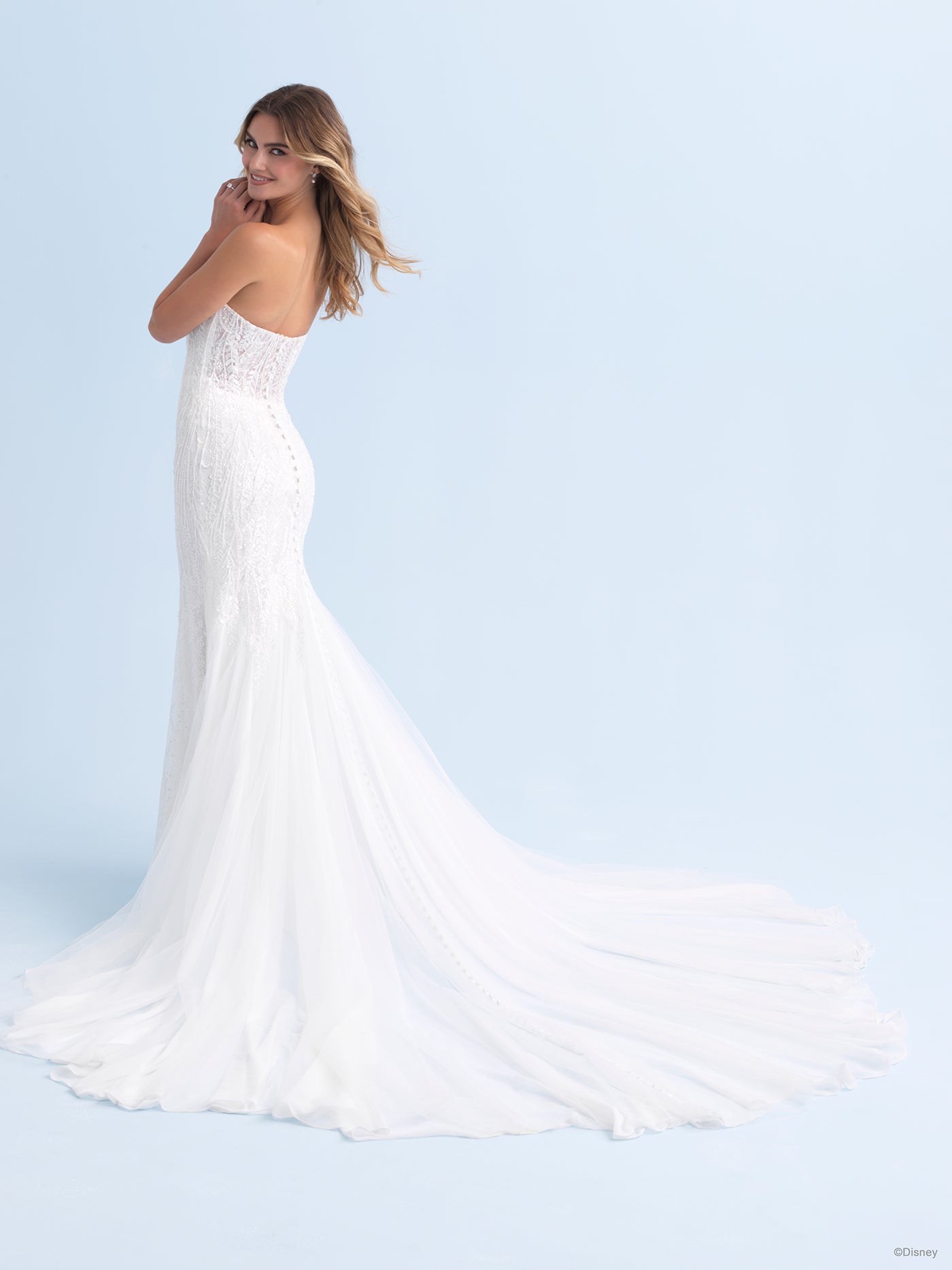 They say "Love Changes Everything," and we guarantee you'll fall head over fins for the strapless sheath silhouette featured on this Disney's Ariel-inspired bridal look, replete with beaded lace and a delicate tulle and chiffon train.