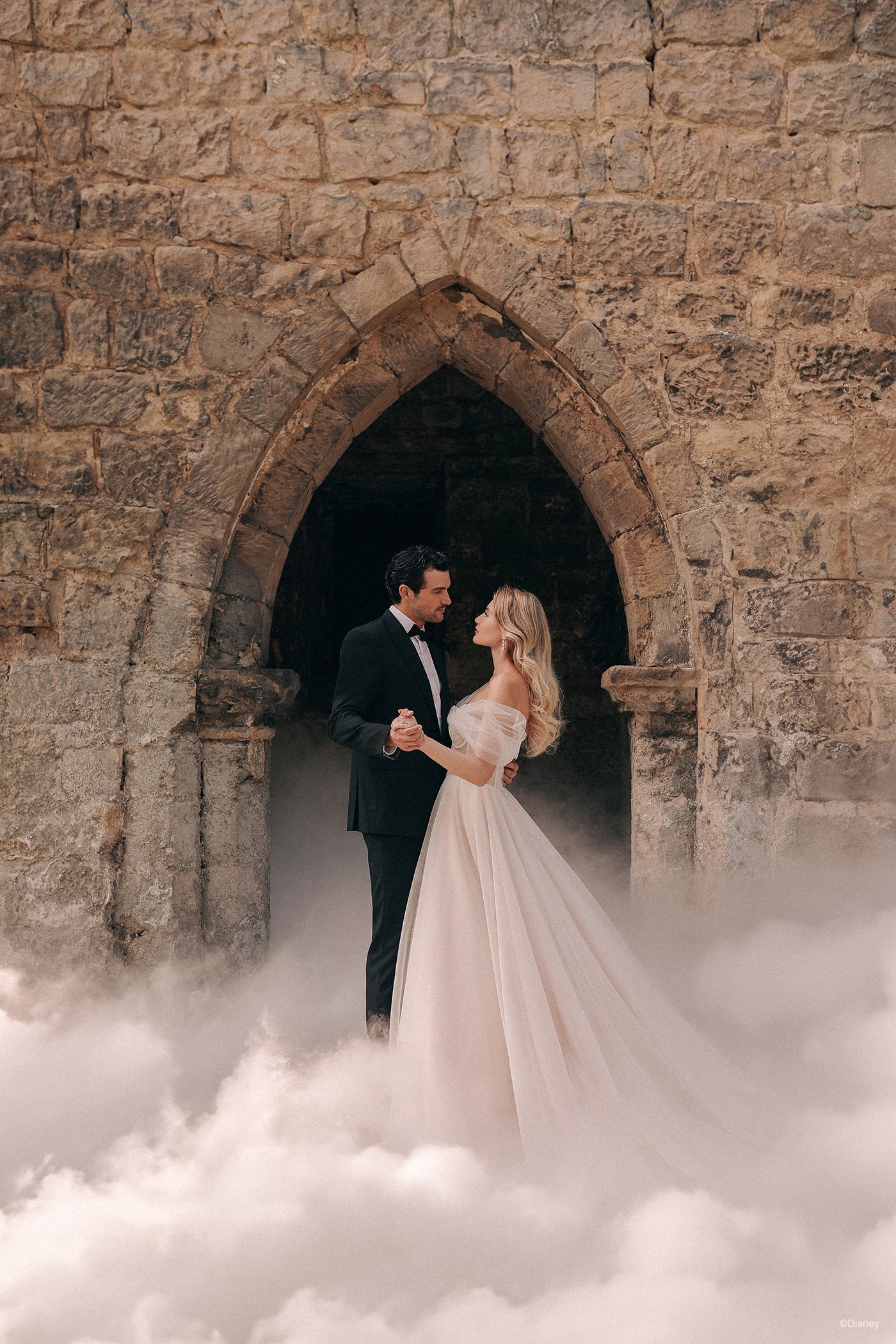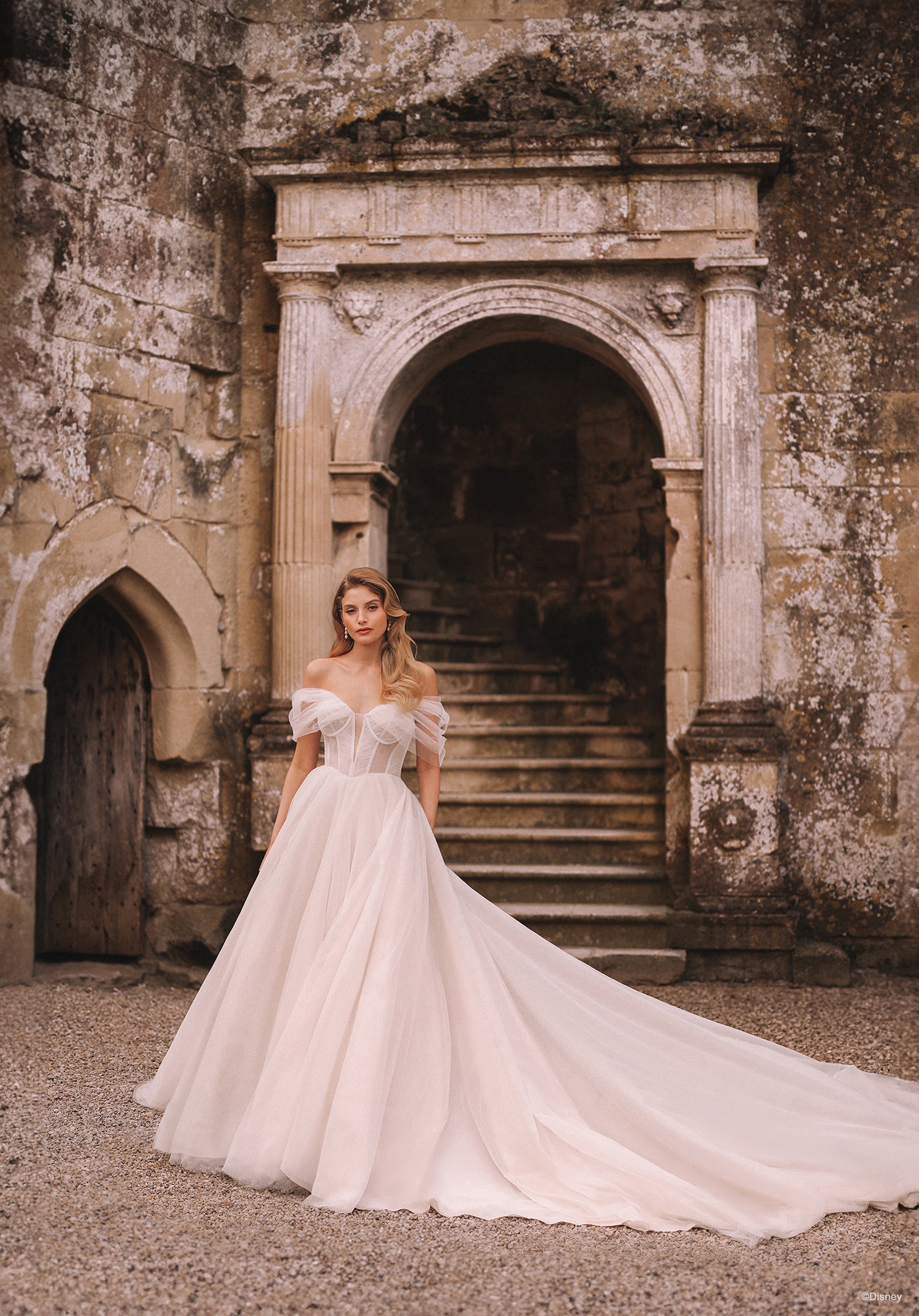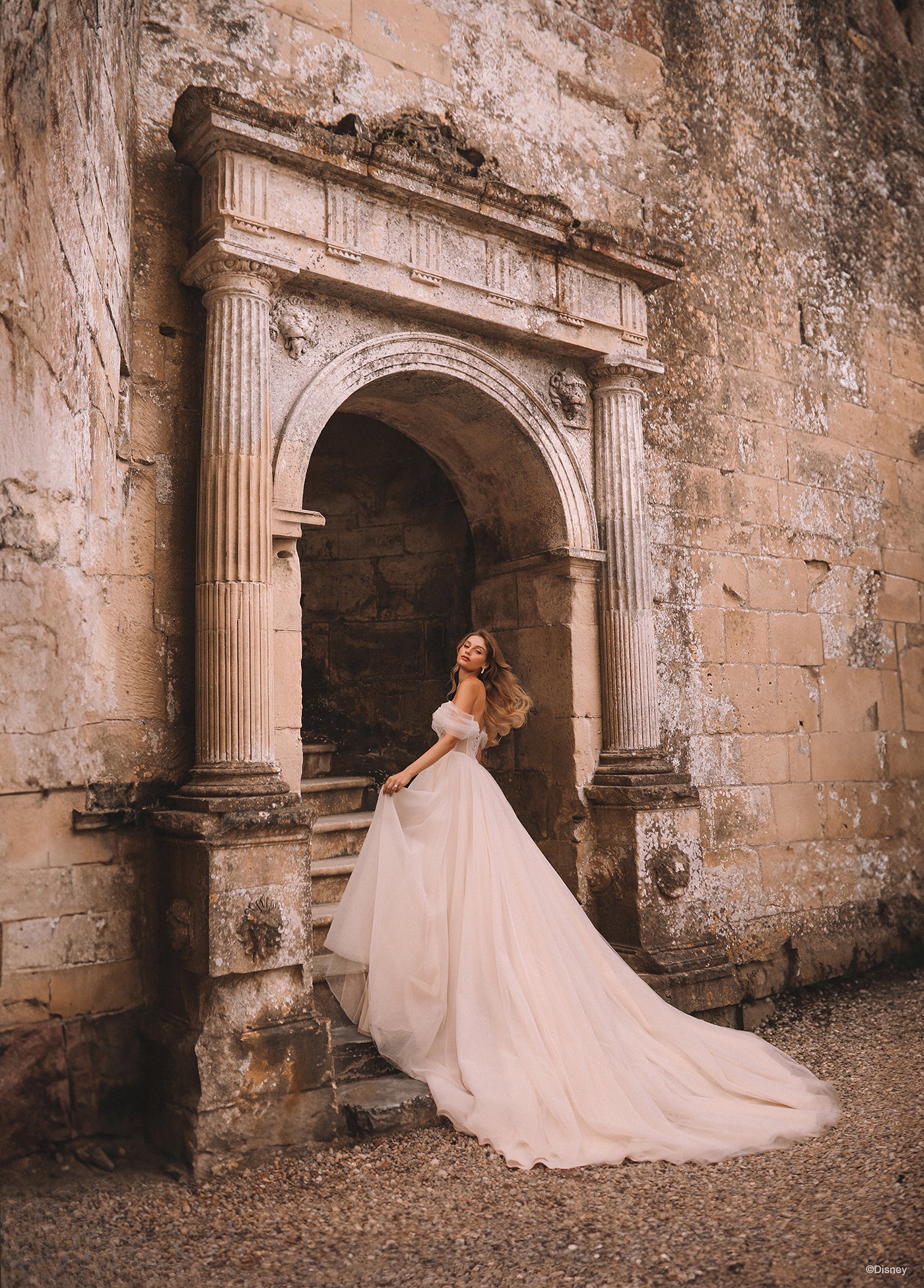 Cloudlike and ethereal, this Aurora-inspired off-shoulder gown is pulled straight from an enchanted dream. Pairing "Sleeping Beauty's" medieval woodland aesthetic with modern cottagecore femininity.