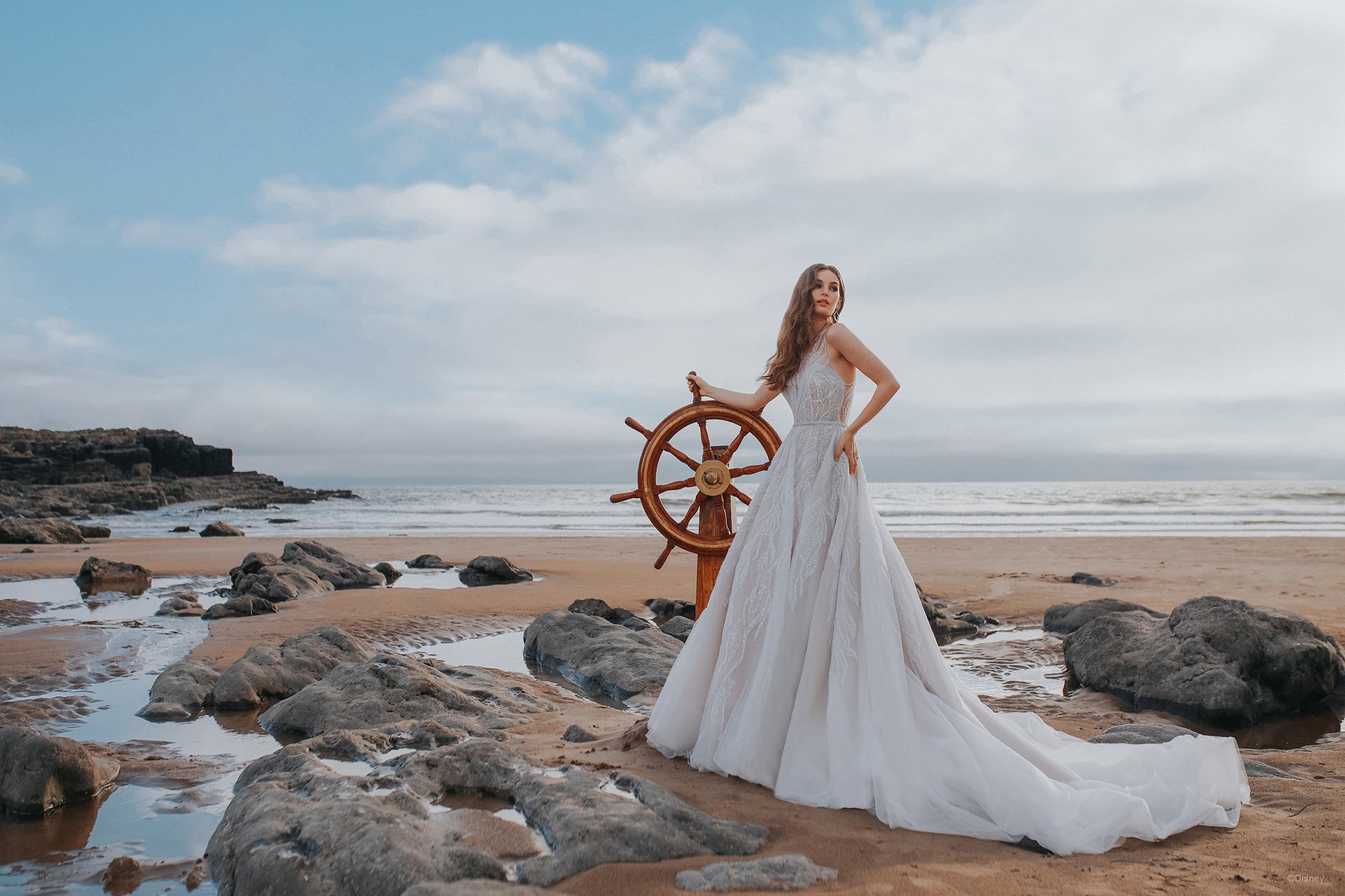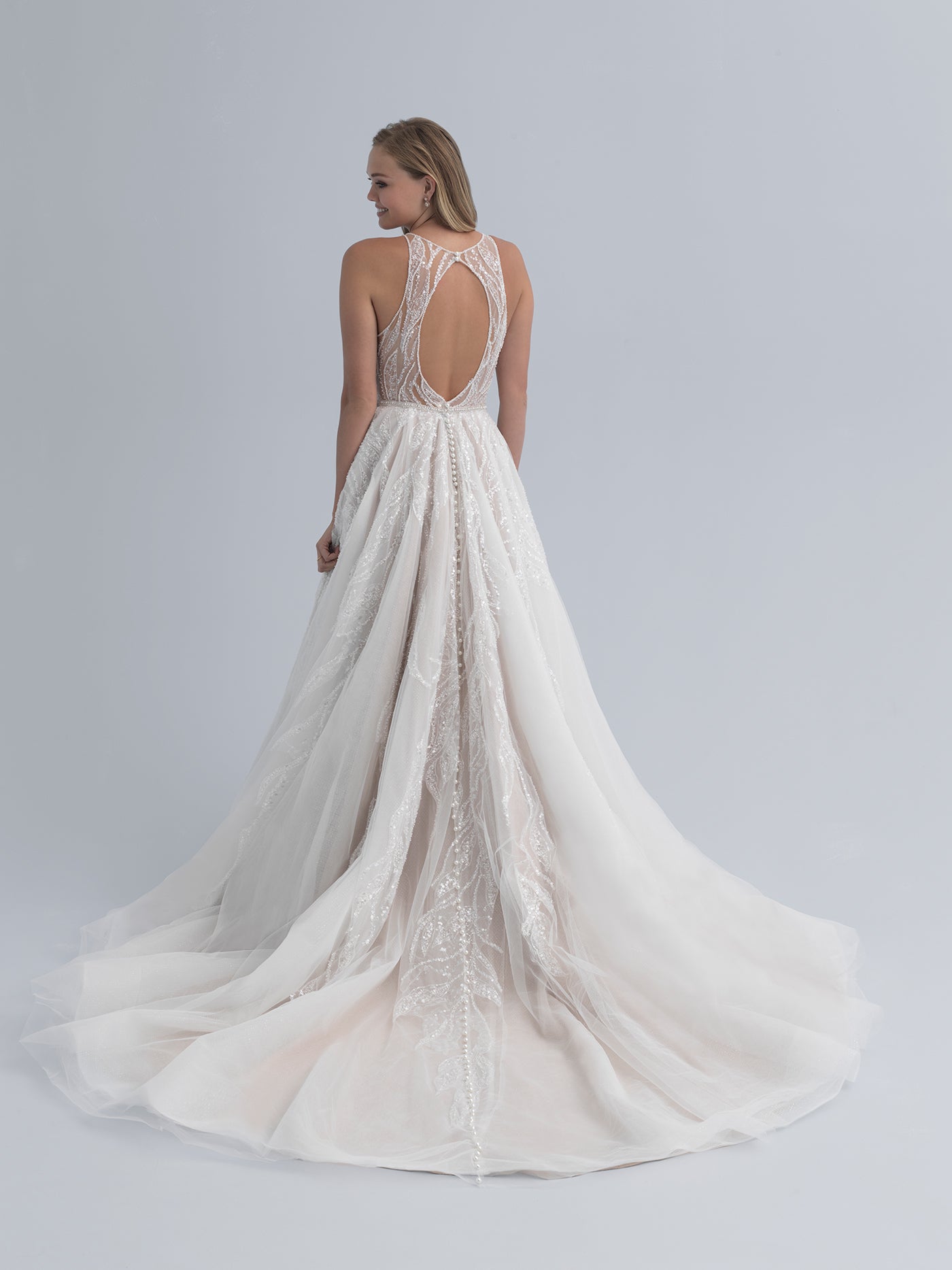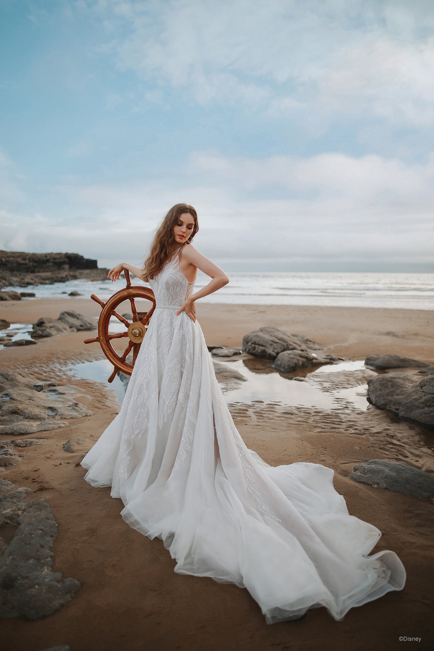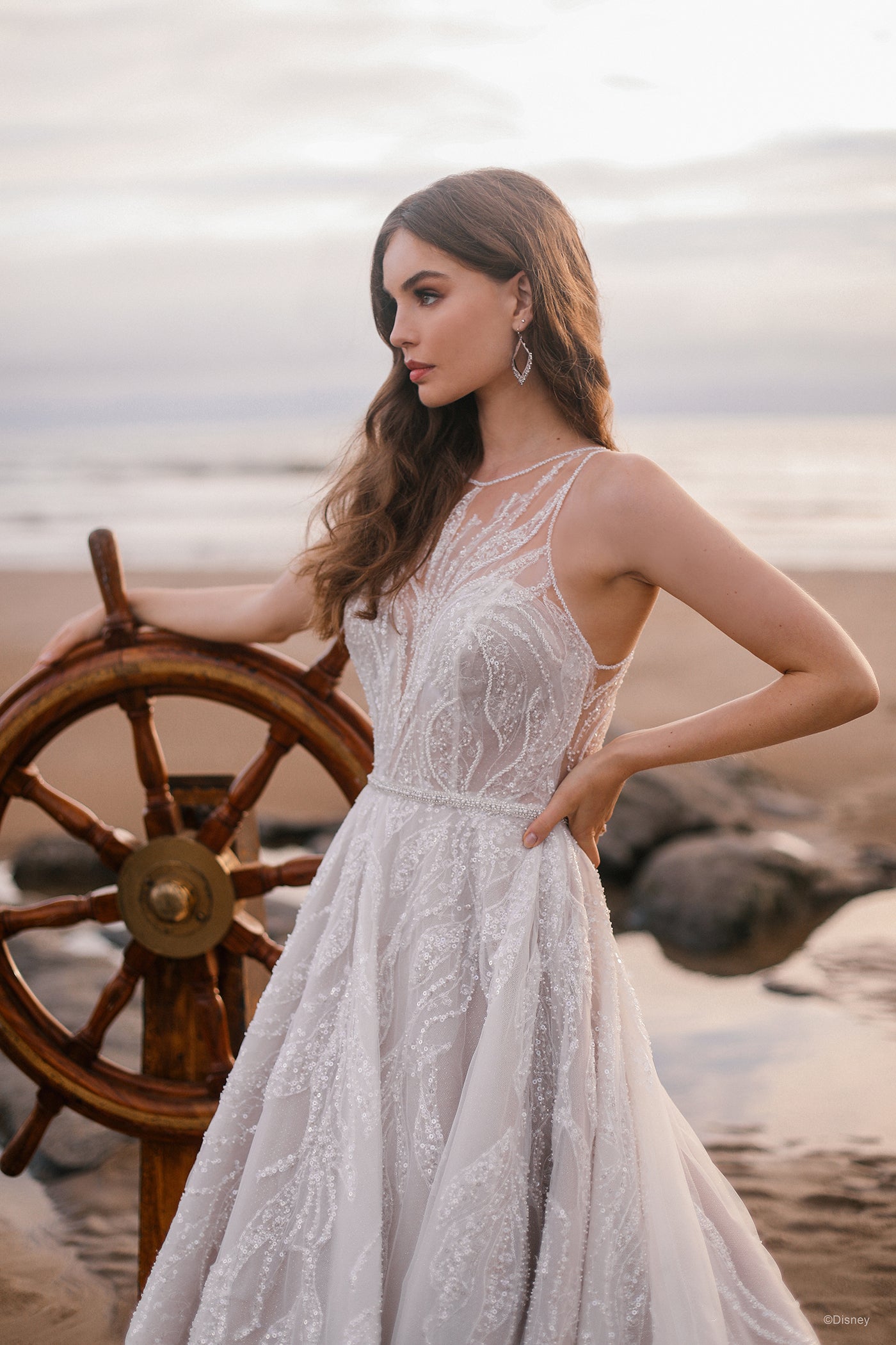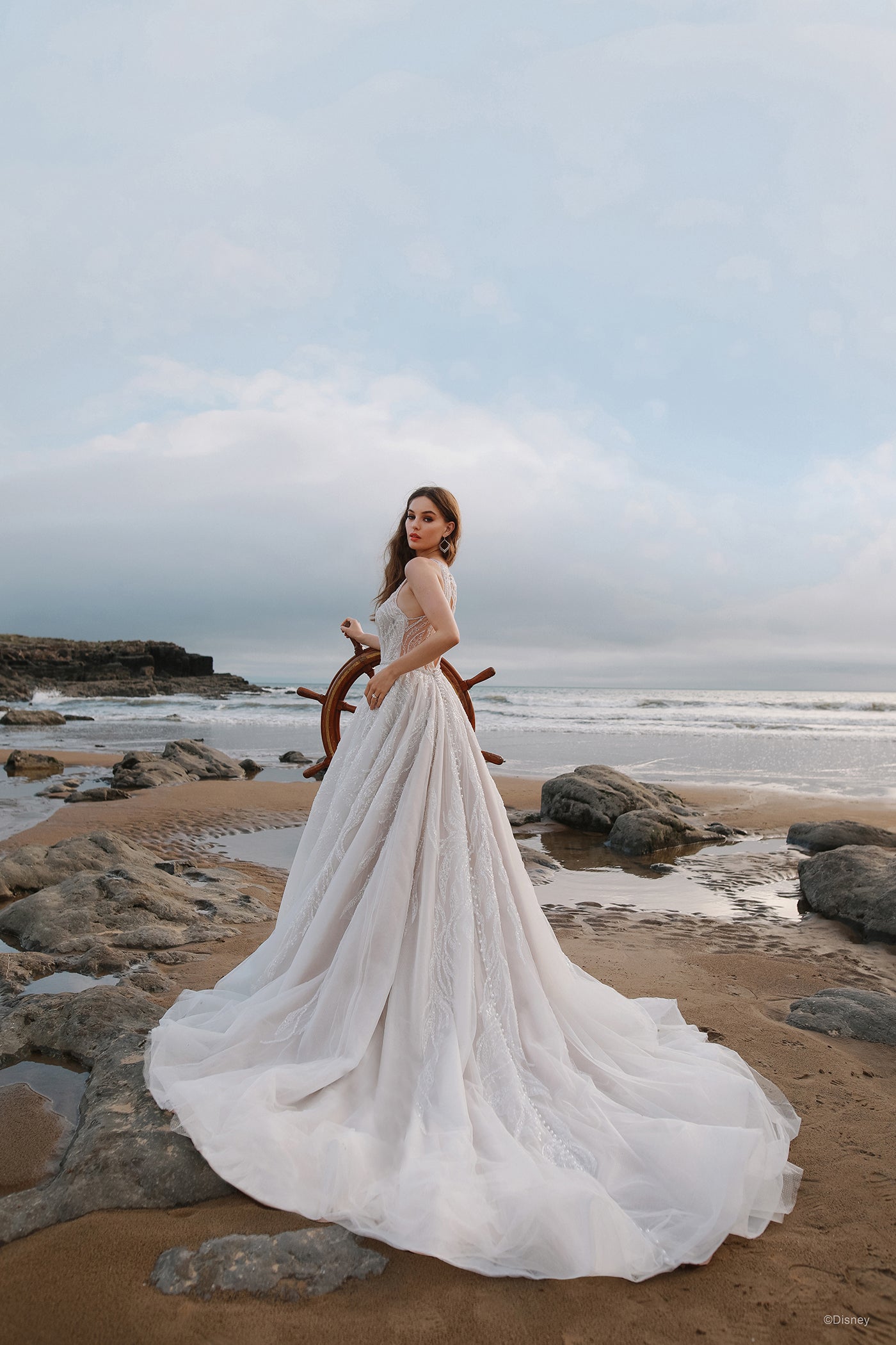 The Ariel-inspired Platinum A-line gown features a delicate halter neckline and beaded illusion keyhole back, while the skirt is adorned with glittering beaded fronds, gently swaying like the ocean’s tide. Pearl buttons and a beaded belt finish the look.