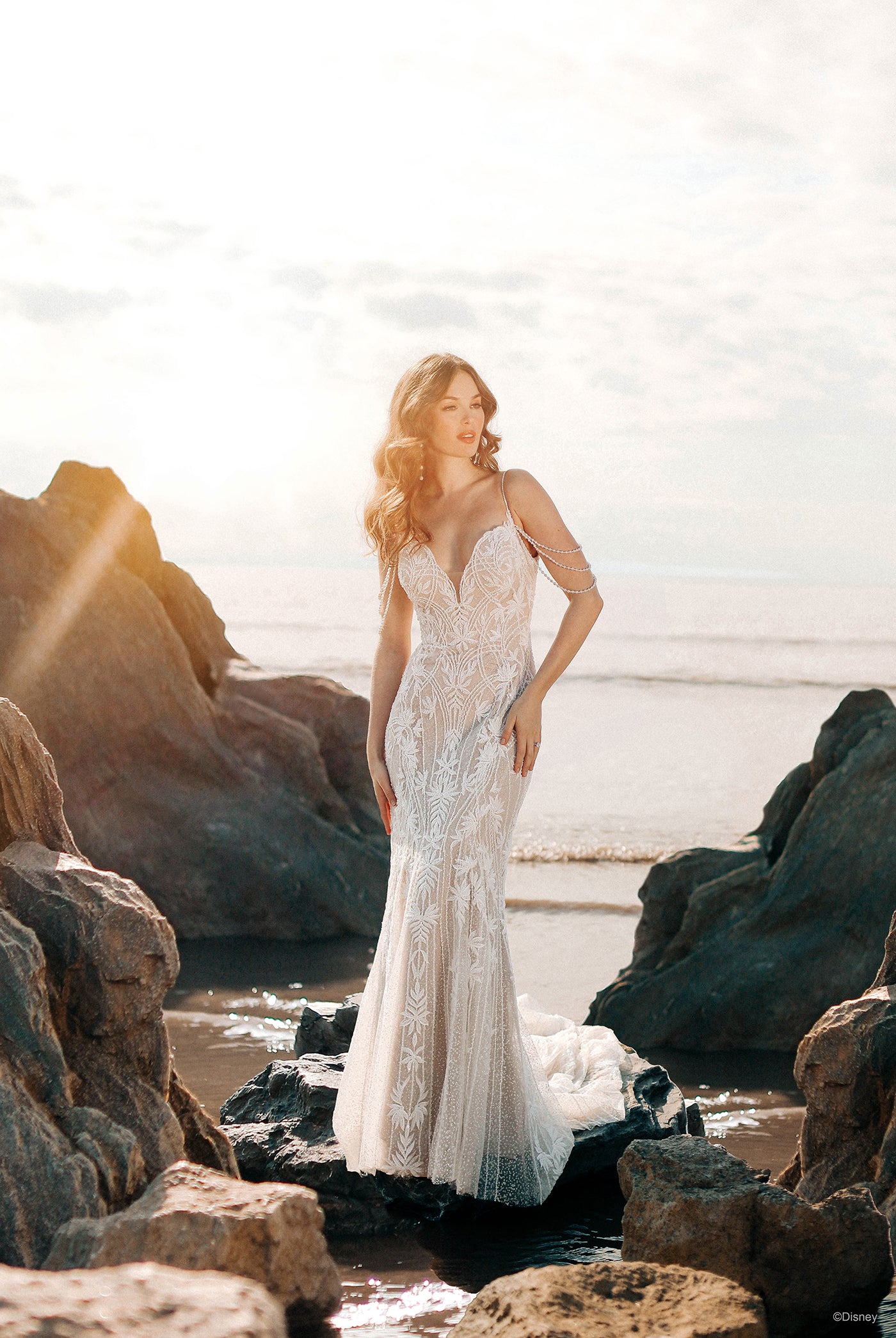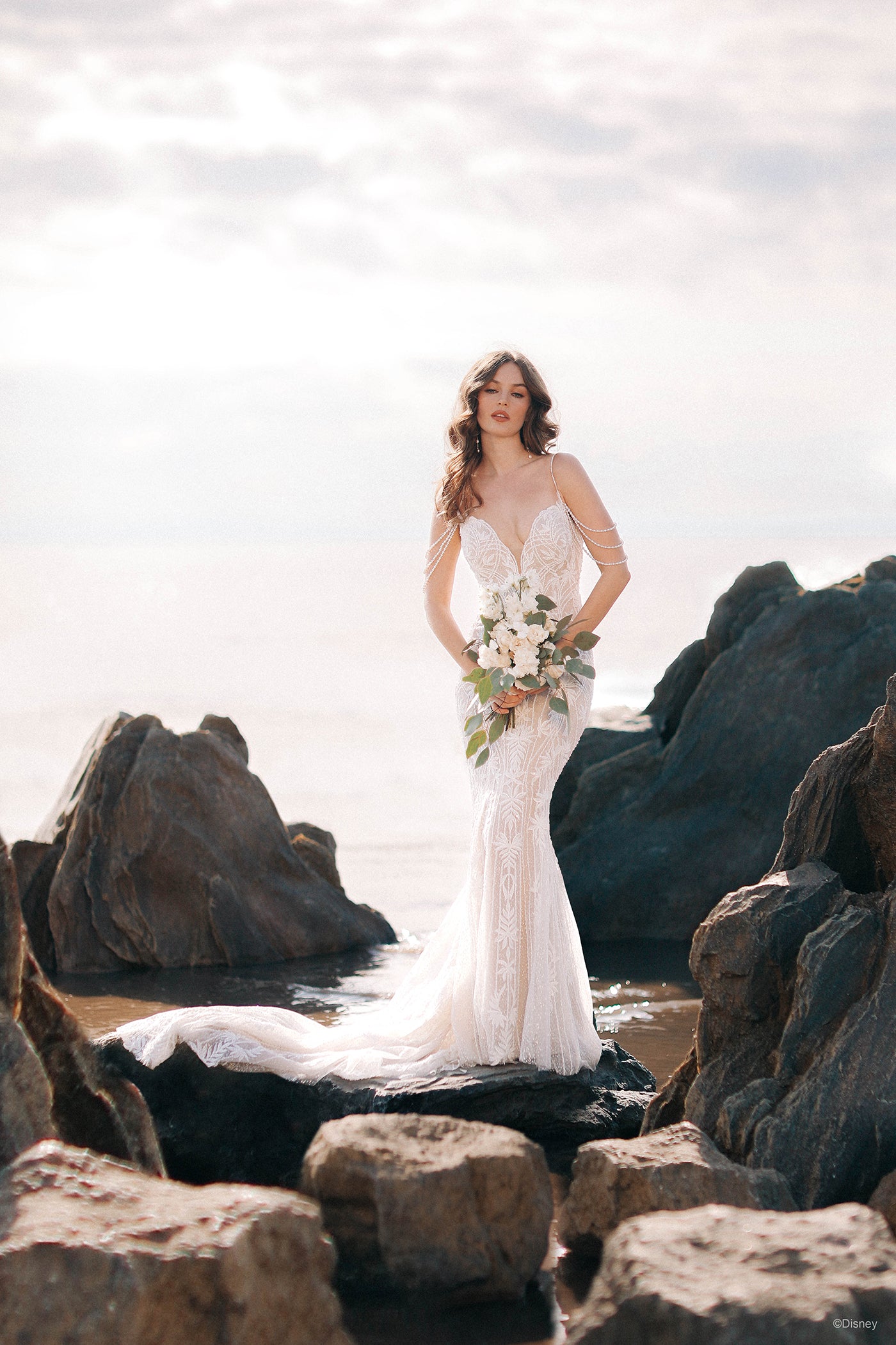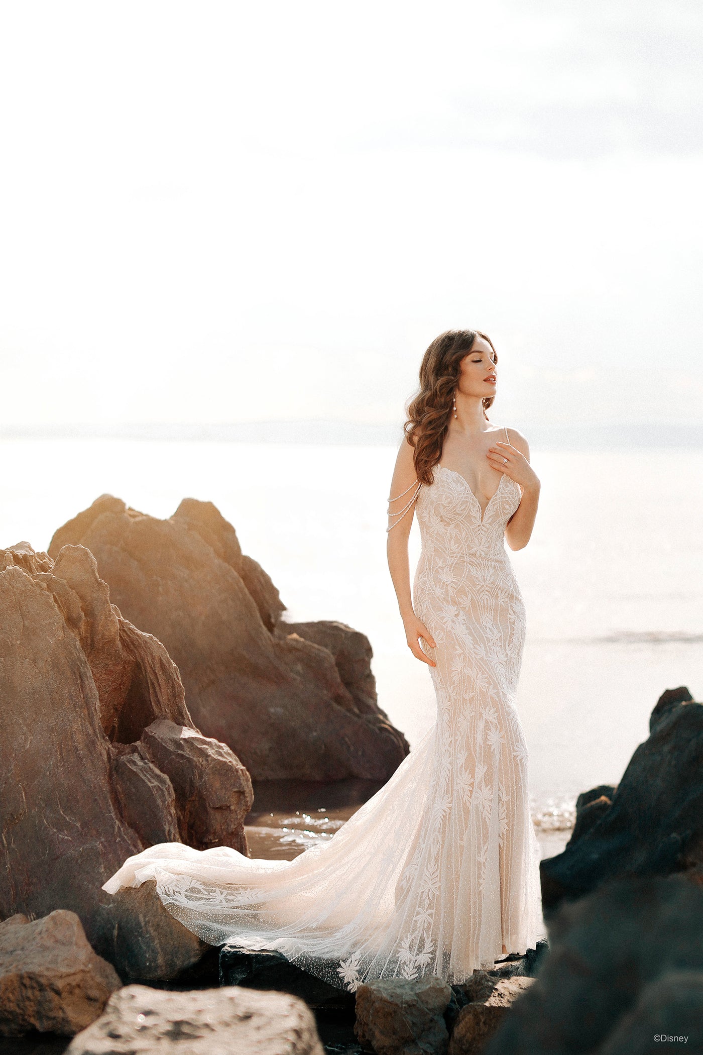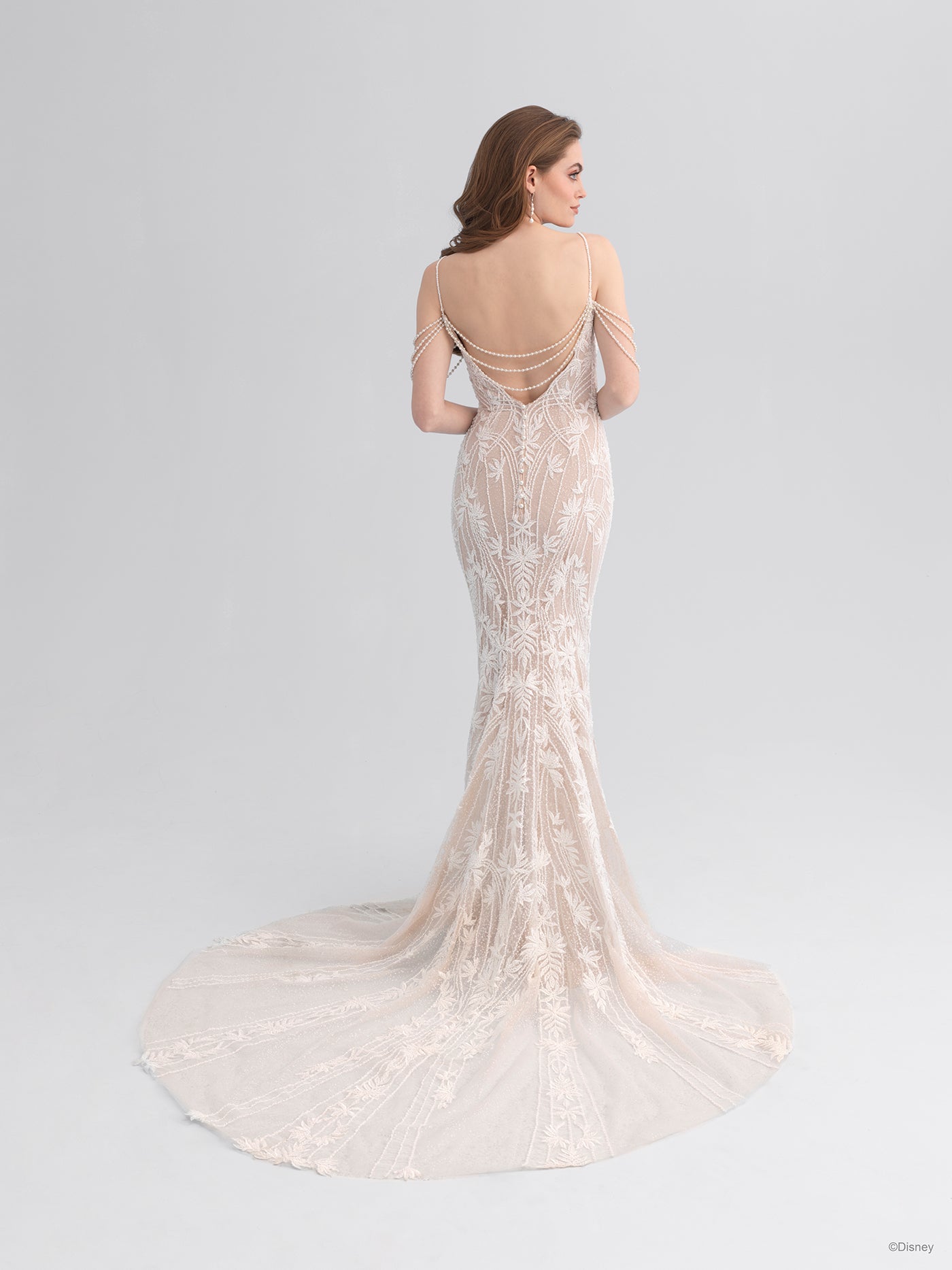 Beautiful, regal, and radiant, the DP350 Ariel dress sparkles like the morning sun illuminating the ocean waves. This Ariel Platinum gown is a beauty of a sheath silhouette with ocean-inspired pearlescent off-shoulder drape, accented by a sweetheart neckline and v-back.
