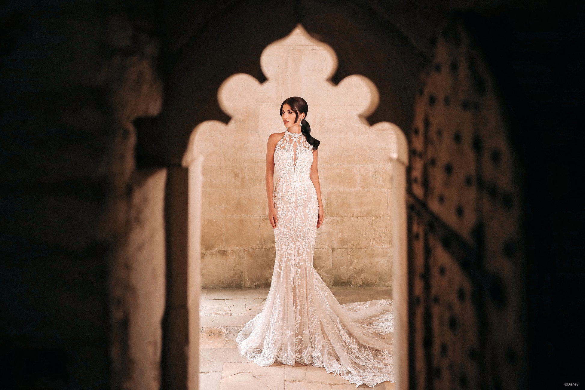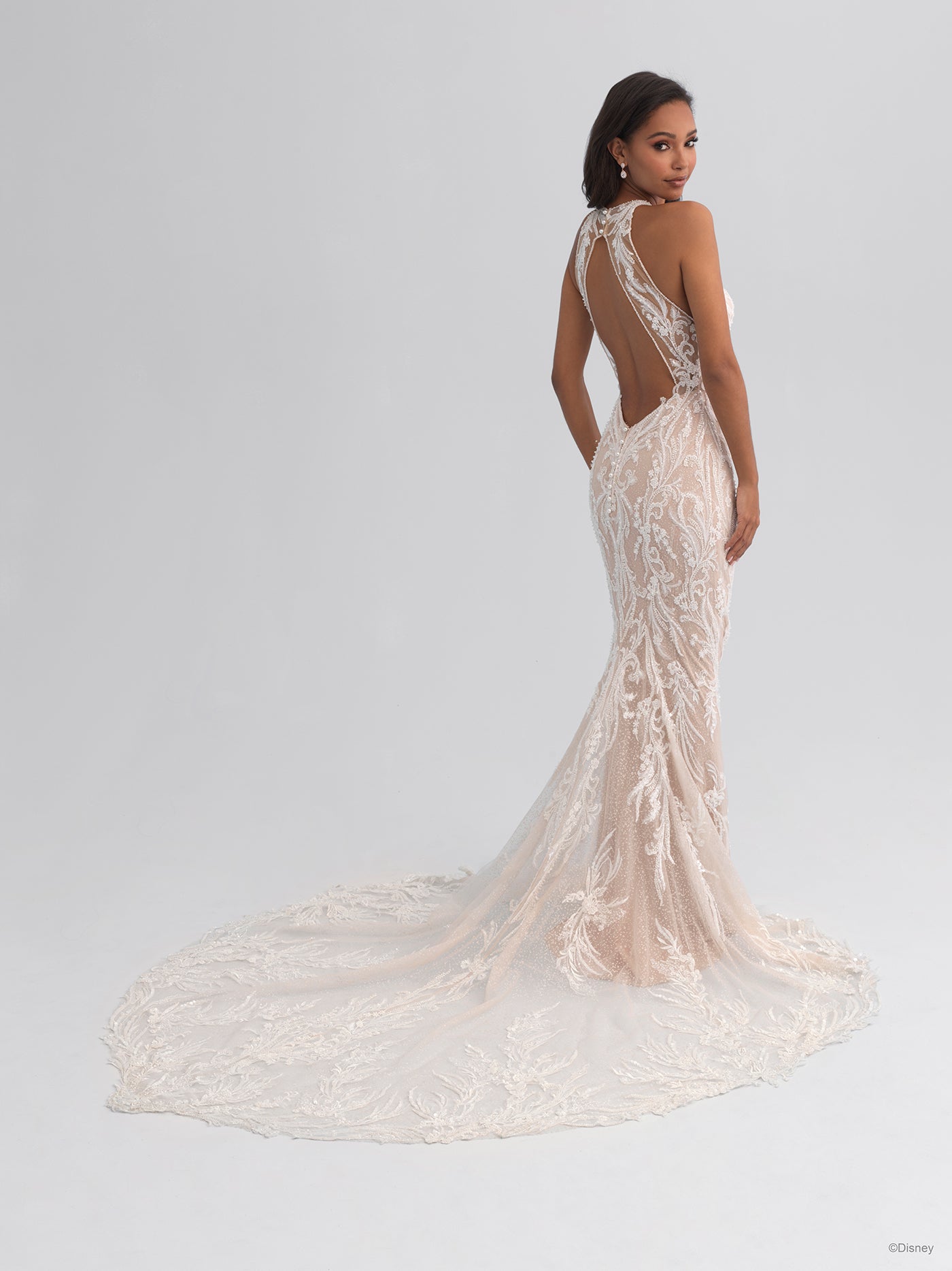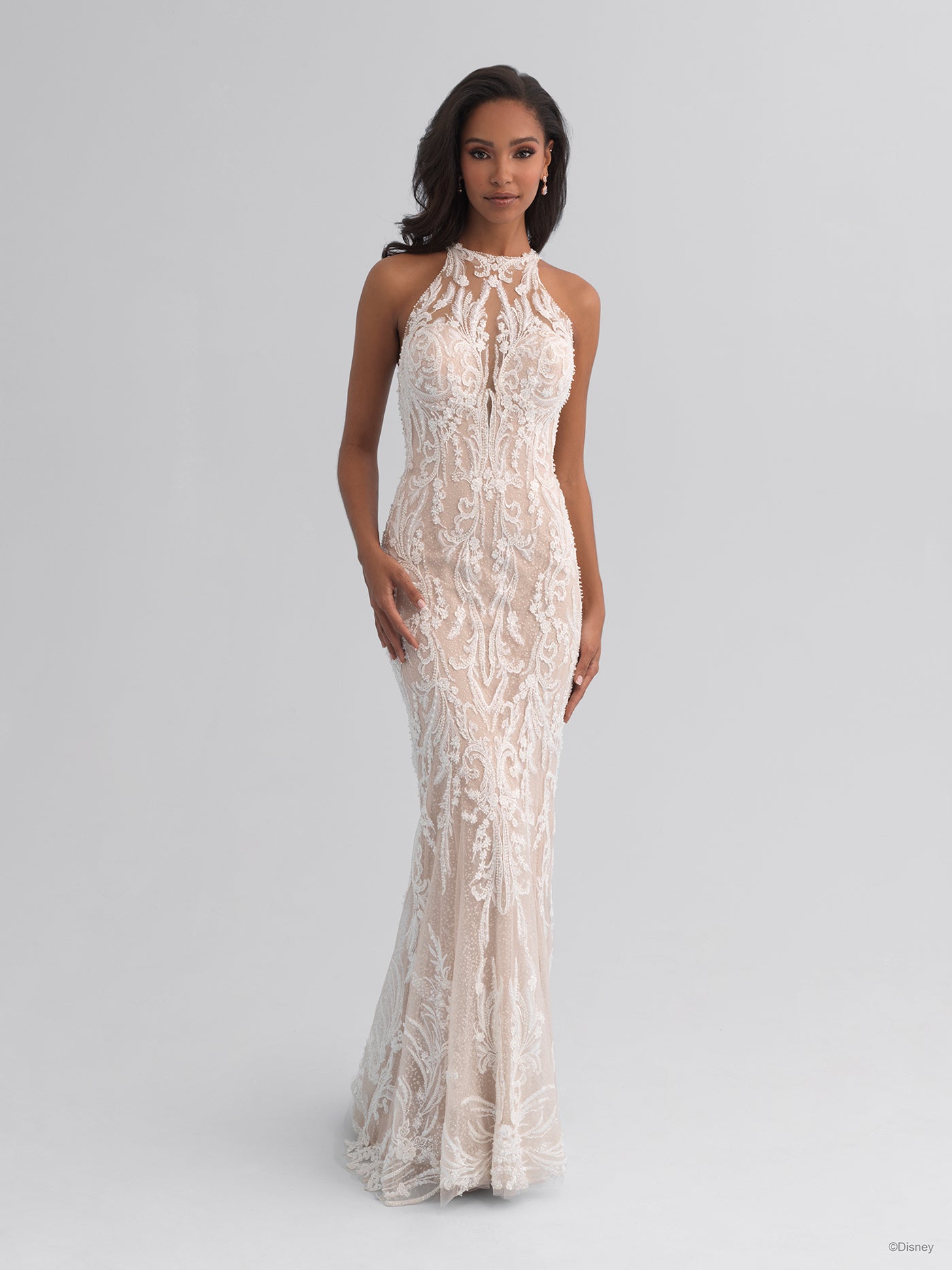 Inspired by Jasmine's bold and adventurous spirit, the Platinum gown is silhouetted in slim sheath lines and features a sparkling tulle lining, meticulous beaded appliques with a halter neckline and keyhole back detail.