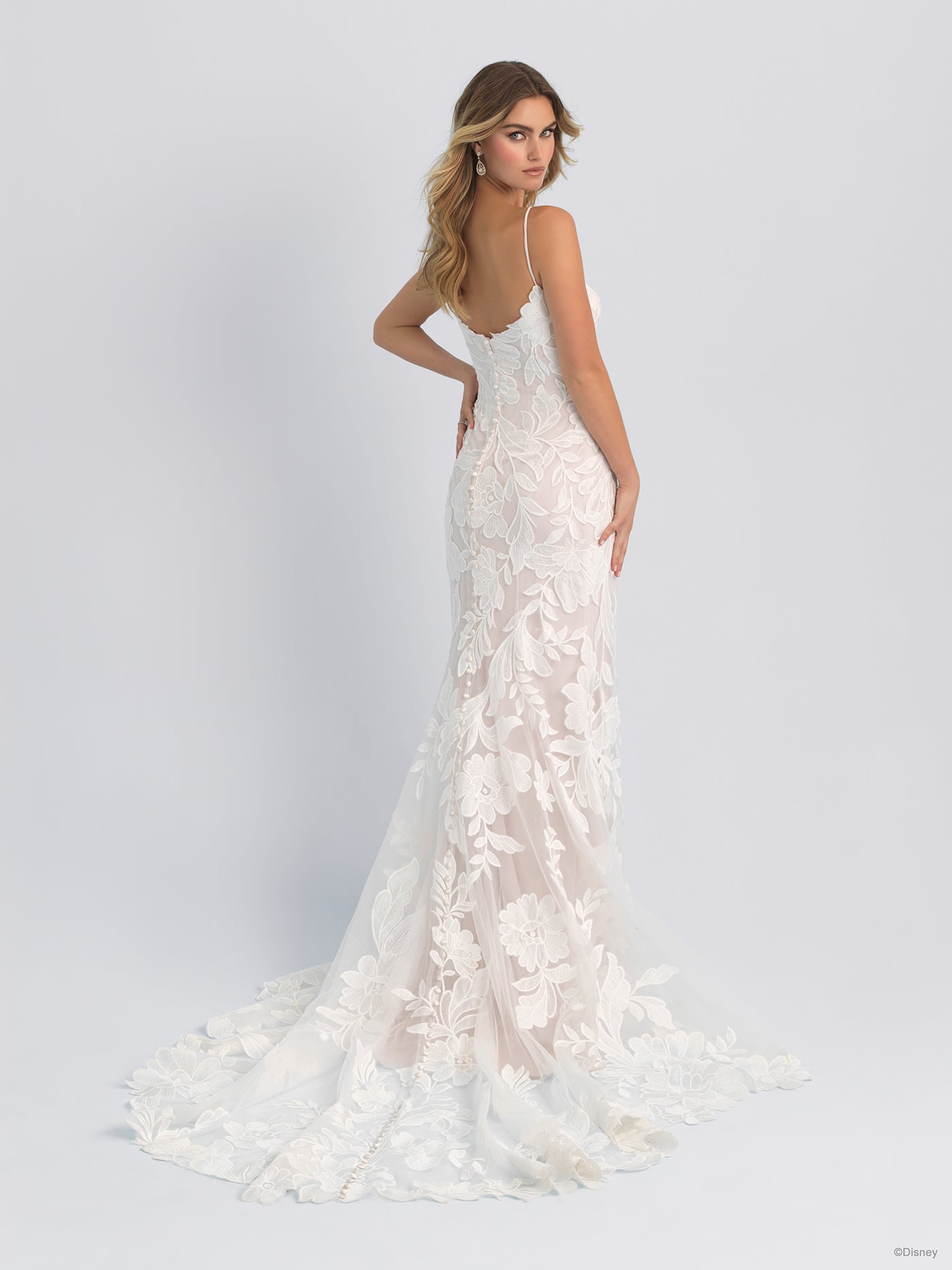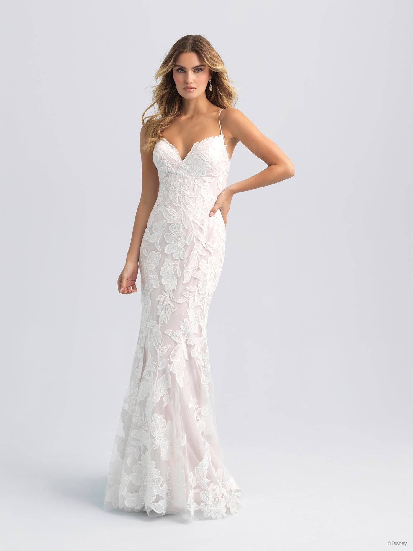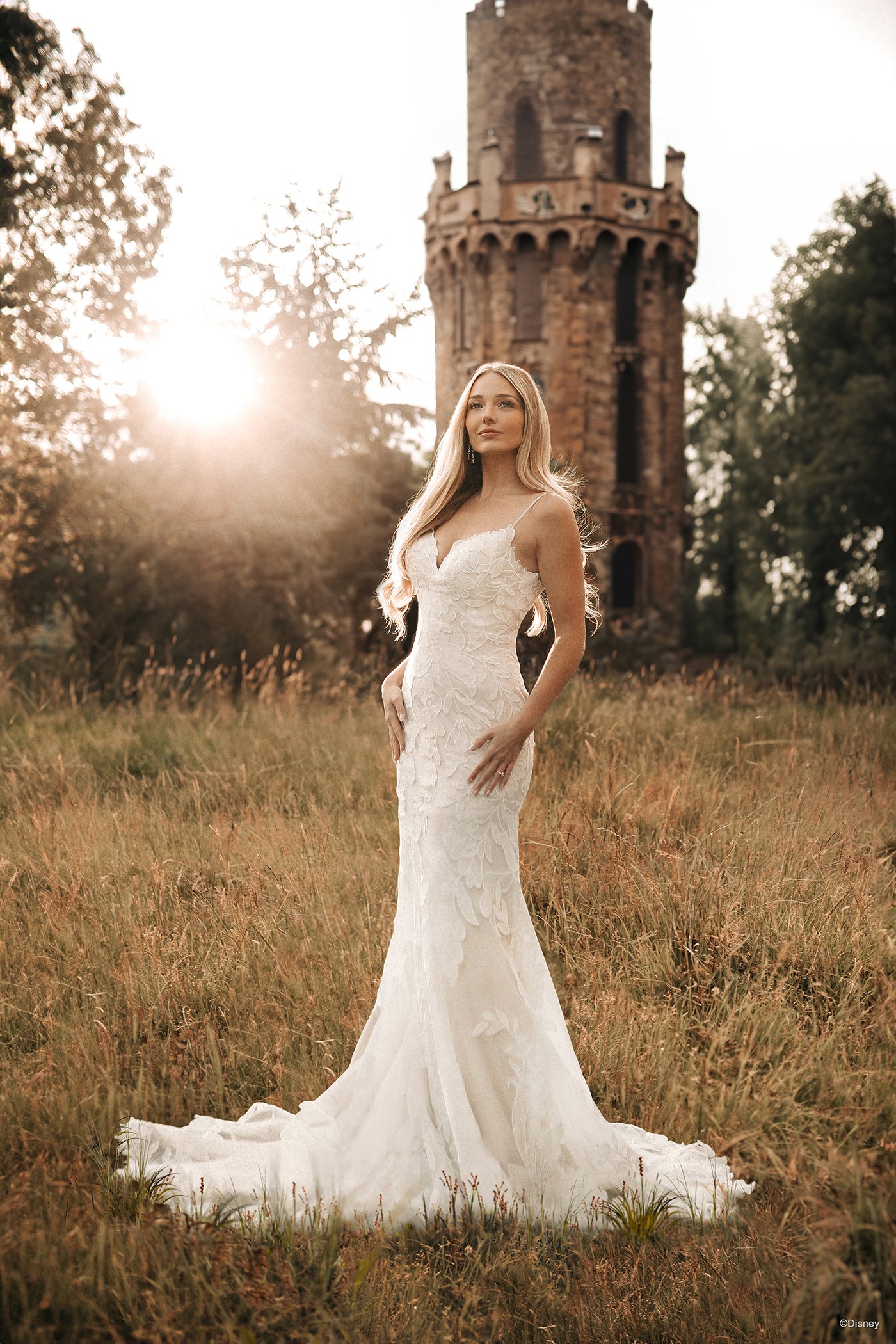 Unfurling, oversized lacy blooms, representative of the Princess's passionate curiosity and love of beauty, adorn the sheath silhouette of our Disney's Rapunzel Platinum gown. Swirls of satiny Mikado wrap the arms and define the train of this stunning gown. This Disney Fairy Tale Weddings DP406 gown is also available with detachable cape DP406CP sold separately. Shop both gown and detachable cape when you search for your local Disney Fairy Tale Weddings retailer today. Read Less