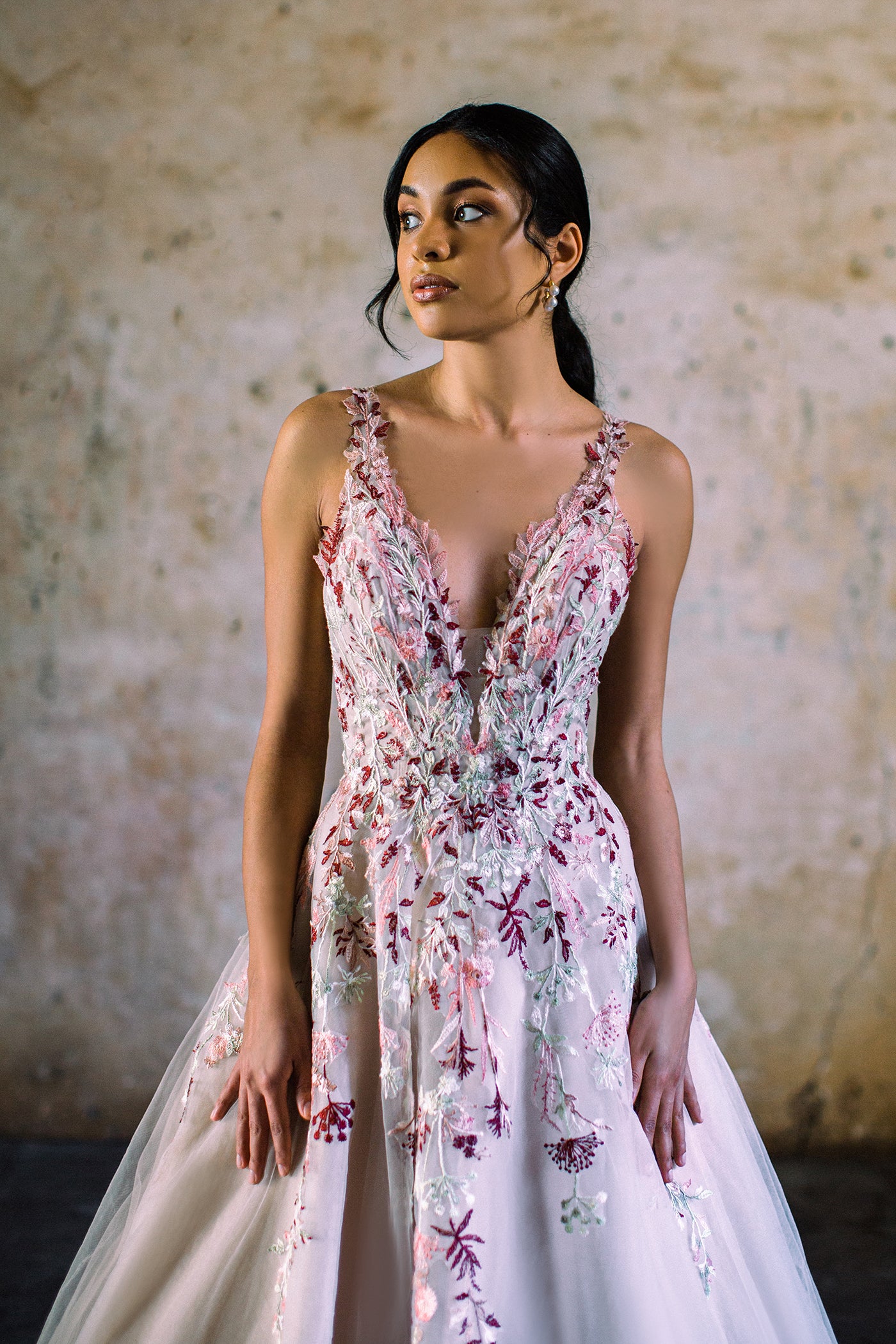 Reminiscent of a blossoming English garden, Trisha features a rainbow palette of embroidered florals across a delicate A-line tulle skirt.