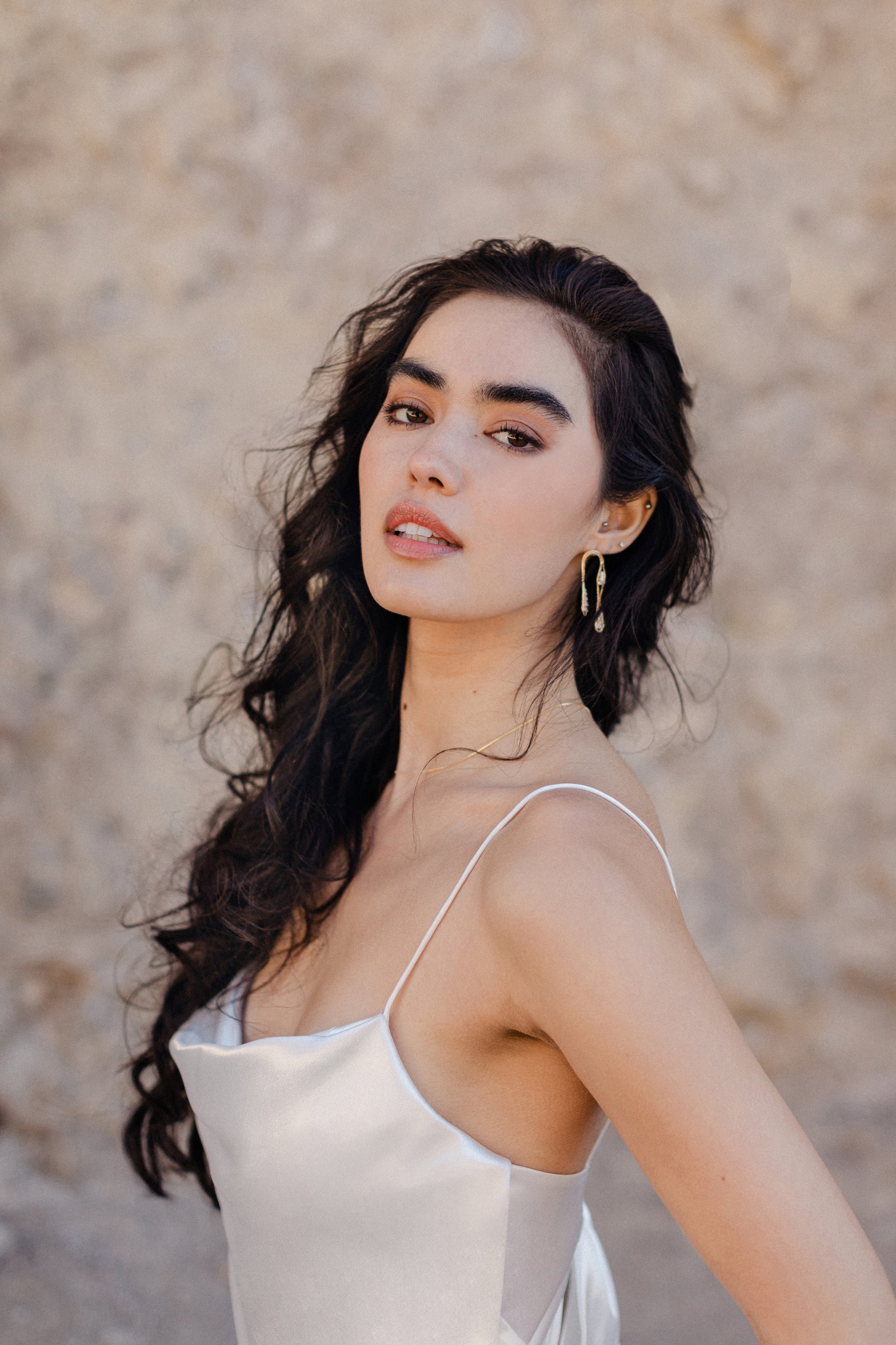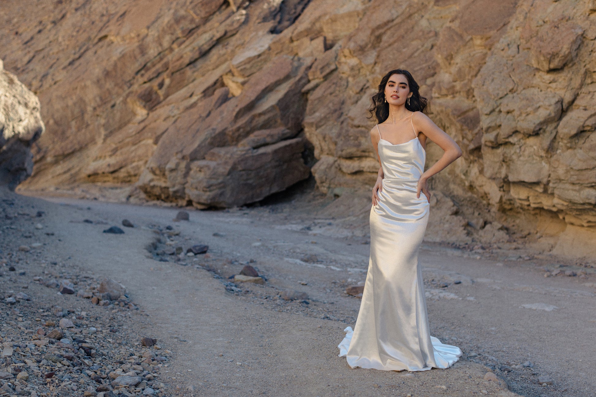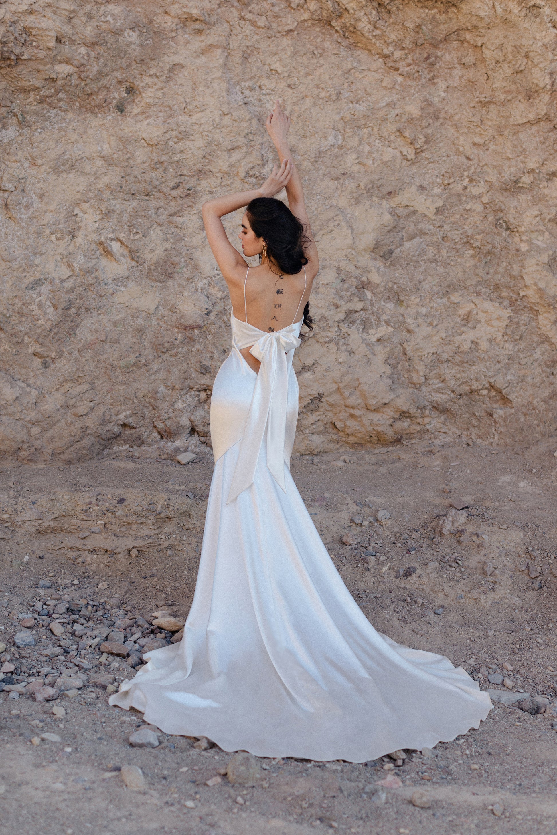 Sleek and unfussy, Buchanan is crafted from liquid satin that drapes like a dream. A scoop neckline and delicate spaghetti straps keep the look pared-back and clean, while a feminine bow detail at the waist adds just the right amount of charm. The soft, sweep train trails behind with quiet grace—perfect for the bride who believes less truly is more. Please note: This style does not allow for custom changes. This style is also available in a matte crepe fabrication, as Style F382ANC. Read Less